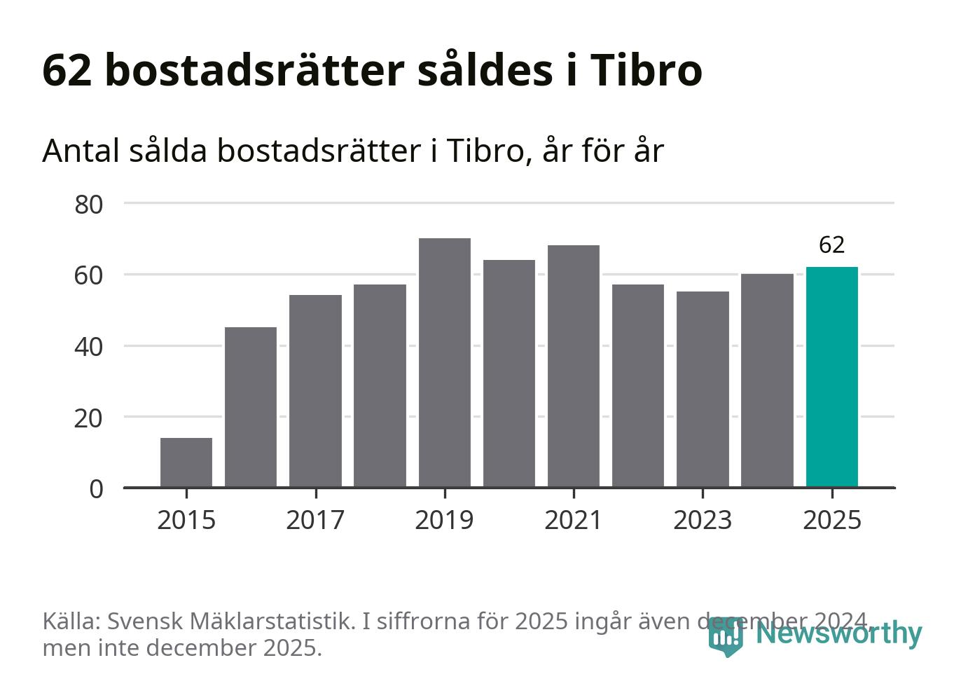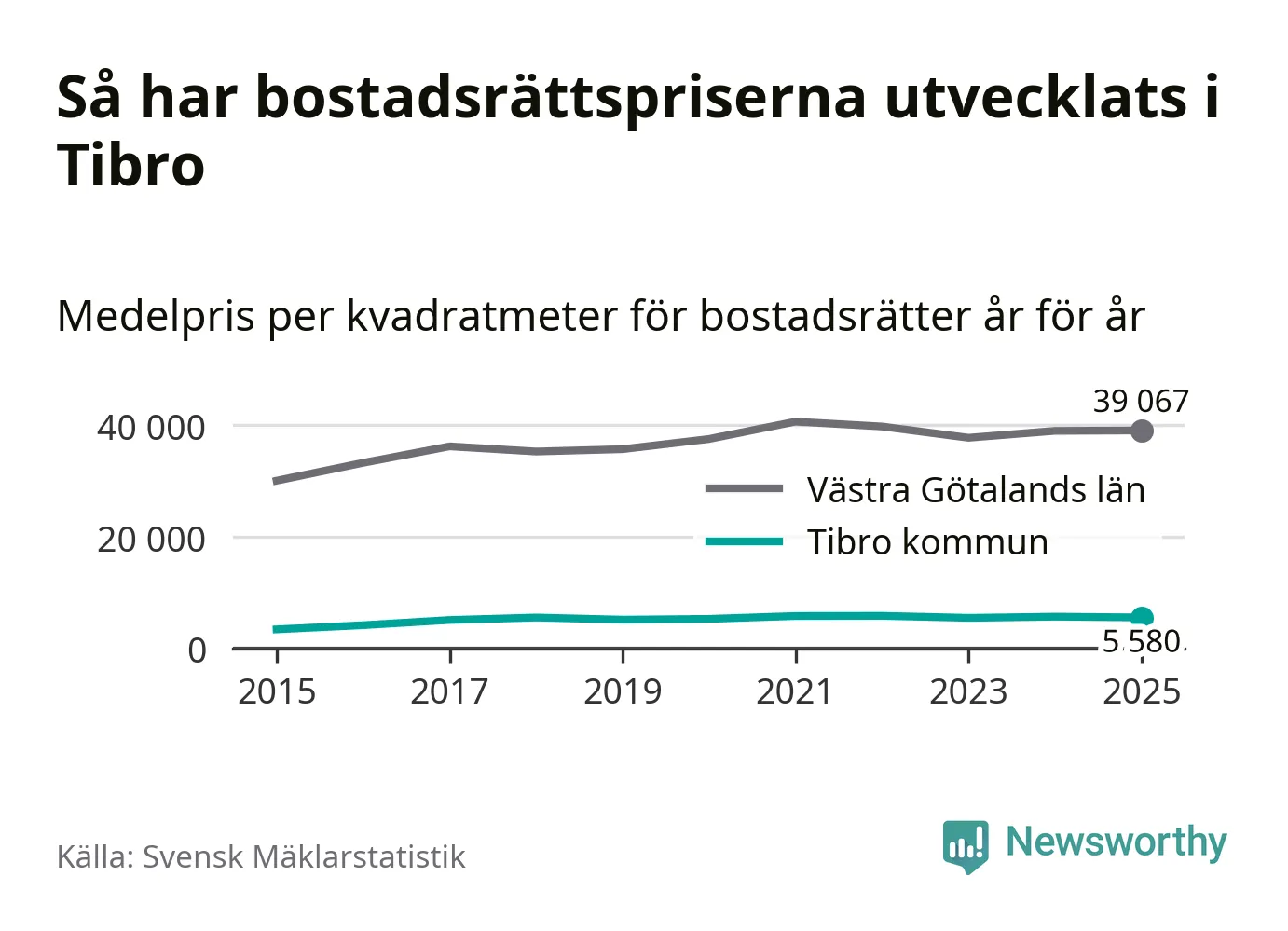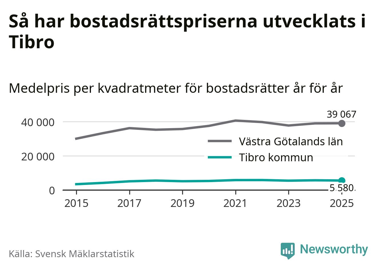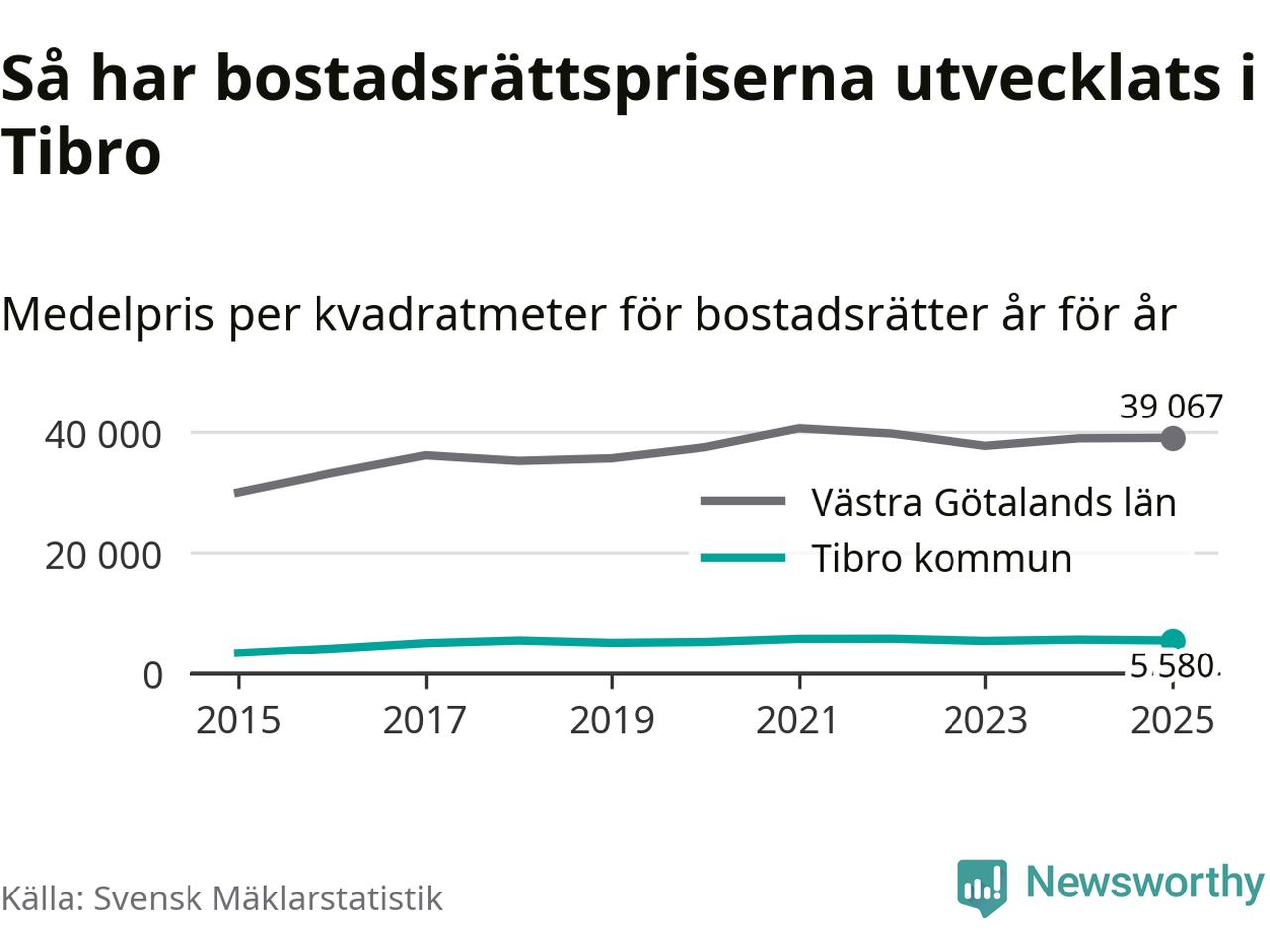 Det såldes totalt 62 bostadsrätter i Tibro kommun under året. Genomsnittspriset per kvadratmeter landade på 5 580 kronor. Det är en minskning med två procent i kommunen på ett år.