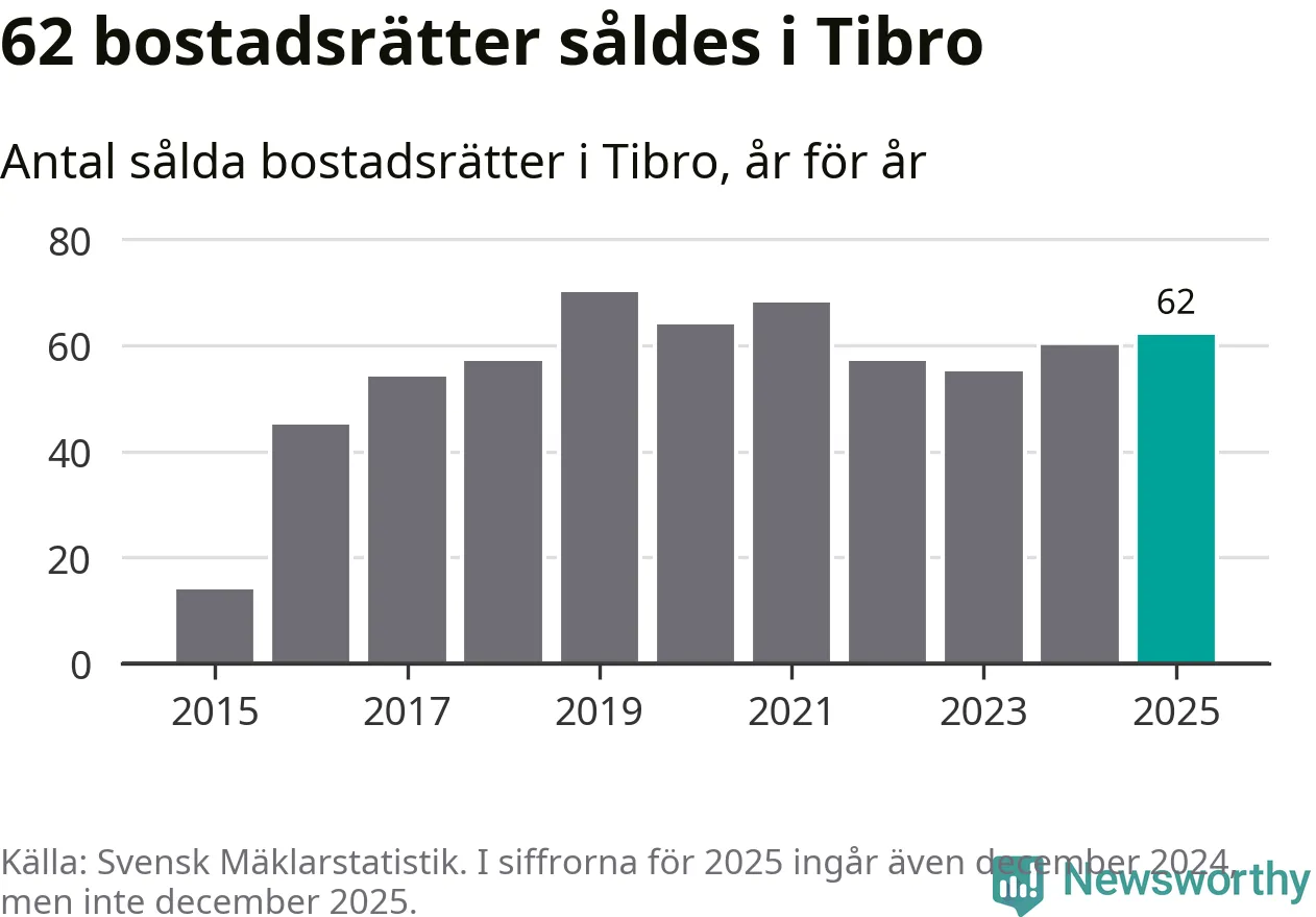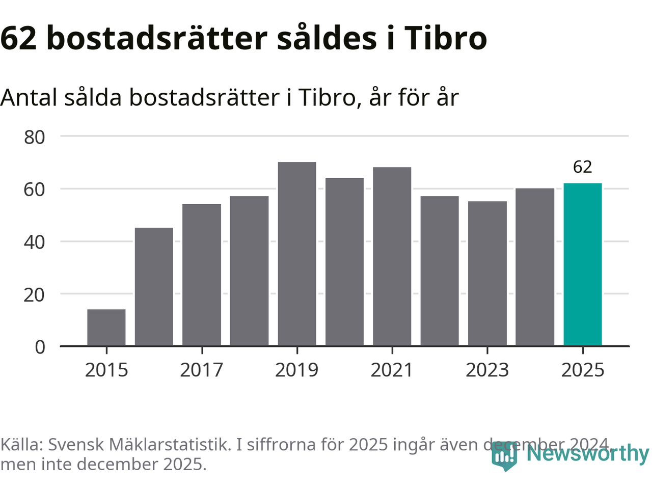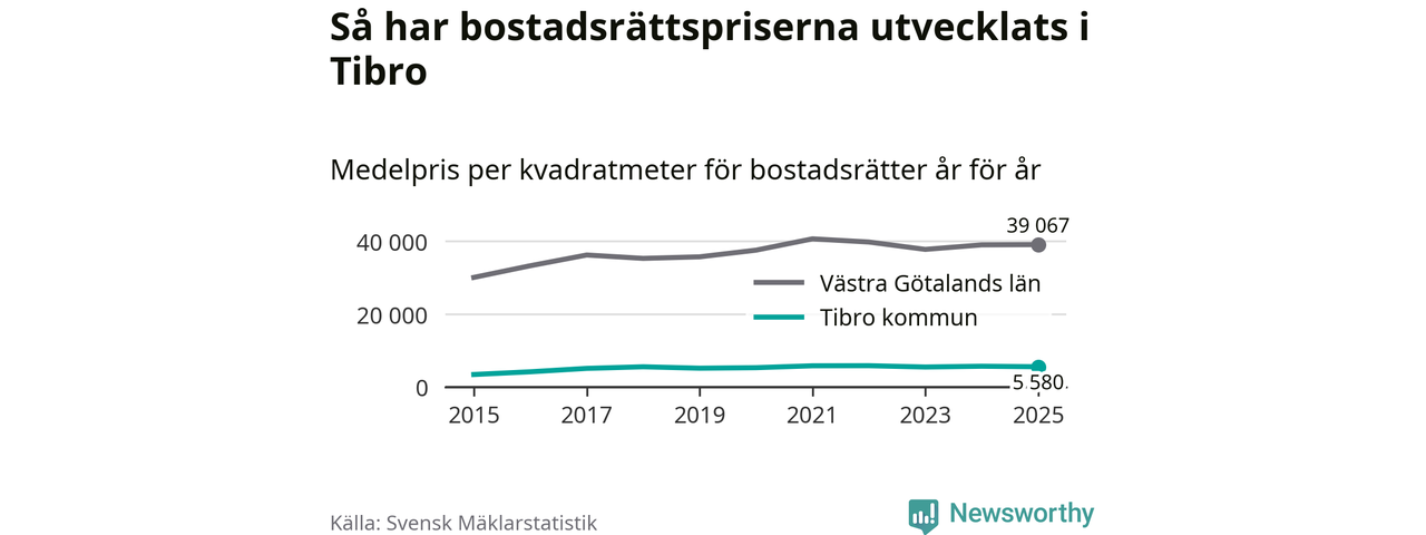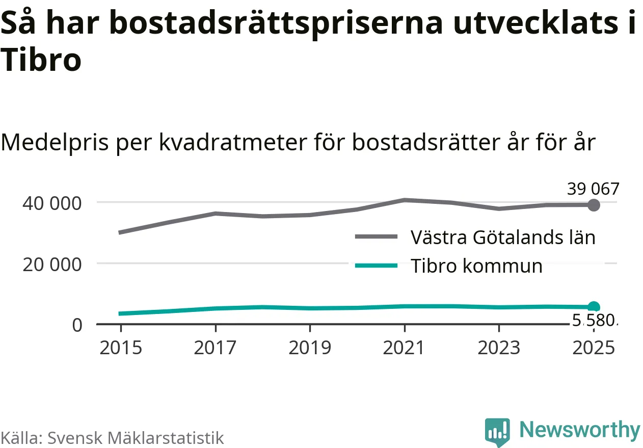 Det såldes totalt 62 bostadsrätter i Tibro kommun under året. Genomsnittspriset per kvadratmeter landade på 5 580 kronor. Det är en minskning med två procent i kommunen på ett år.