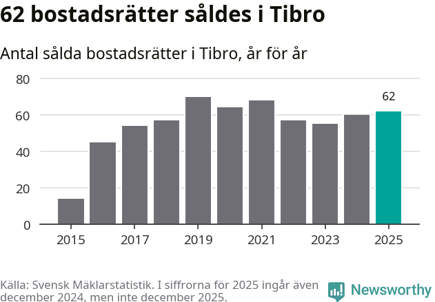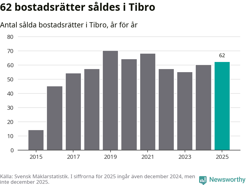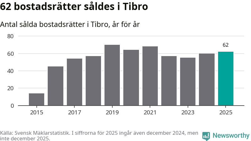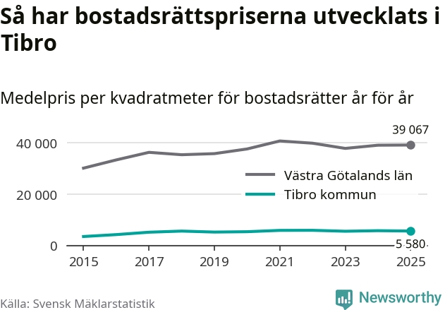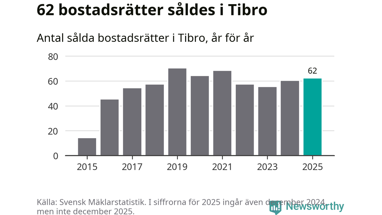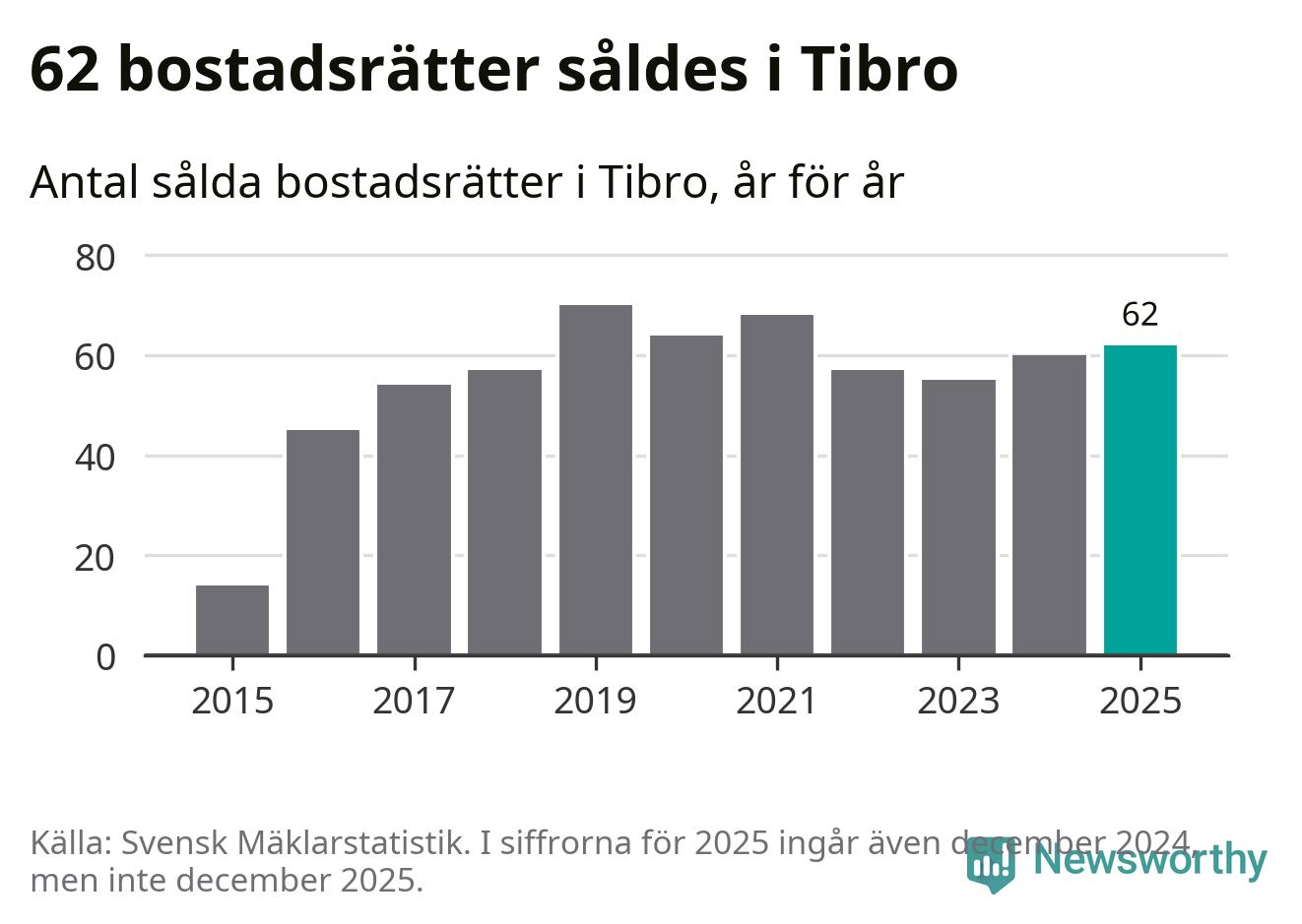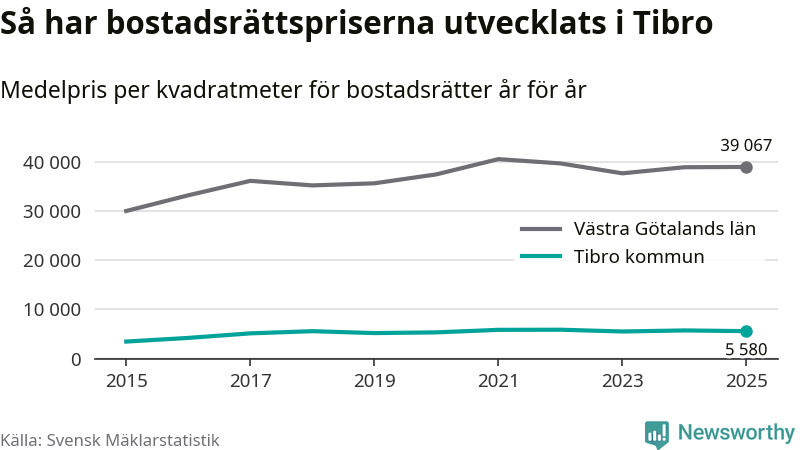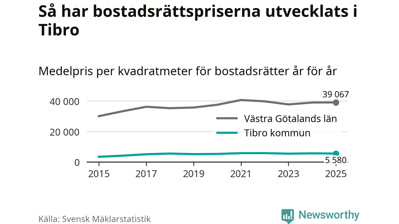 Det såldes totalt 62 bostadsrätter i Tibro kommun under året. Genomsnittspriset per kvadratmeter landade på 5 580 kronor. Det är en minskning med två procent i kommunen på ett år.