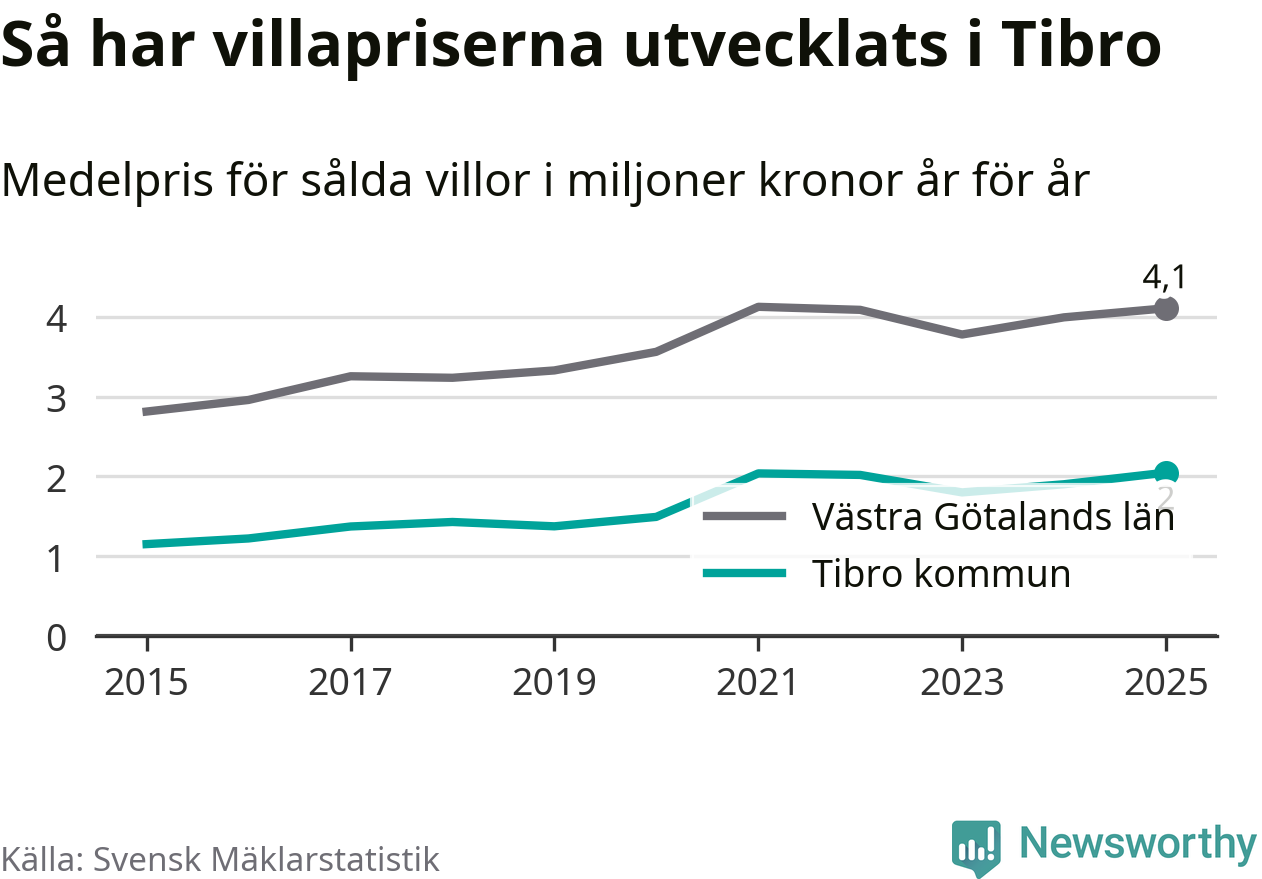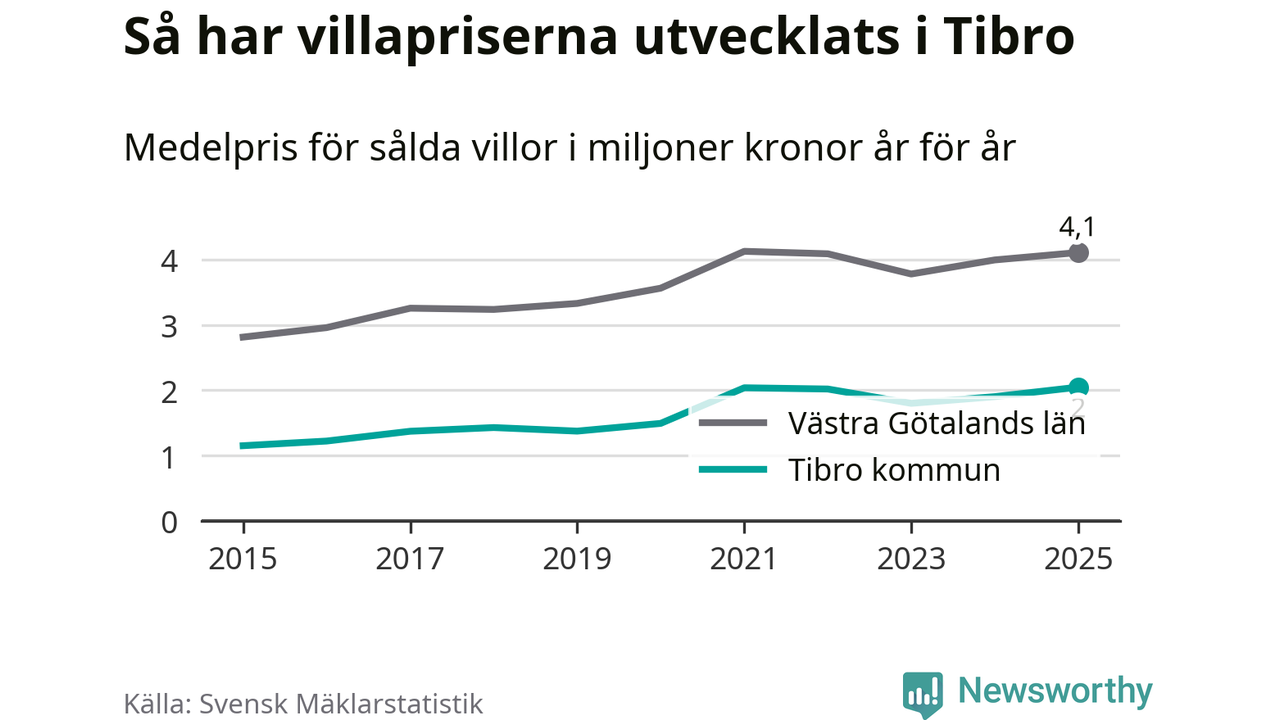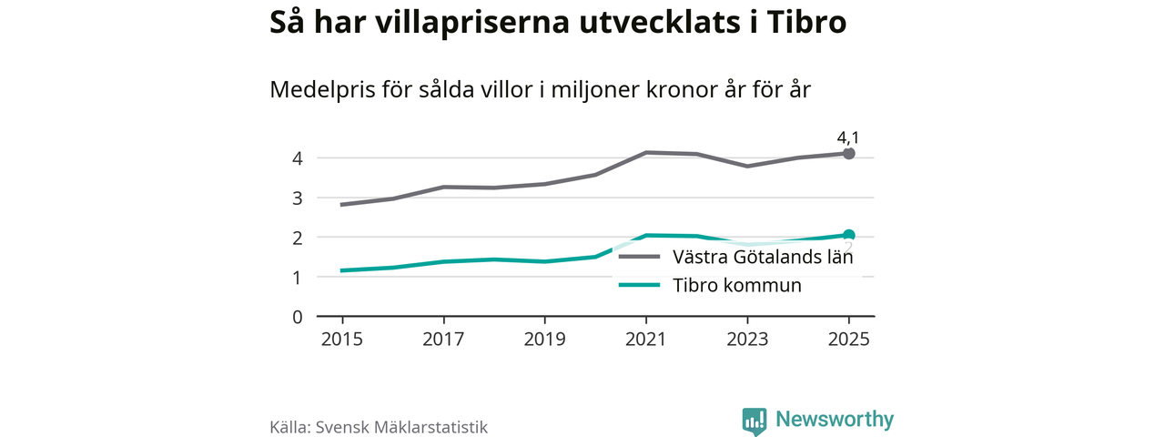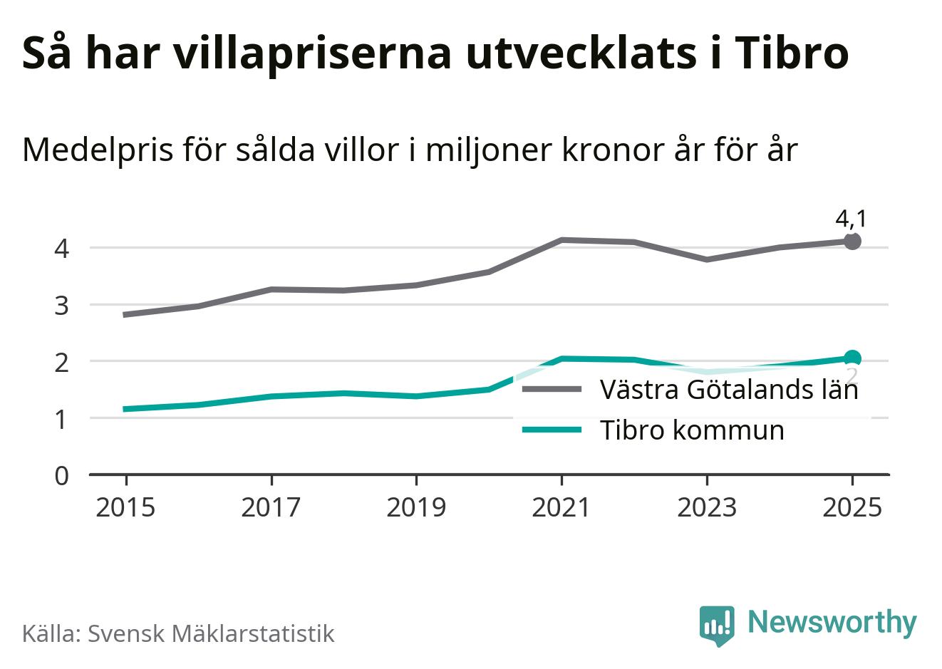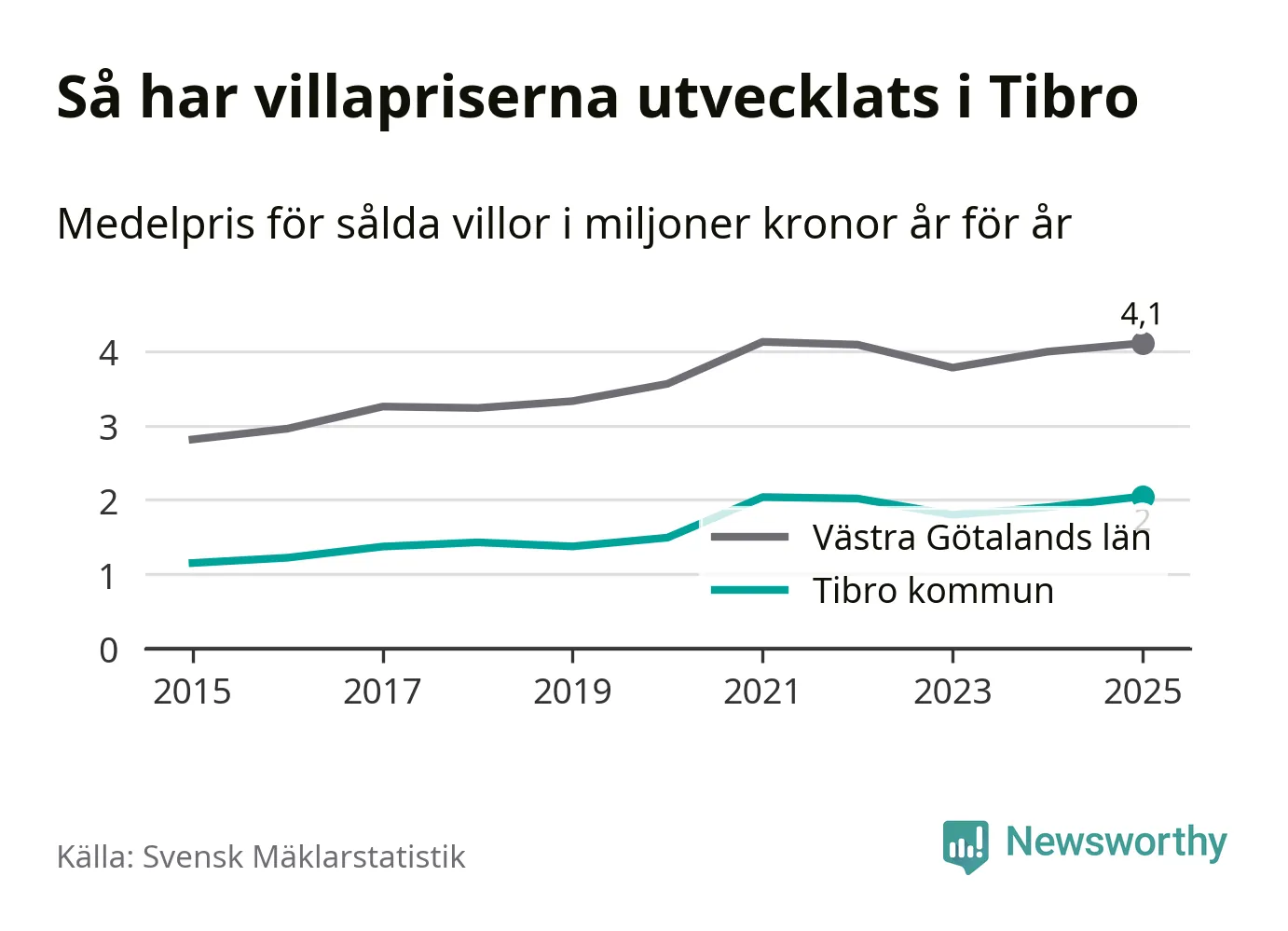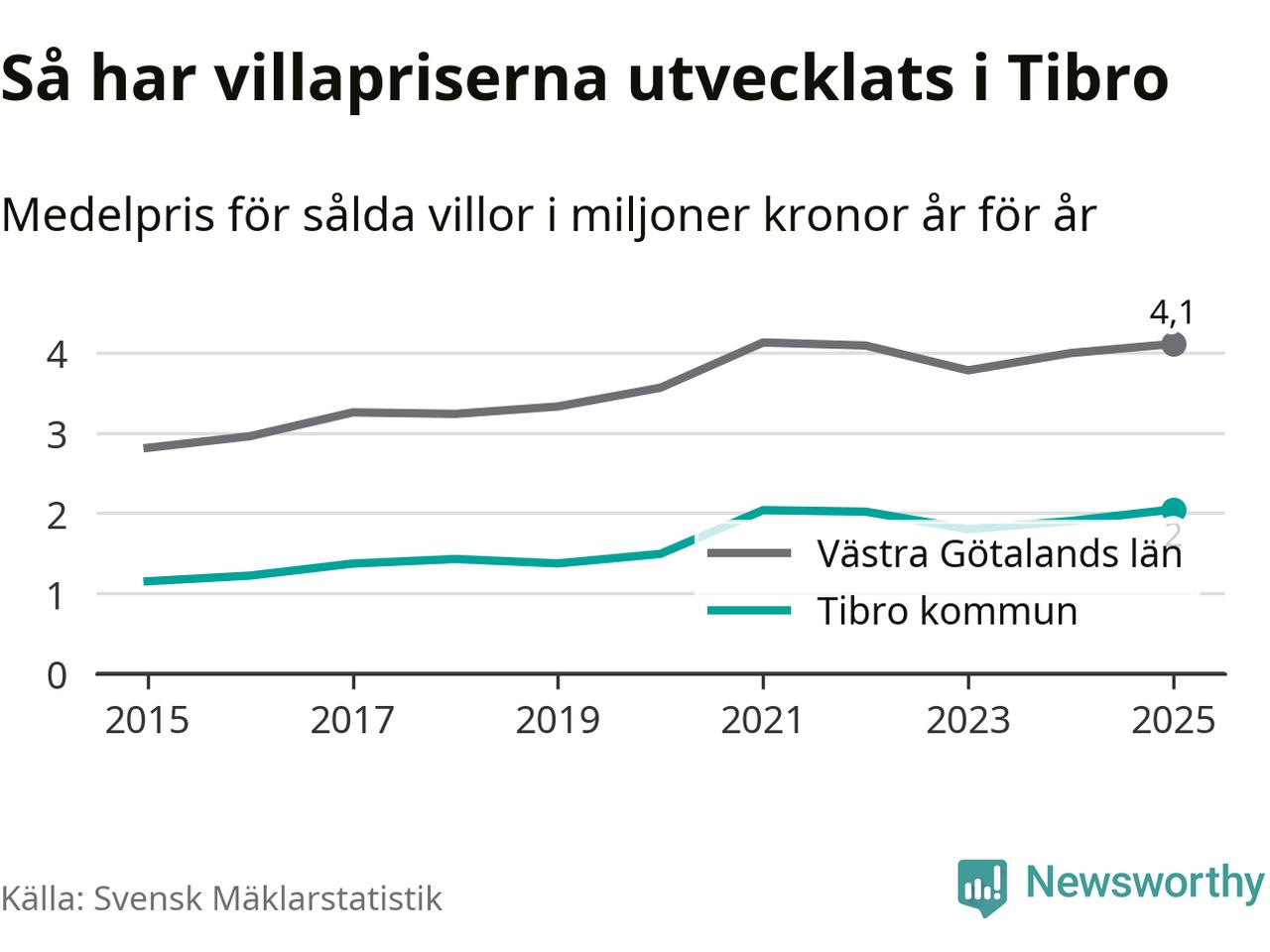 Två miljoner kronor är medelpriset för de villor som såldes i Tibro kommun under året, eller 16 886 kronor per kvadratmeter. Det innebär en prisökning med åtta procent på ett år. Det är det högsta årssnittet på åtminstone tio år. Bryter man upp siffrorna per kvartal har dock ännu högre villapriser noterats i Tibro hösten 2022.