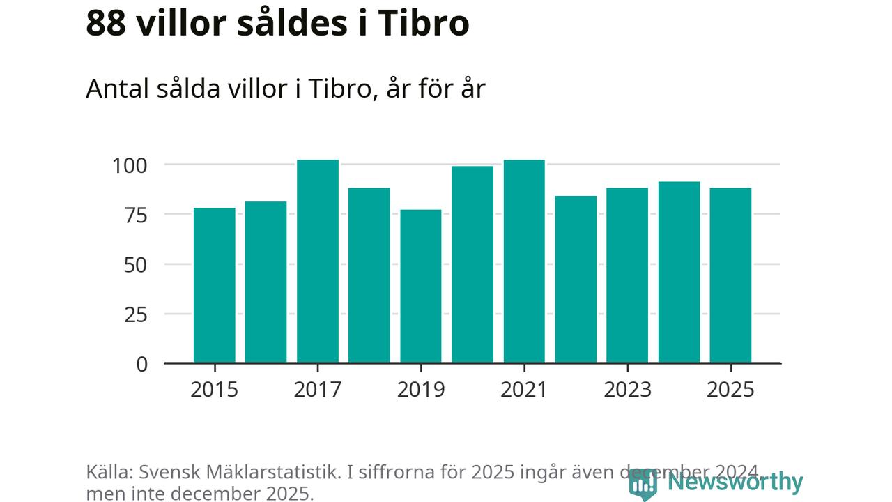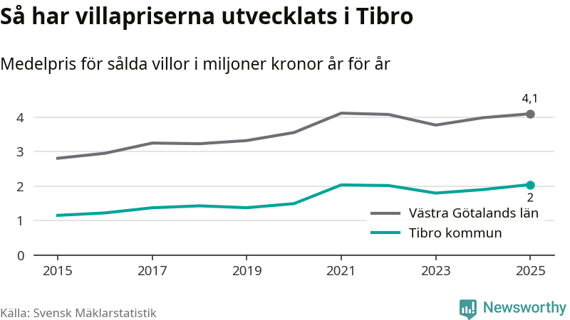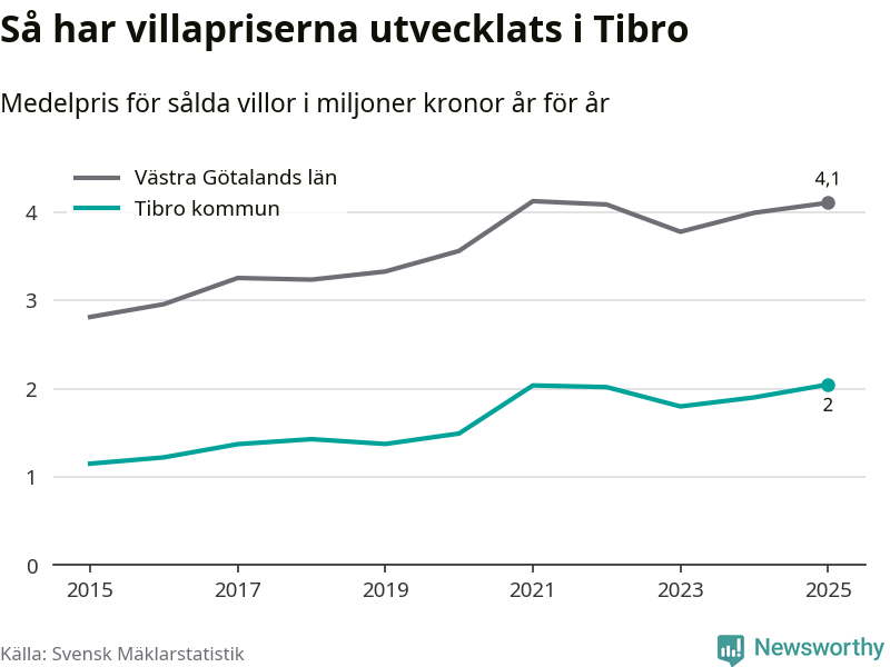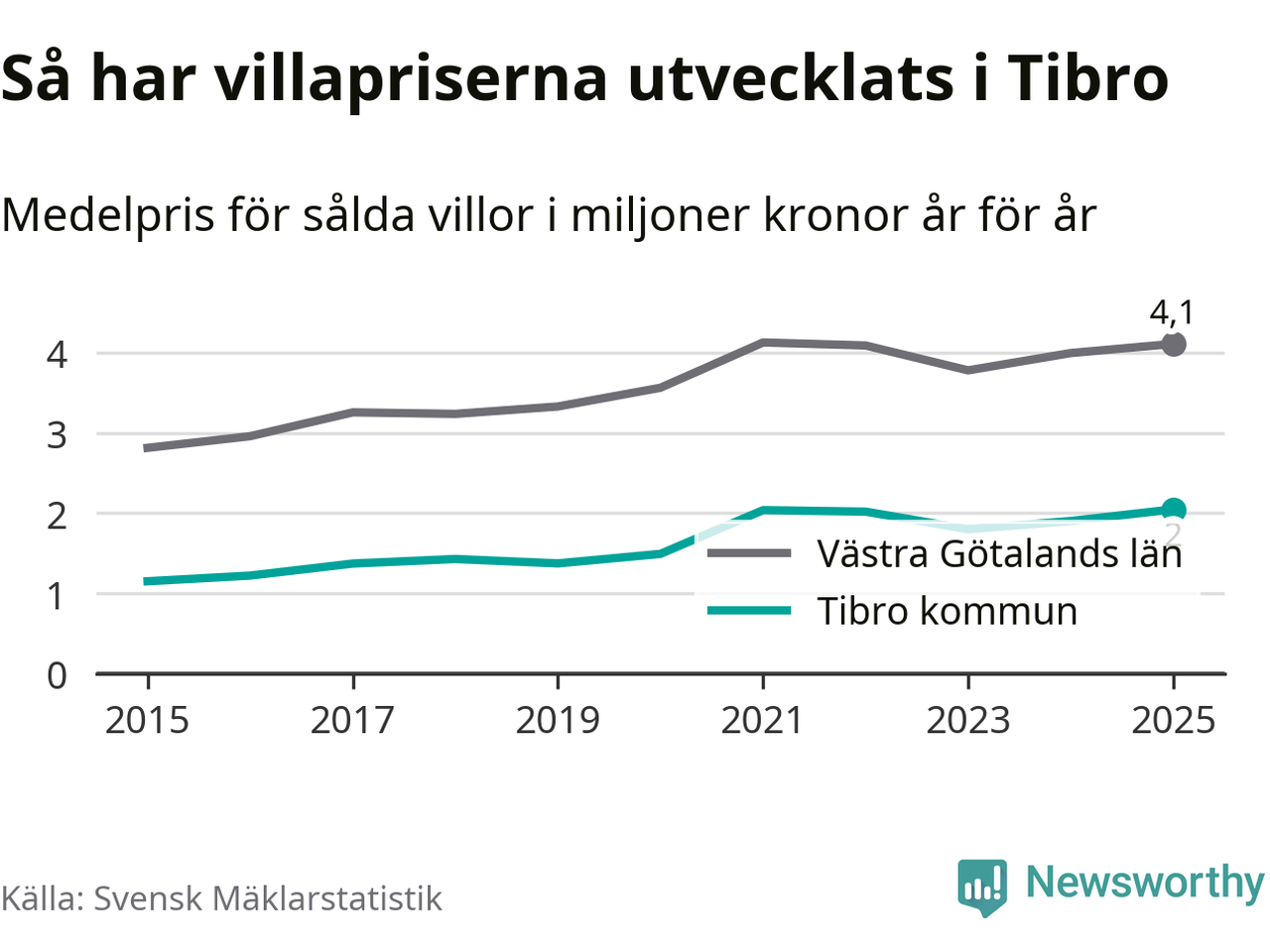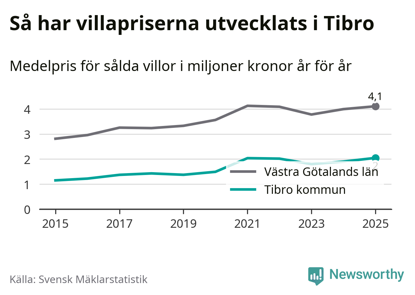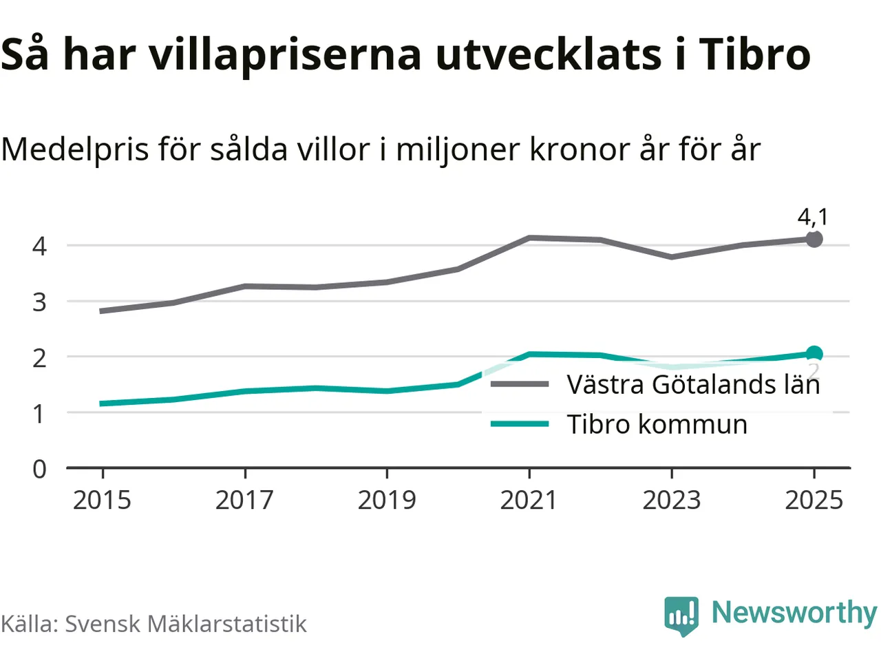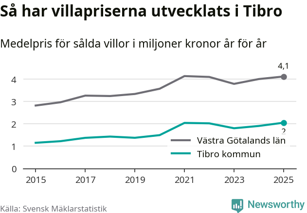 Två miljoner kronor är medelpriset för de villor som såldes i Tibro kommun under året, eller 16 886 kronor per kvadratmeter. Det innebär en prisökning med åtta procent på ett år. Det är det högsta årssnittet på åtminstone tio år. Bryter man upp siffrorna per kvartal har dock ännu högre villapriser noterats i Tibro hösten 2022.