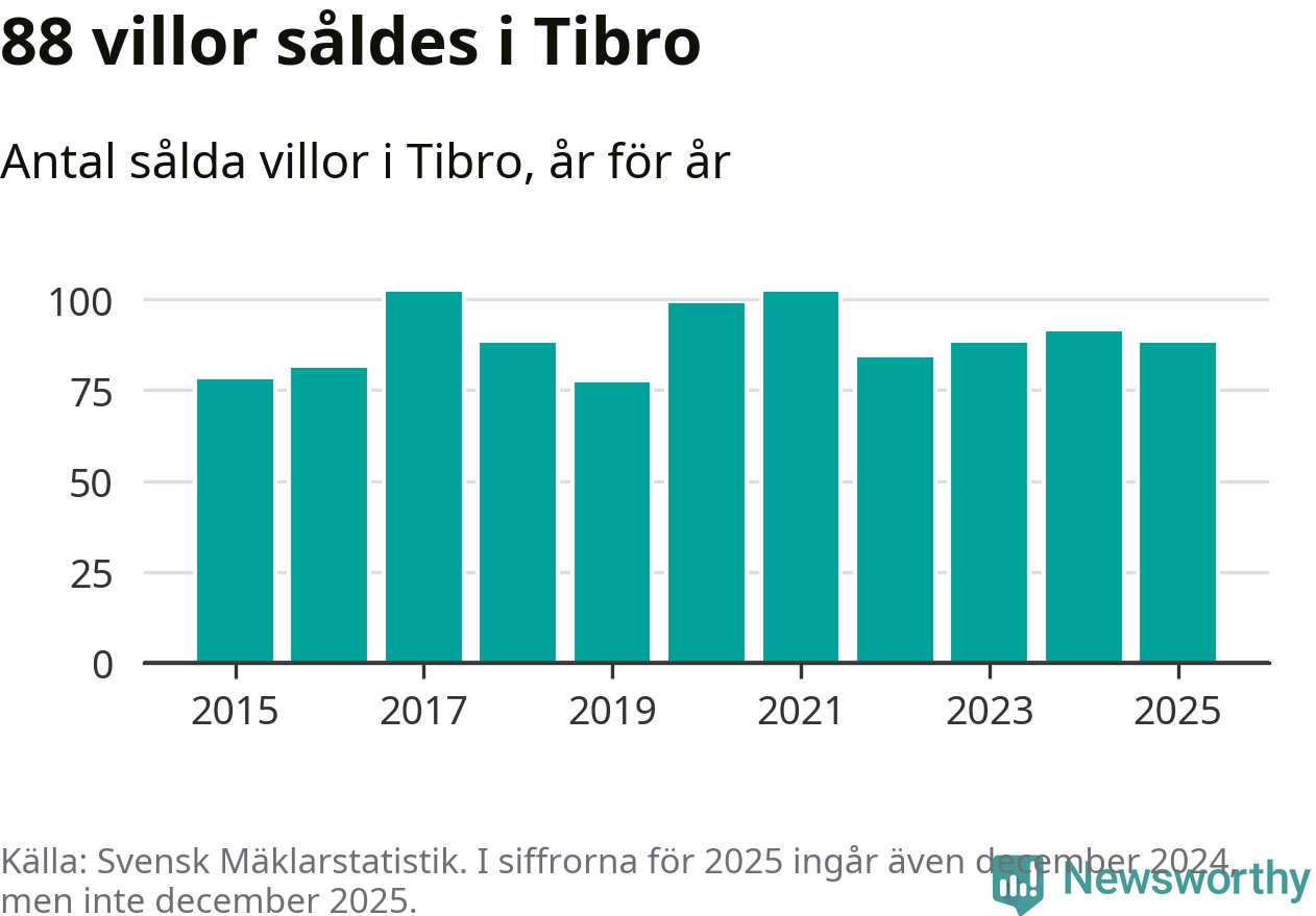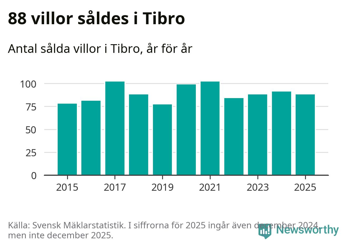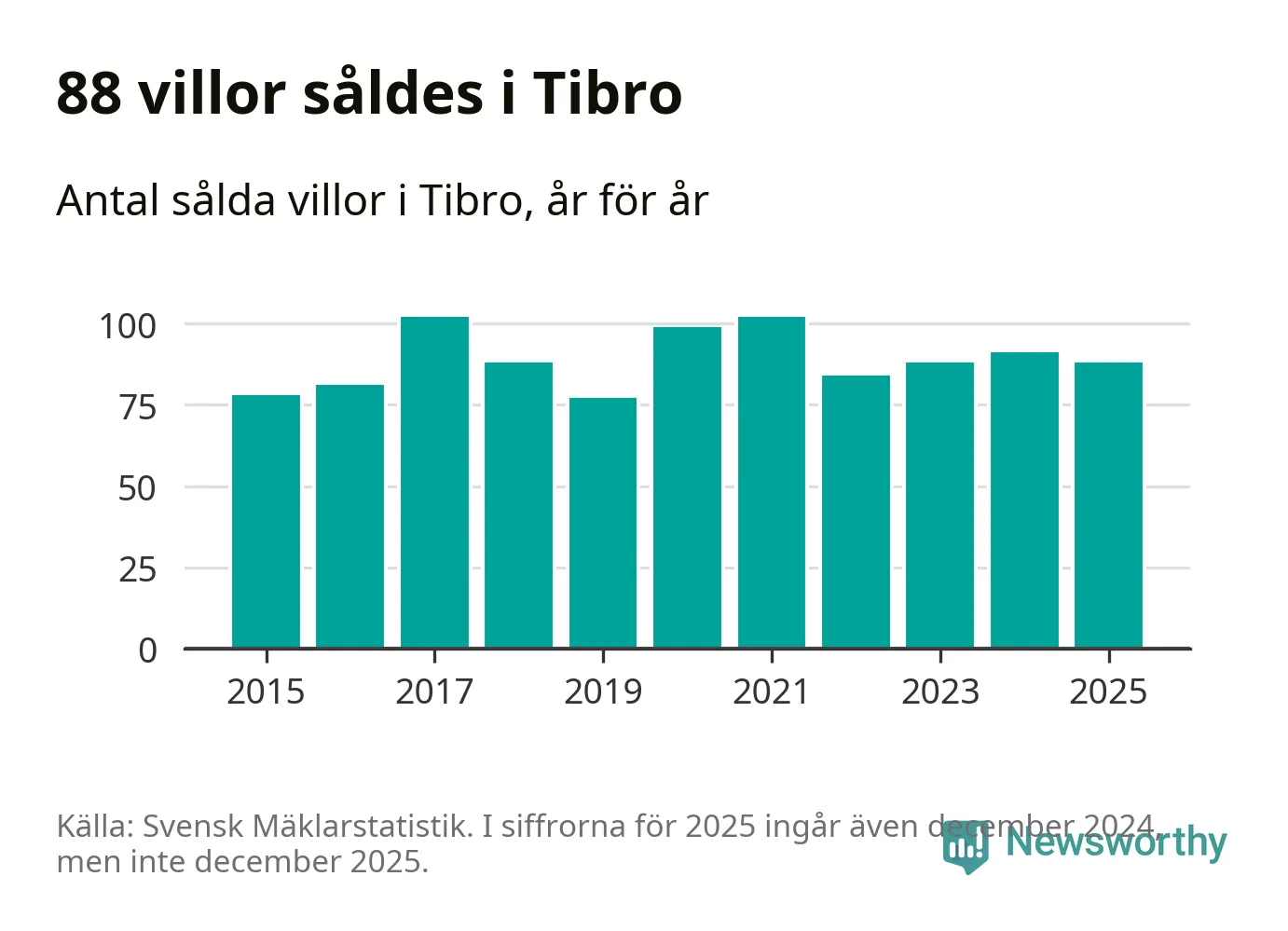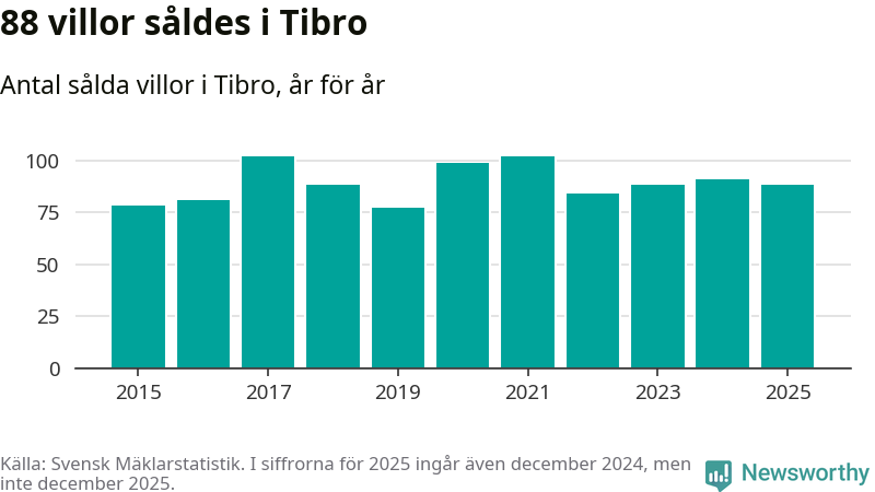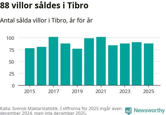 Däremot minskade antalet sålda villor något. Totalt såldes 88 villor, att jämföra med 91 under 2024.
