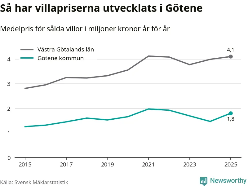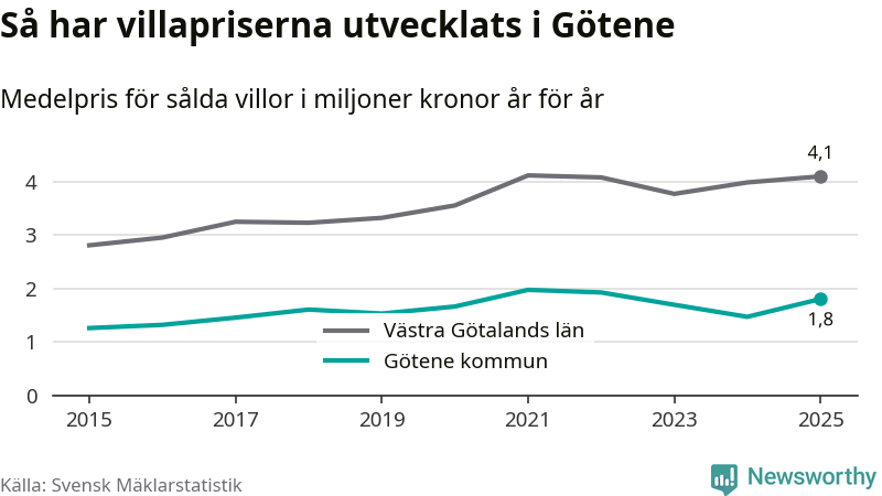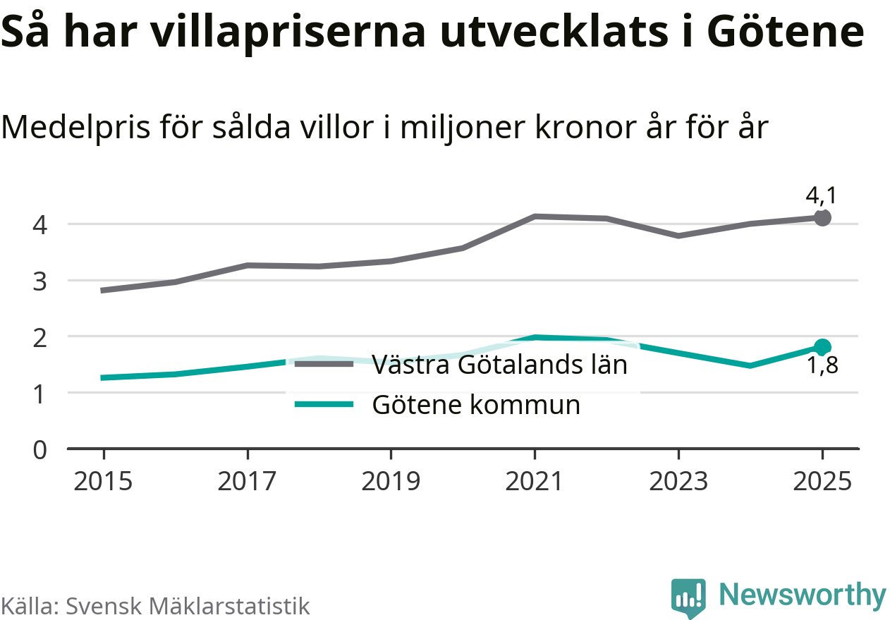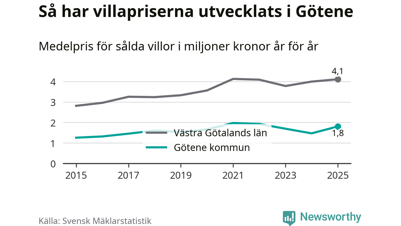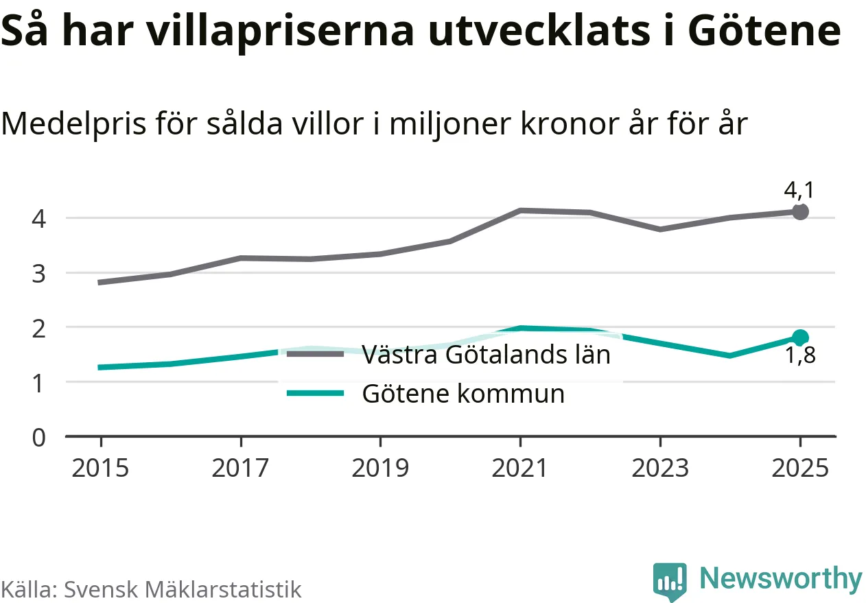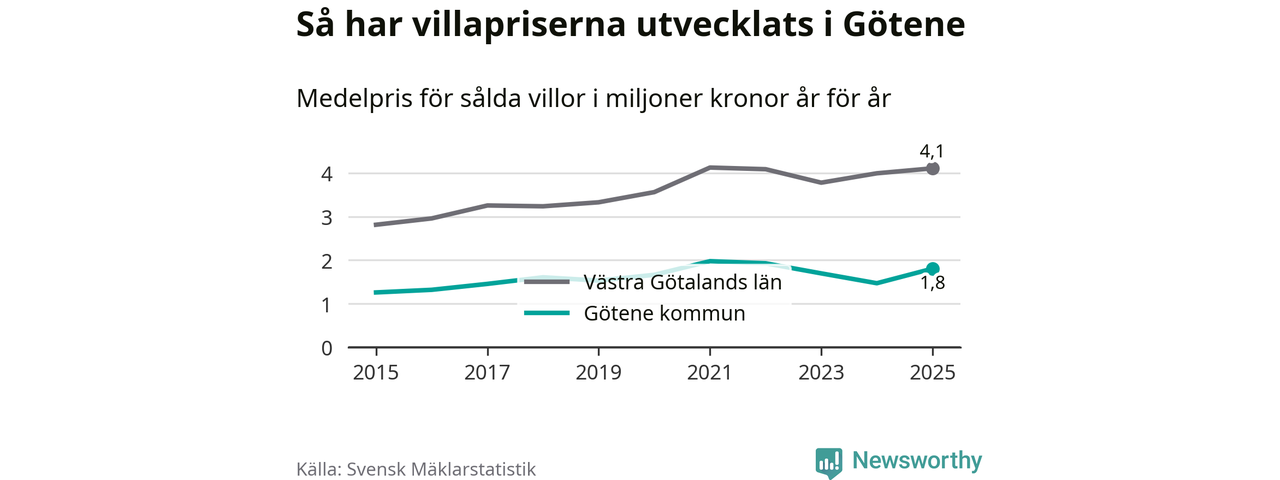 1,8 miljoner kronor är medelpriset för de villor som såldes i Götene kommun under året, eller 16 146 kronor per kvadratmeter. Det innebär en prisökning med 23 procent på ett år.