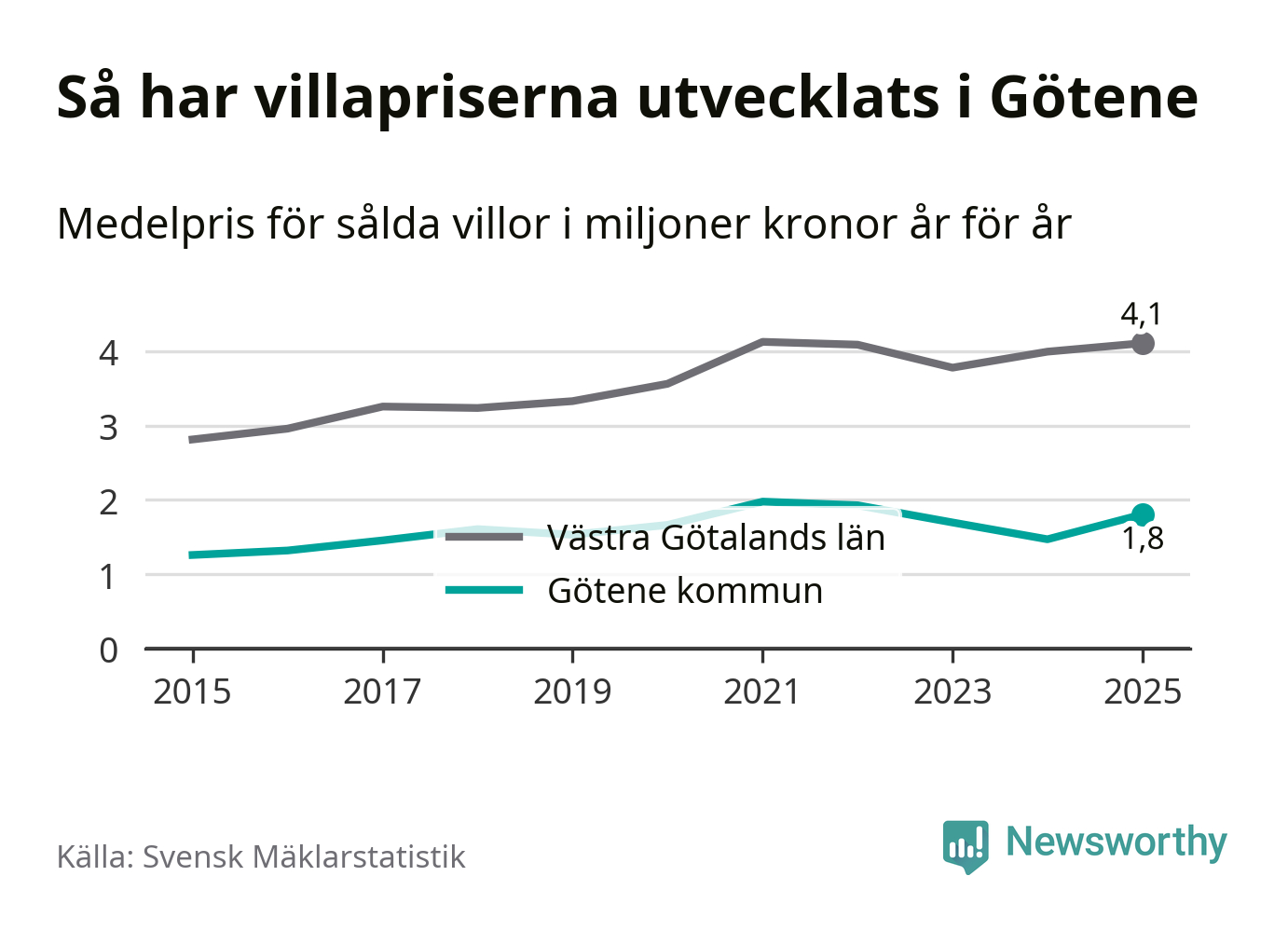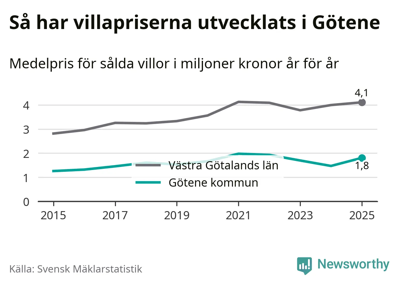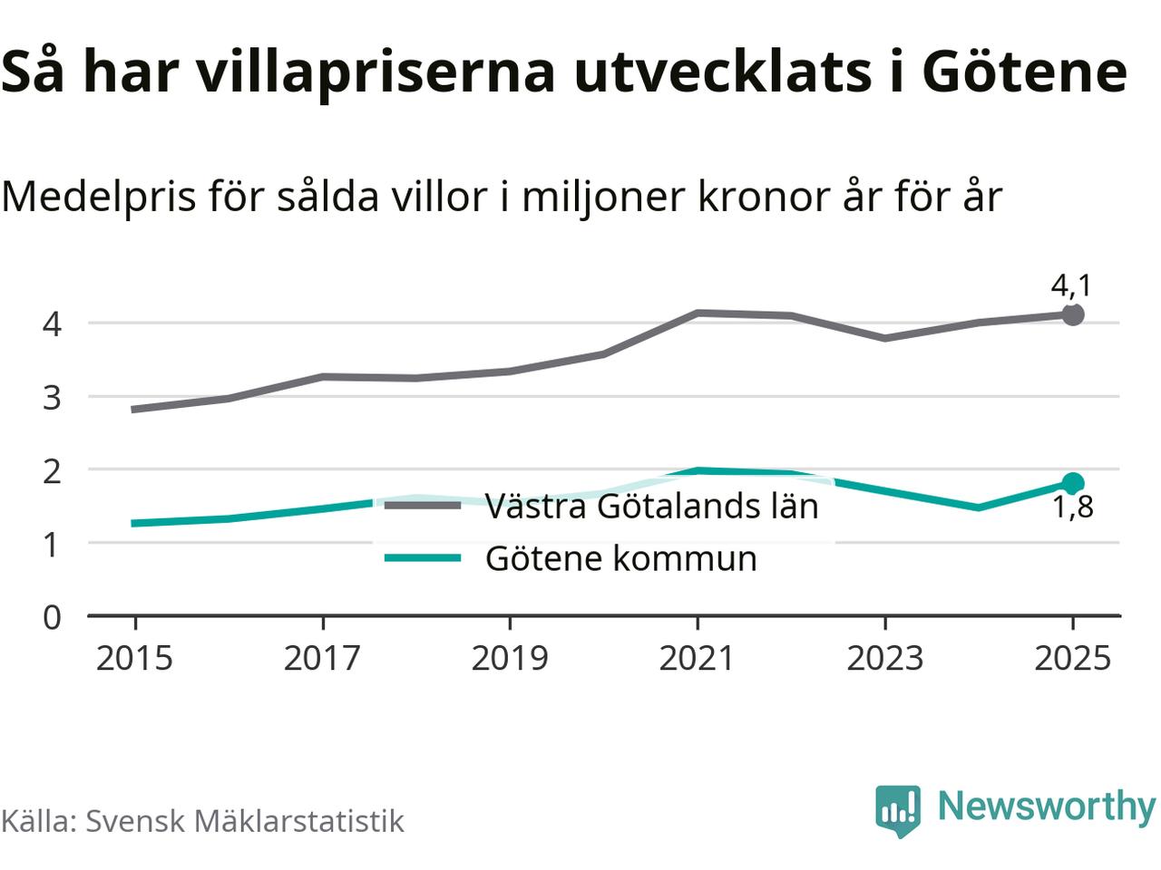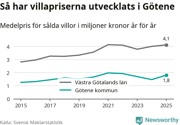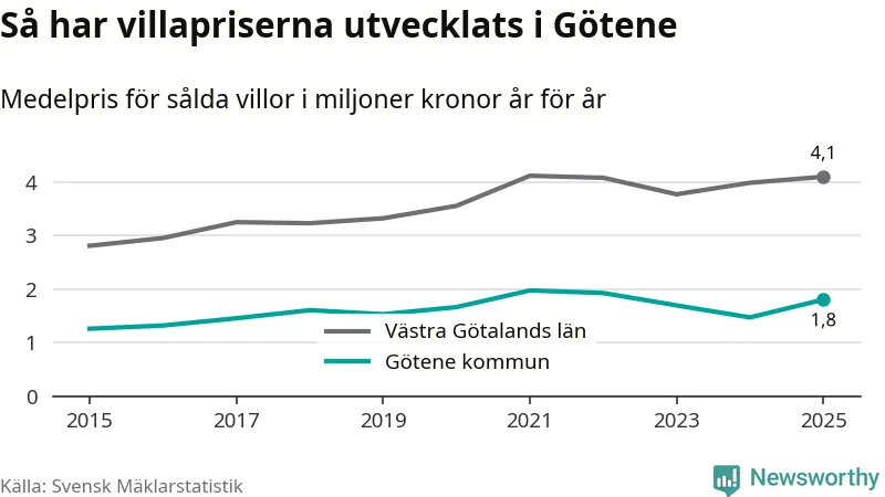 1,8 miljoner kronor är medelpriset för de villor som såldes i Götene kommun under året, eller 16 146 kronor per kvadratmeter. Det innebär en prisökning med 23 procent på ett år.