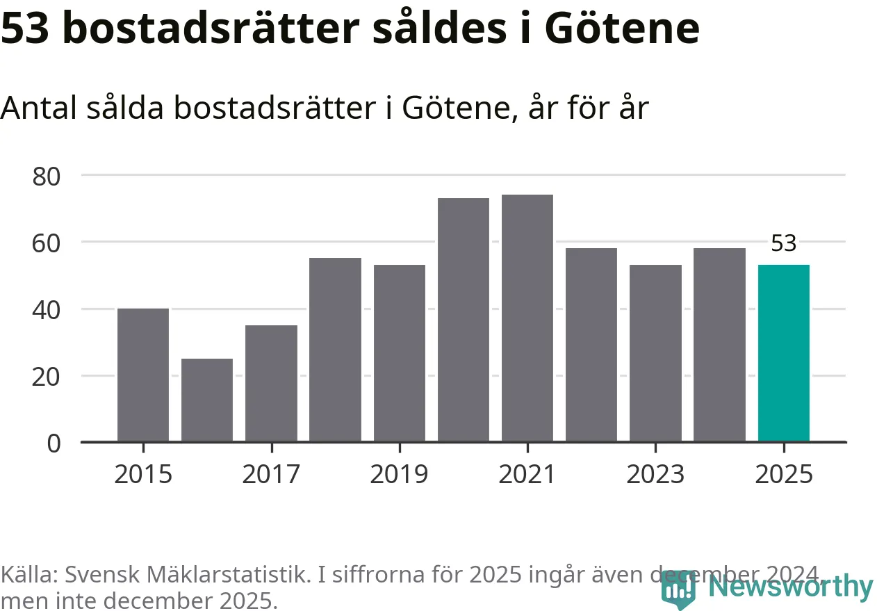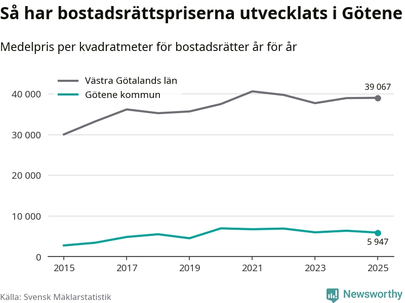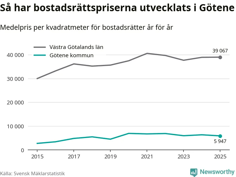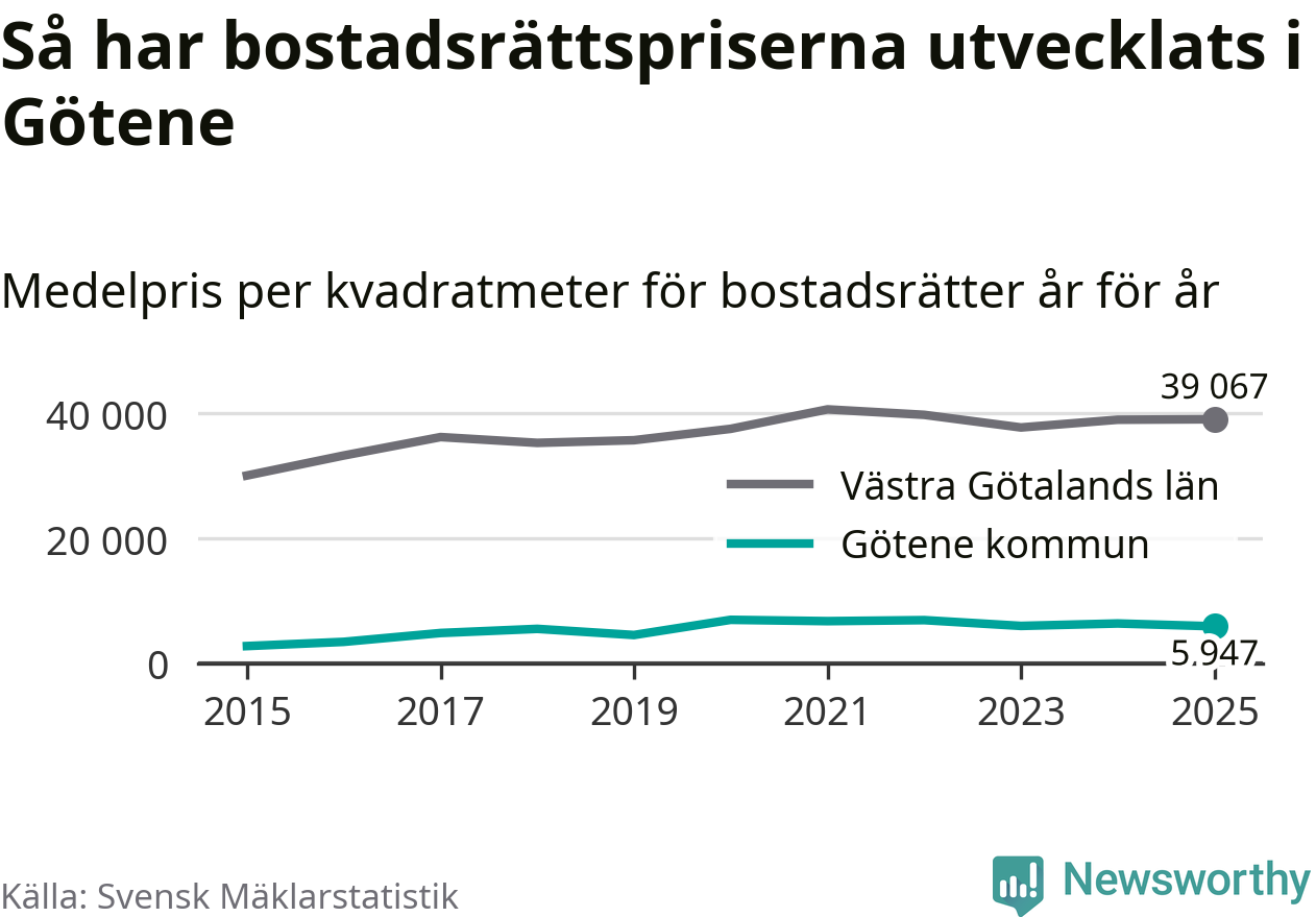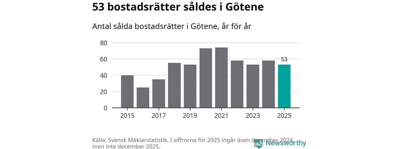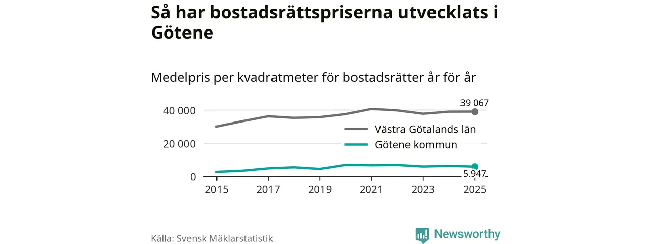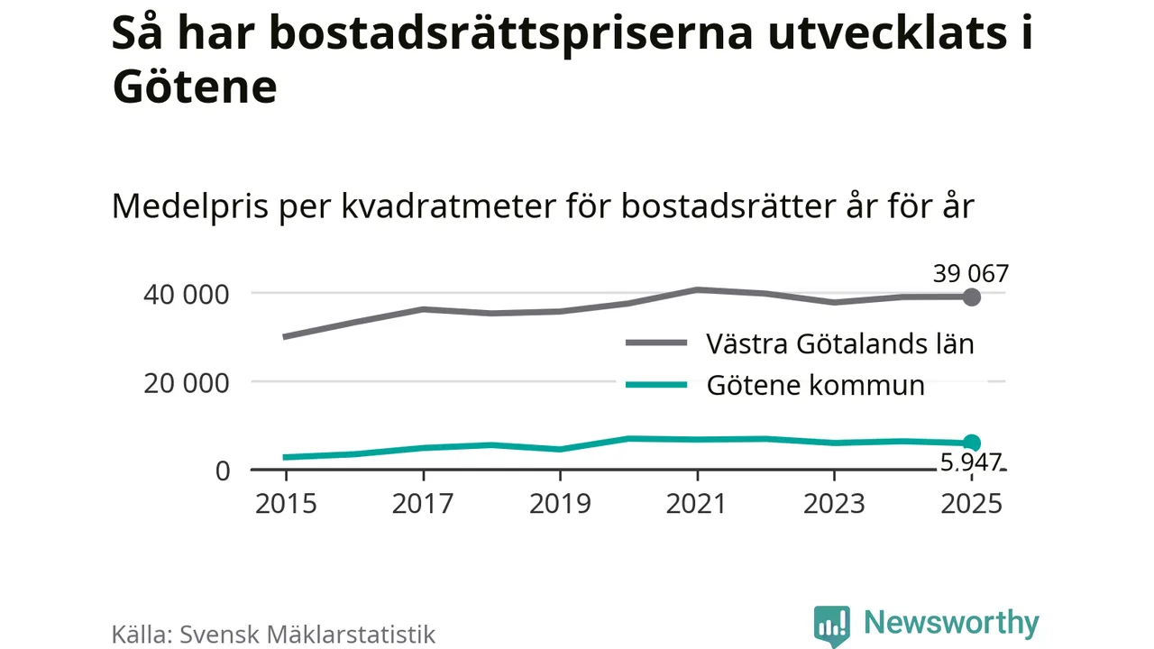 Det såldes totalt 53 bostadsrätter i Götene kommun under året. Genomsnittspriset per kvadratmeter landade på 5 947 kronor. Det är en minskning med sju procent i kommunen på ett år.