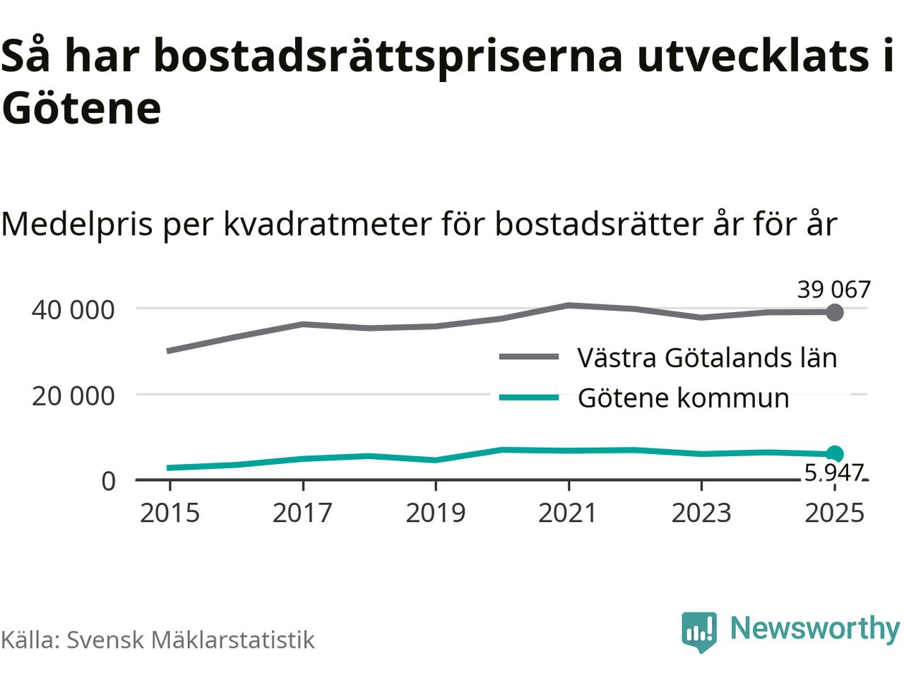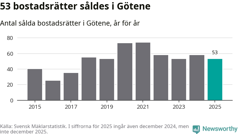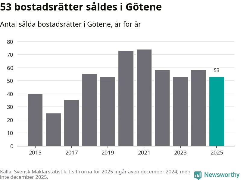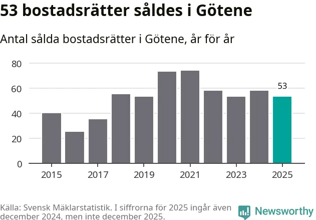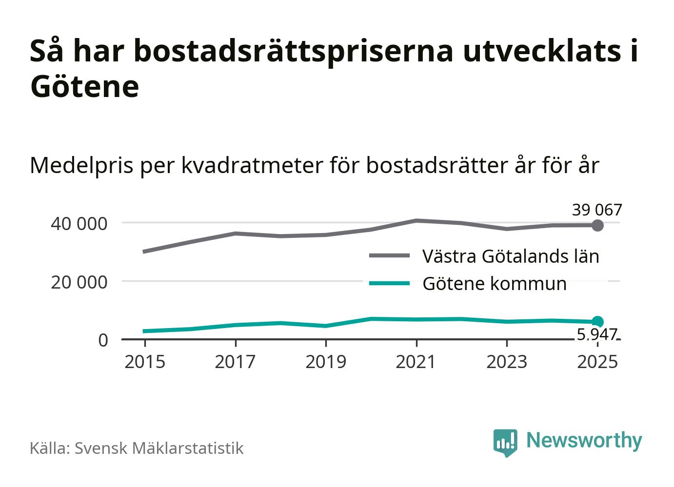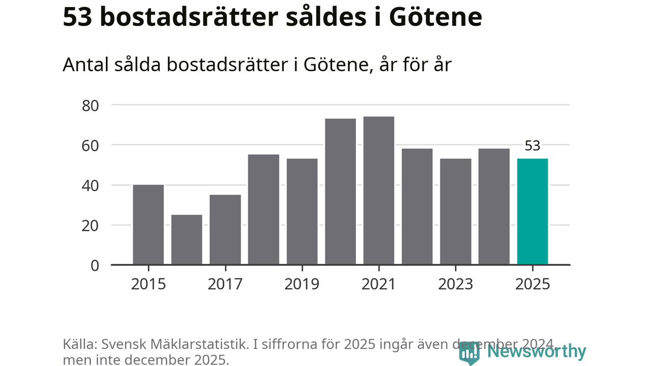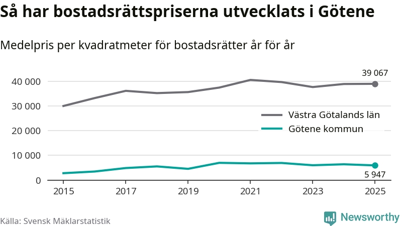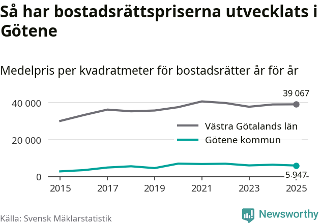 Det såldes totalt 53 bostadsrätter i Götene kommun under året. Genomsnittspriset per kvadratmeter landade på 5 947 kronor. Det är en minskning med sju procent i kommunen på ett år.