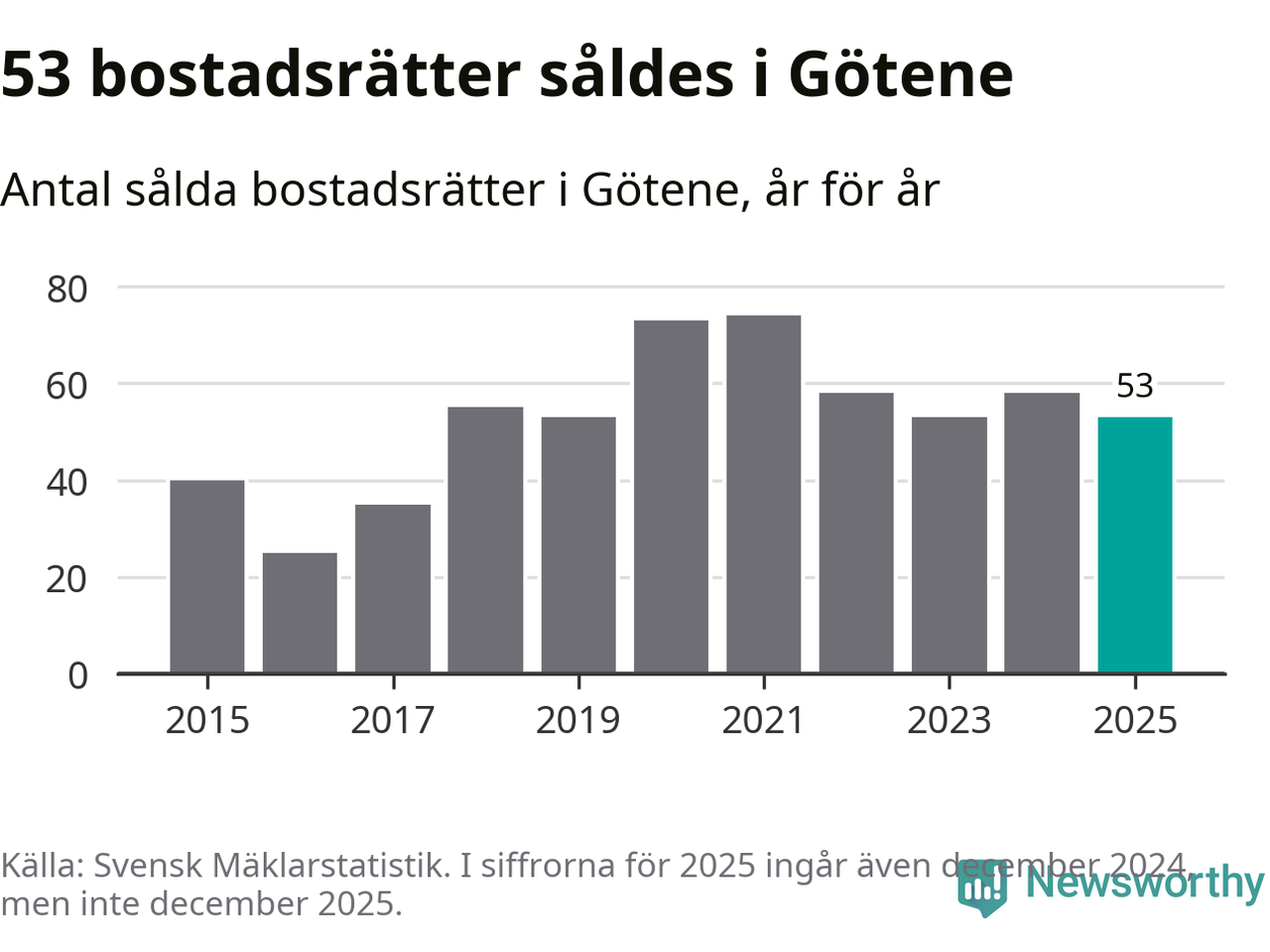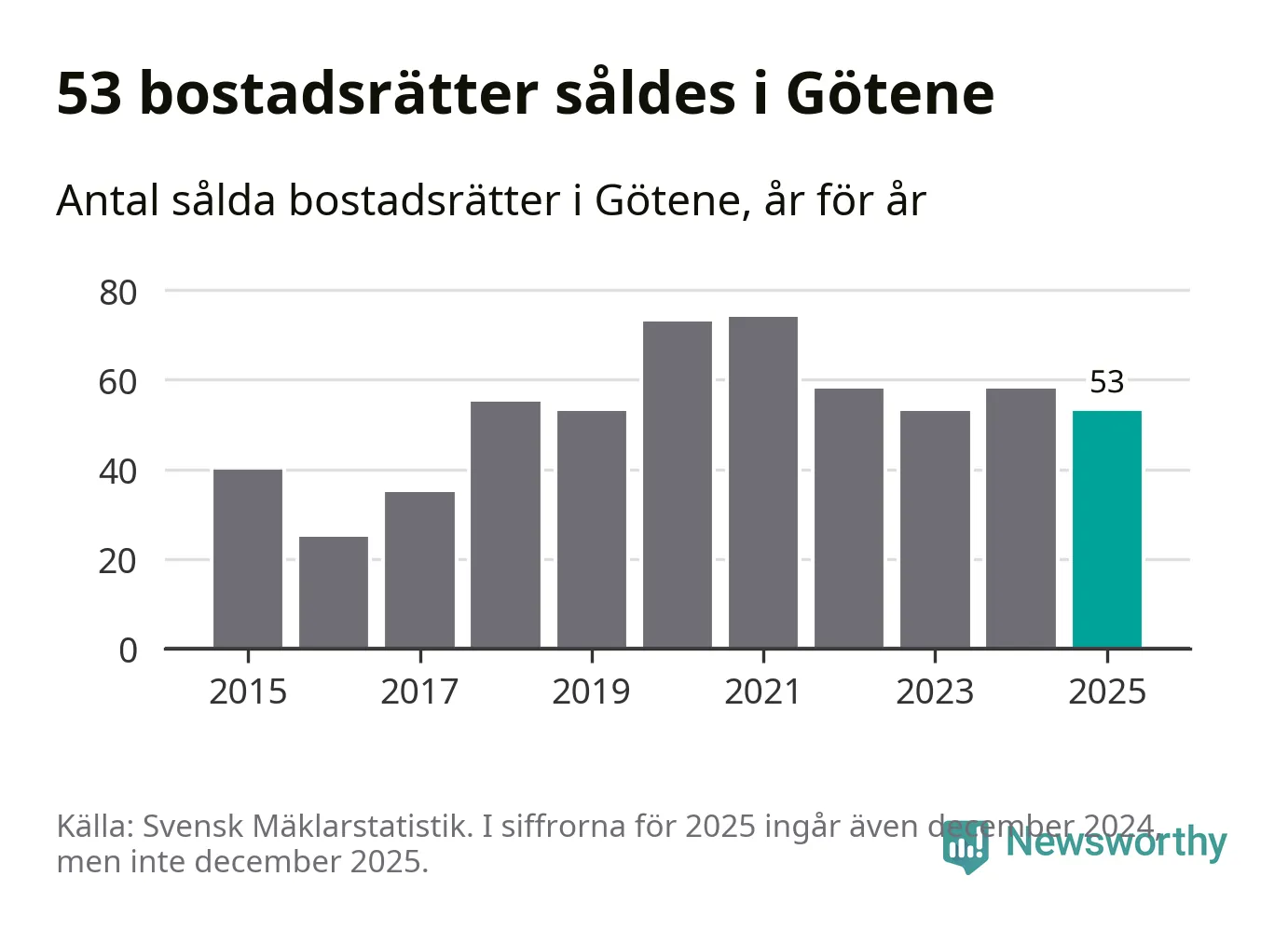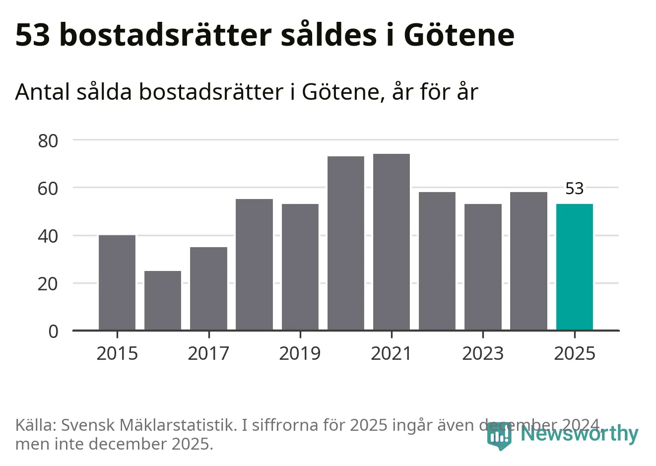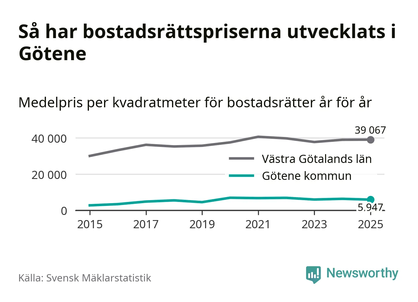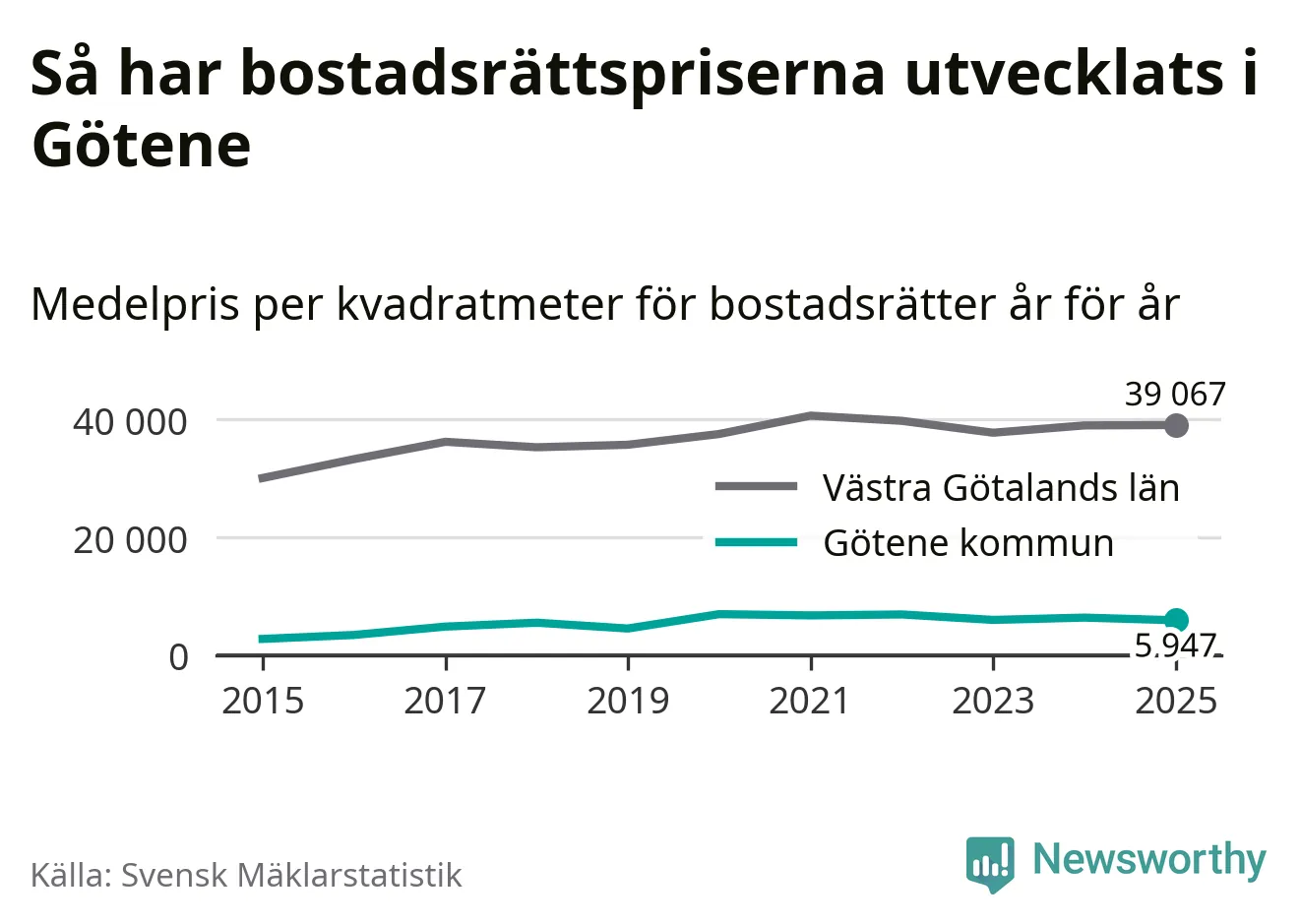 Det såldes totalt 53 bostadsrätter i Götene kommun under året. Genomsnittspriset per kvadratmeter landade på 5 947 kronor. Det är en minskning med sju procent i kommunen på ett år.