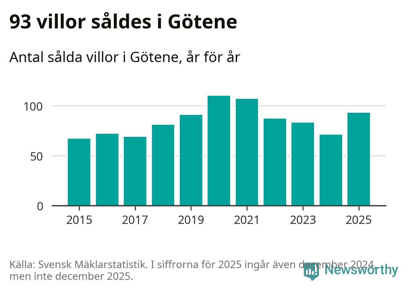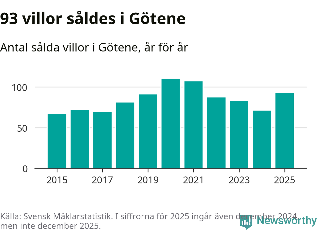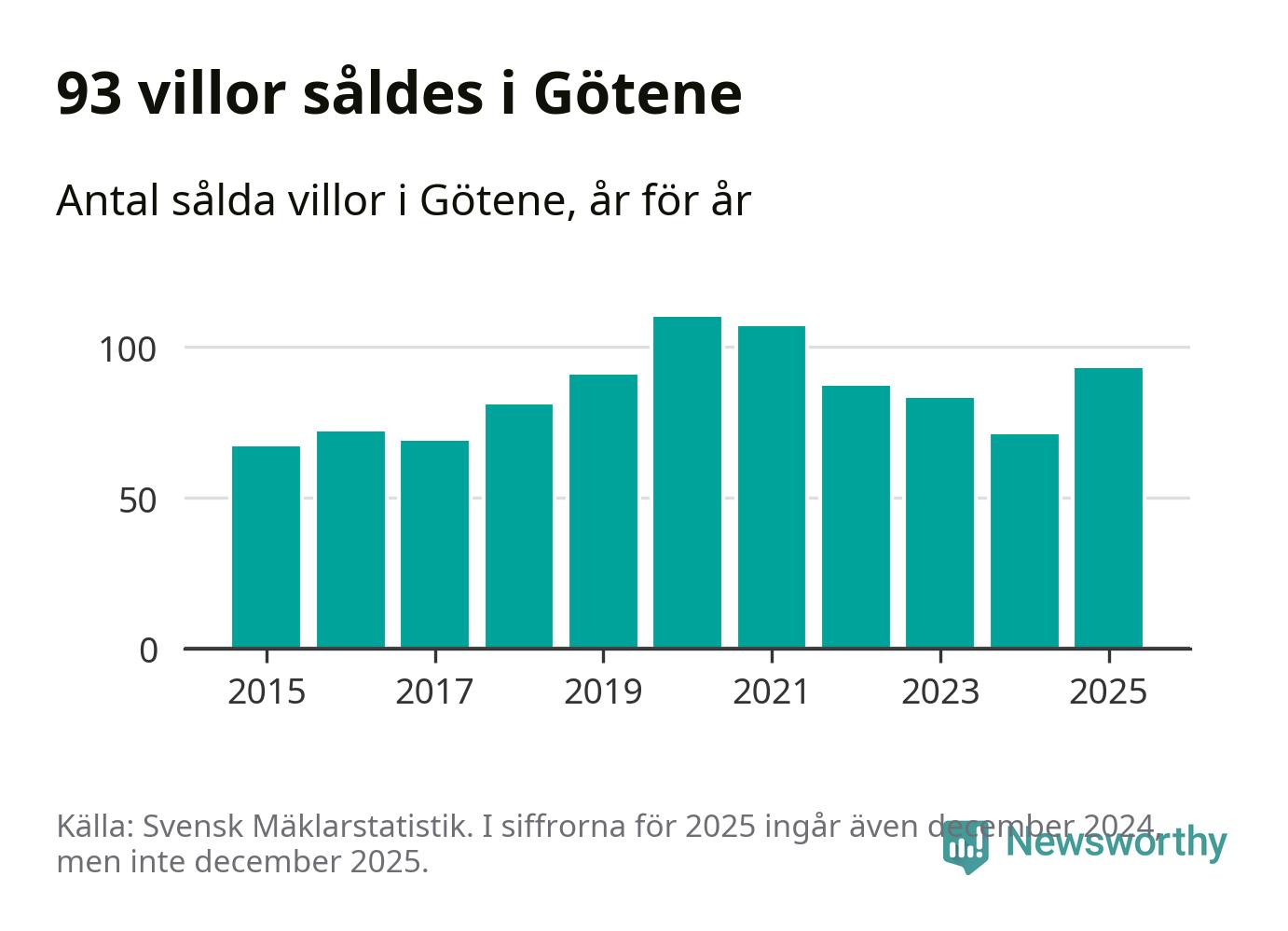 Antalet sålda villor ökade också. Totalt såldes 93 villor, att jämföra med 71 under 2024.