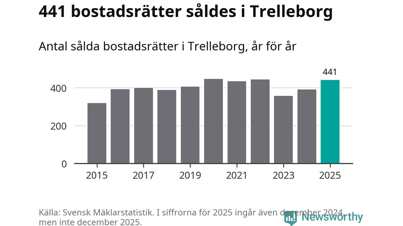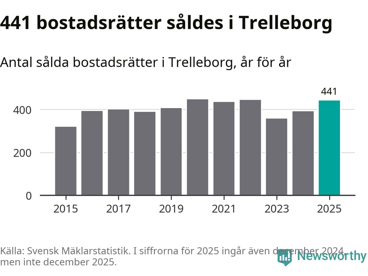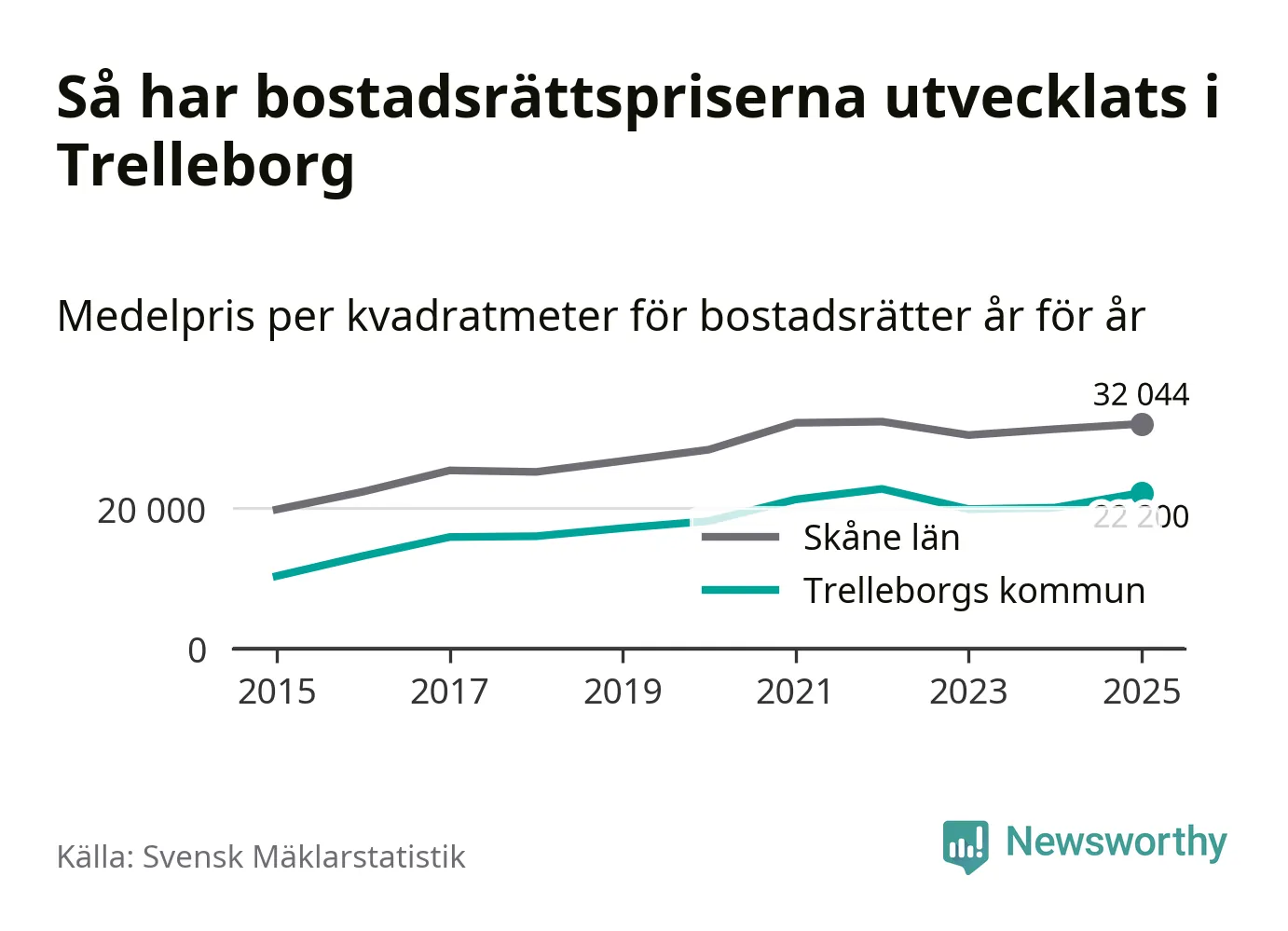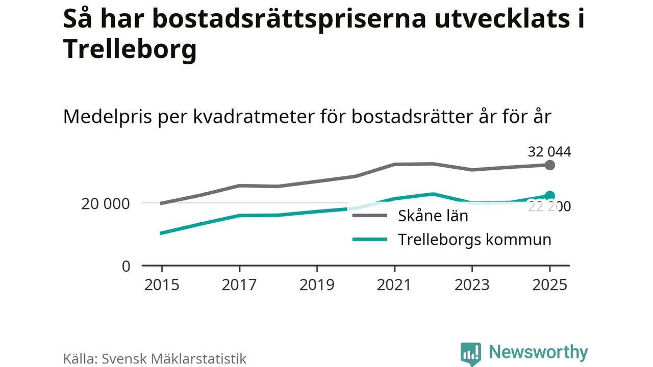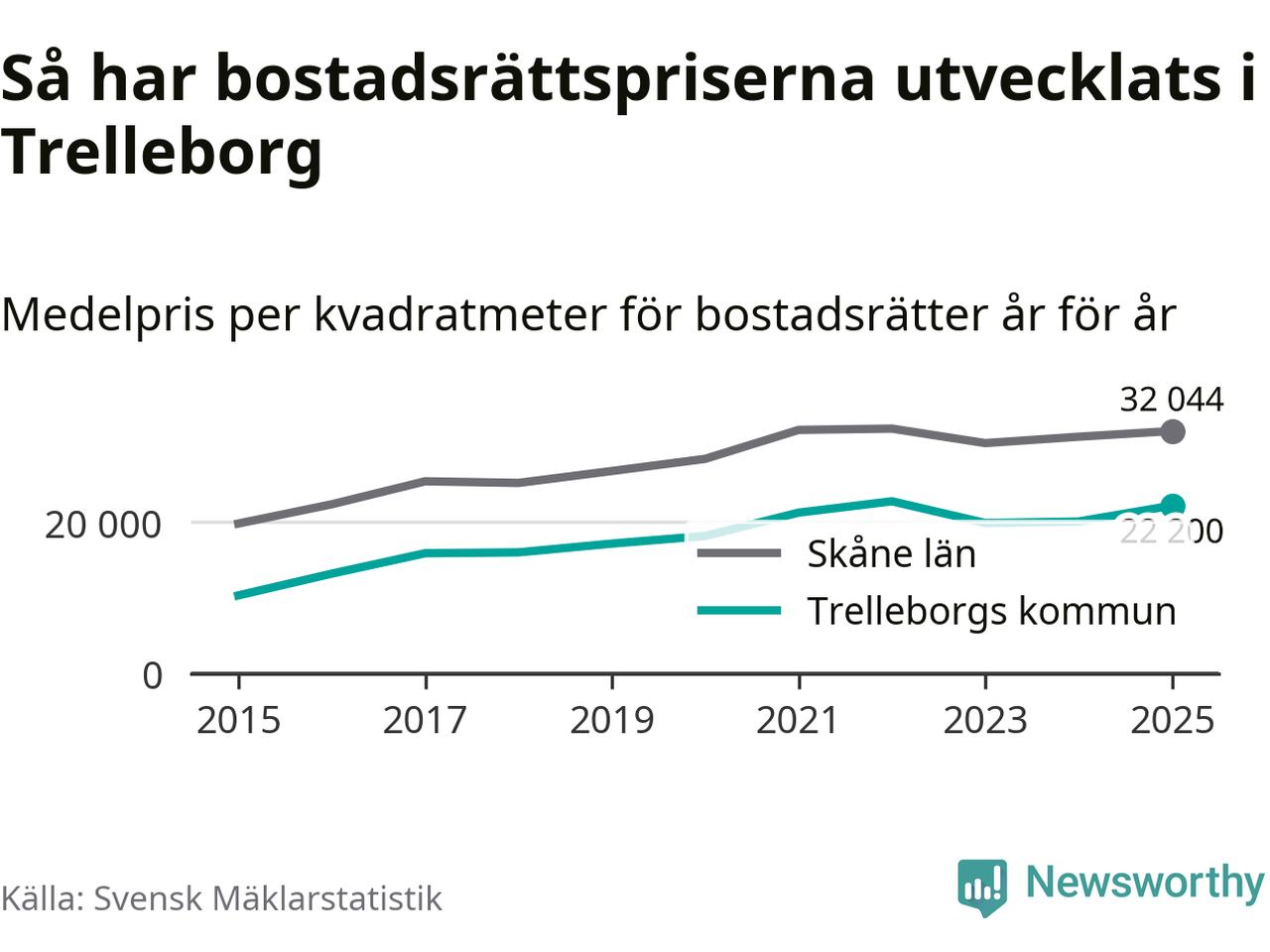 Det såldes totalt 441 bostadsrätter i Trelleborgs kommun under året. Genomsnittspriset per kvadratmeter landade på 22 200 kronor. Det är en ökning med tio procent i kommunen på ett år.
