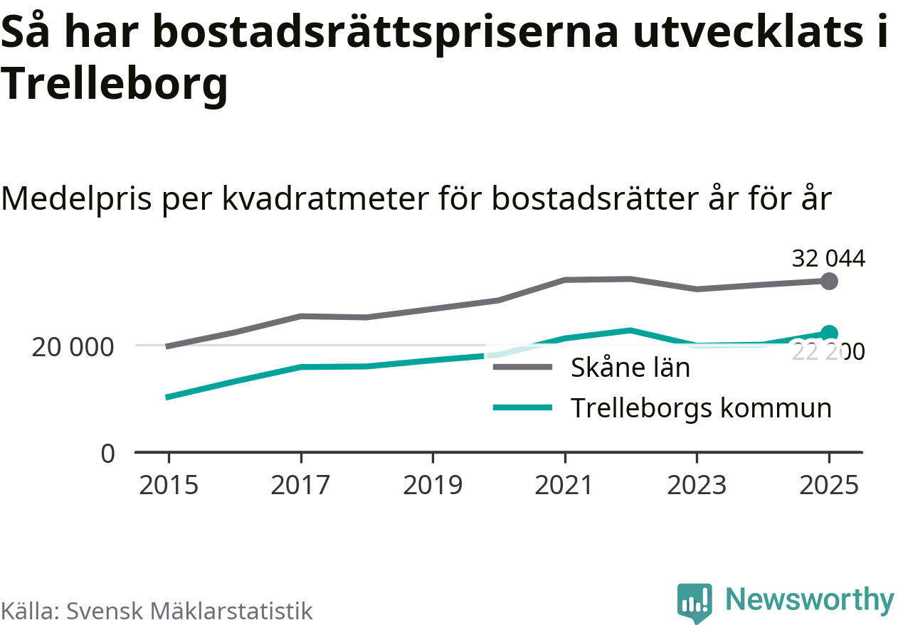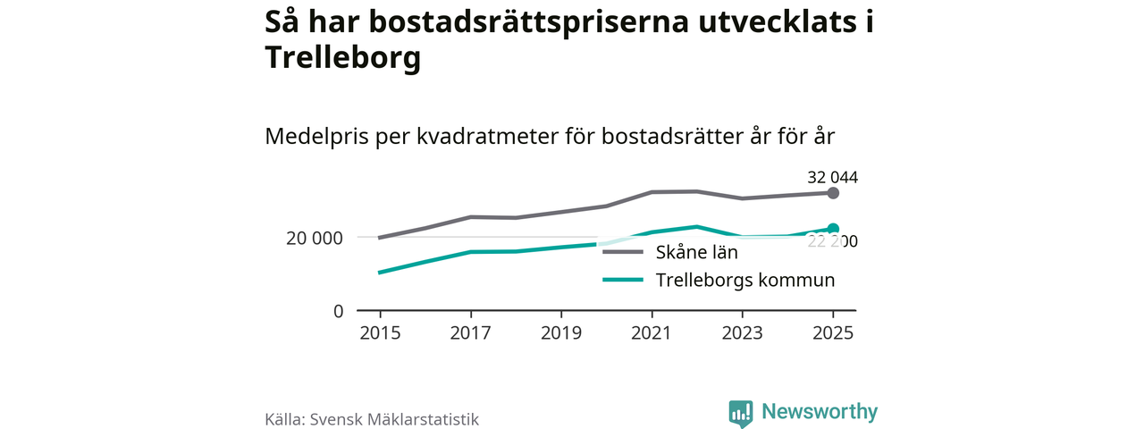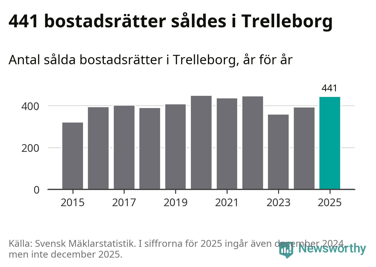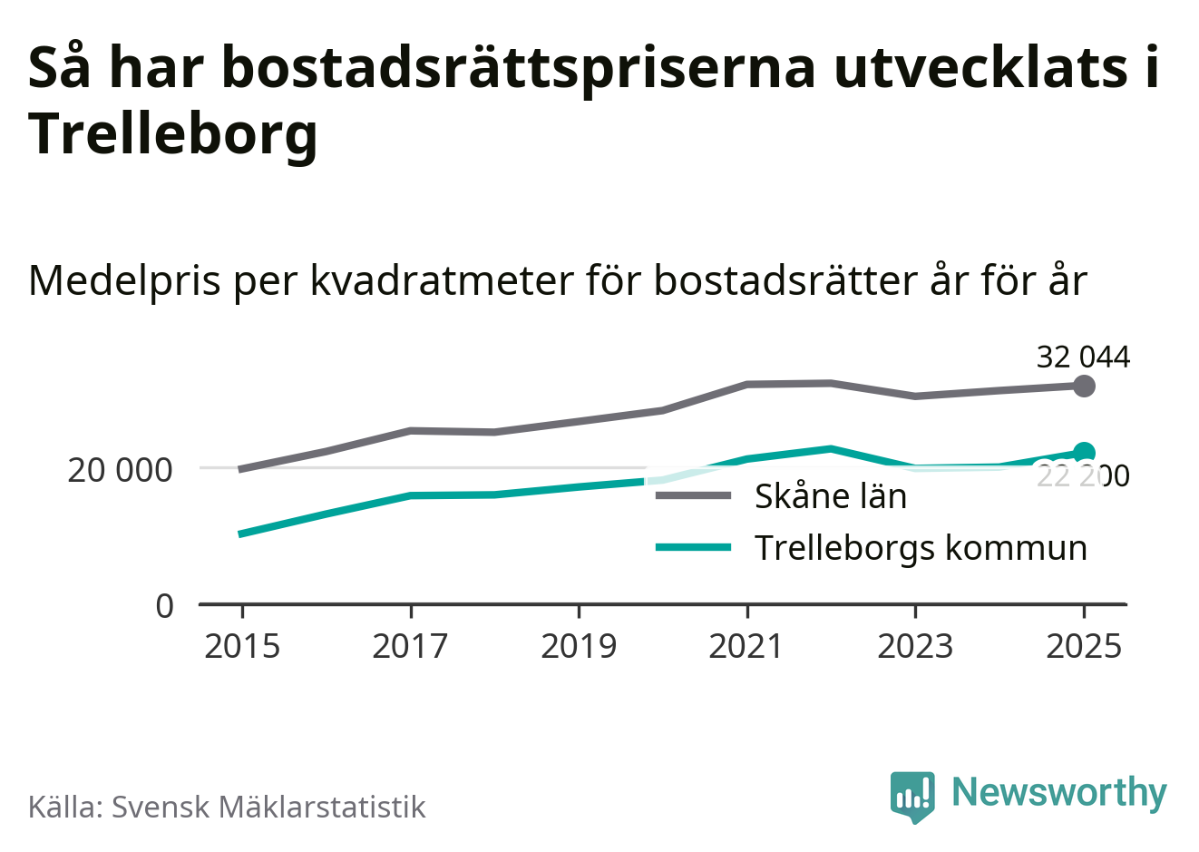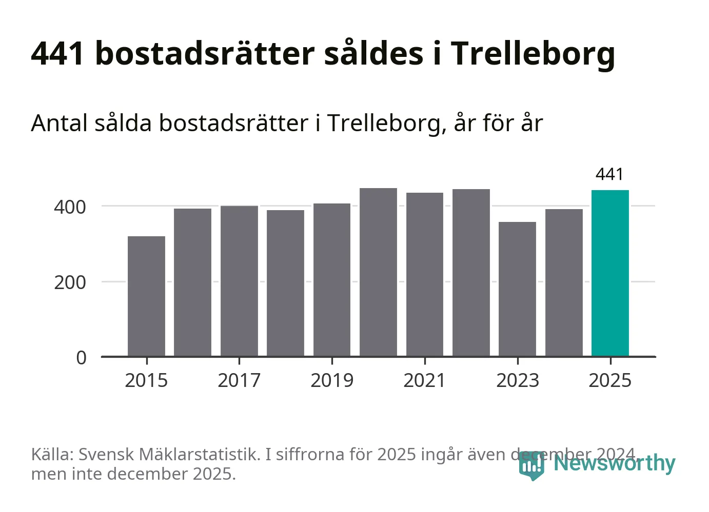 Det såldes totalt 441 bostadsrätter i Trelleborgs kommun under året. Genomsnittspriset per kvadratmeter landade på 22 200 kronor. Det är en ökning med tio procent i kommunen på ett år.