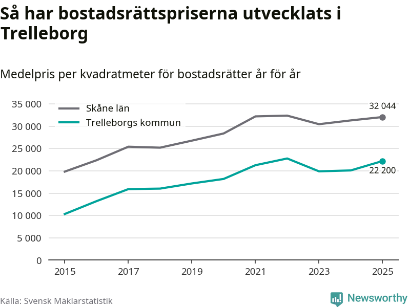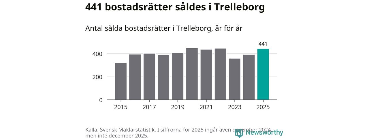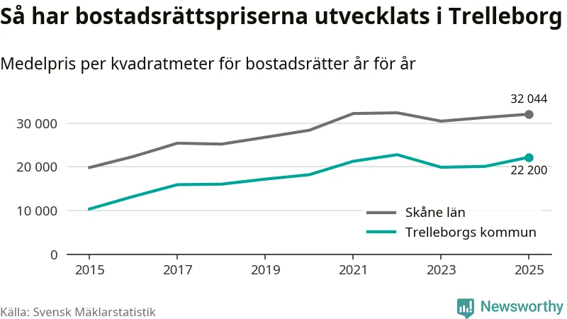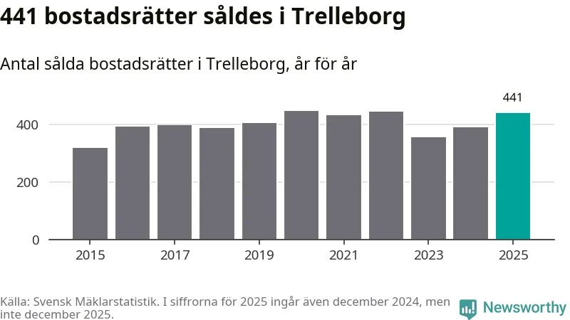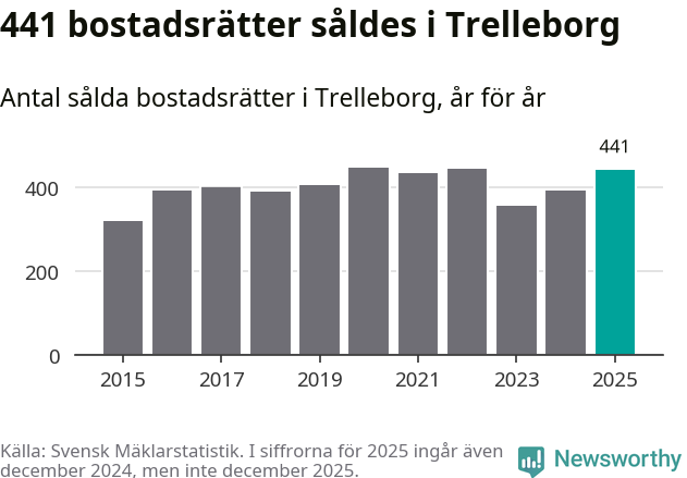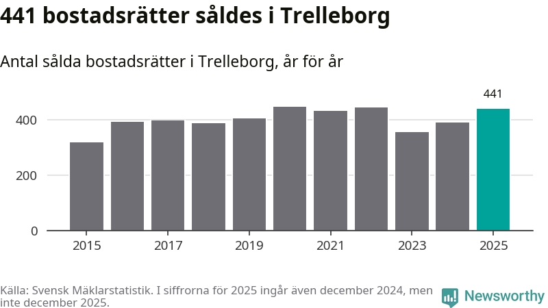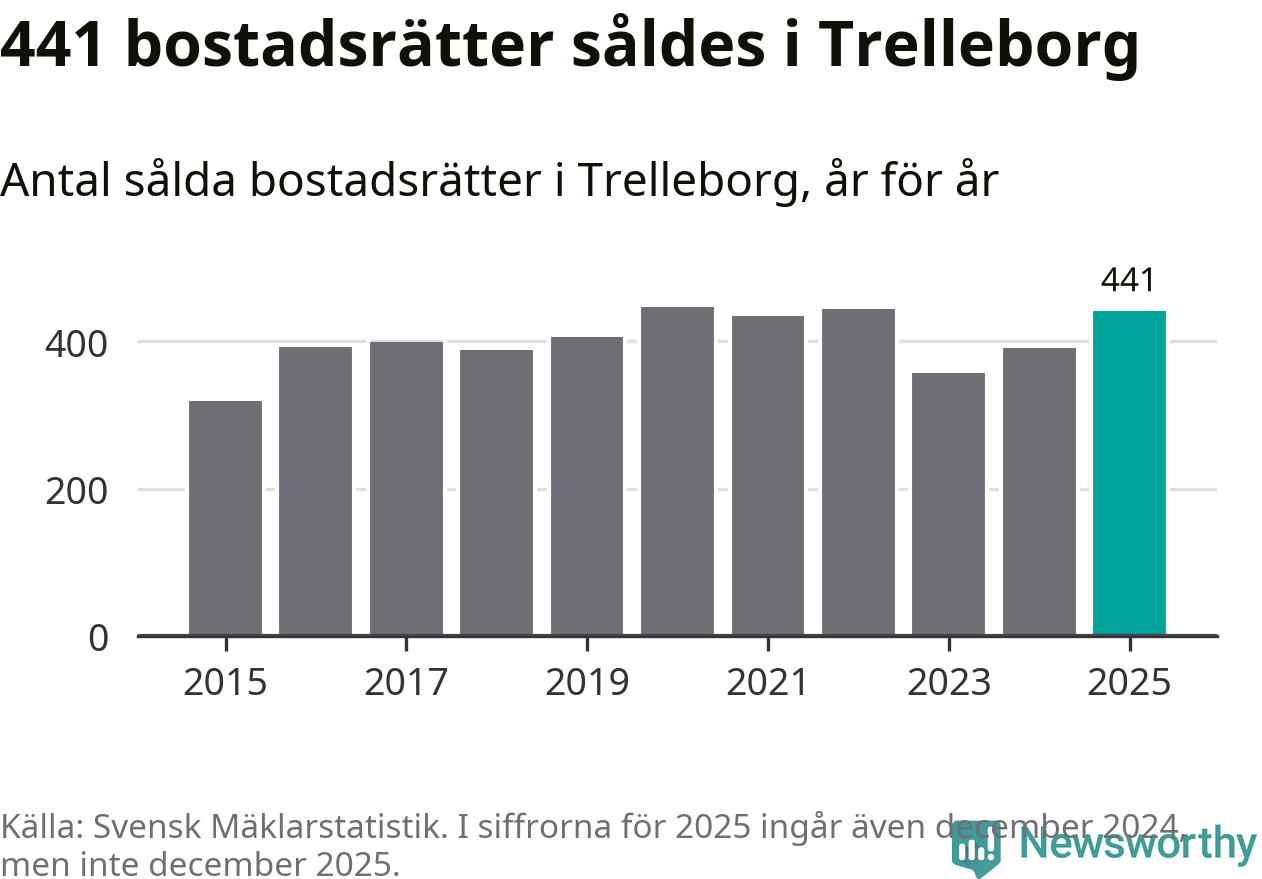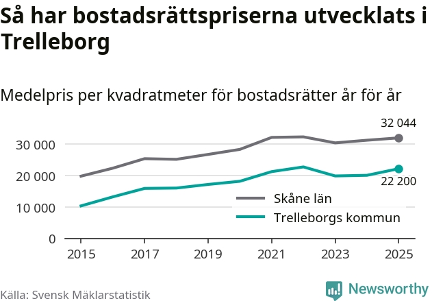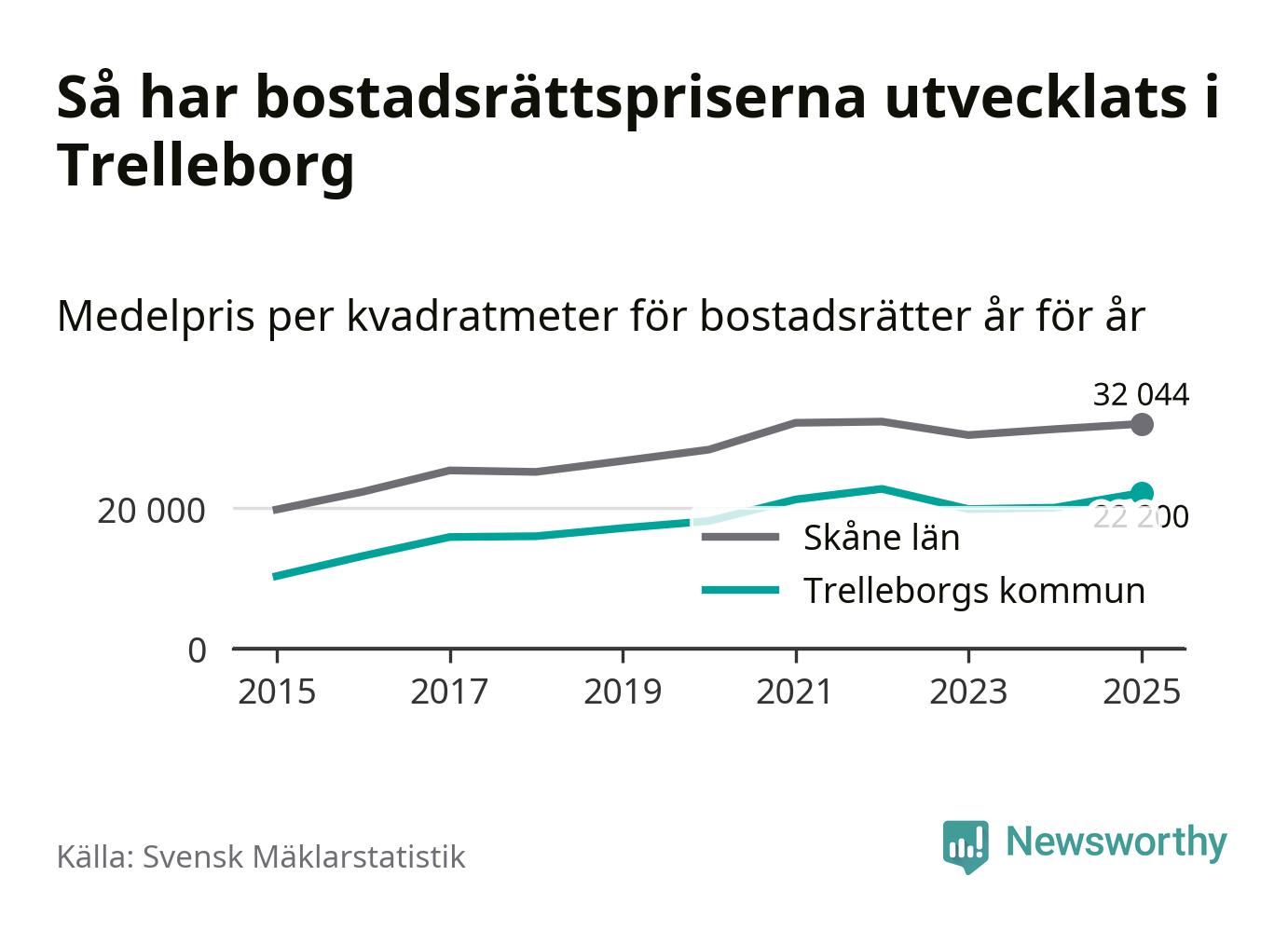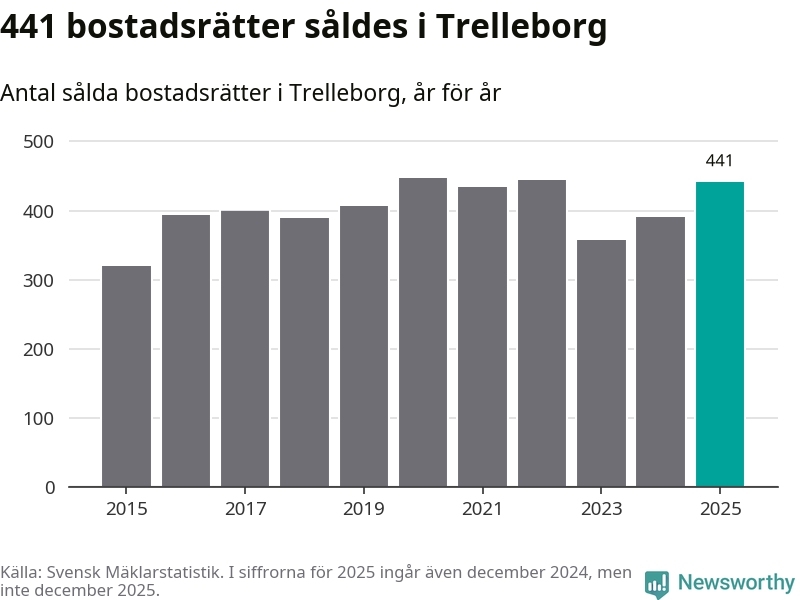Det såldes totalt 441 bostadsrätter i Trelleborgs kommun under året. Genomsnittspriset per kvadratmeter landade på 22 200 kronor. Det är en ökning med tio procent i kommunen på ett år.