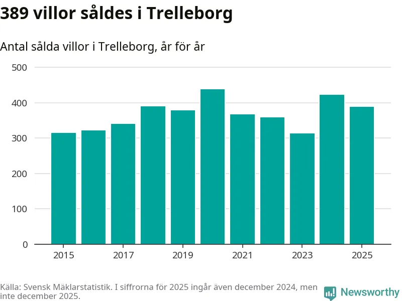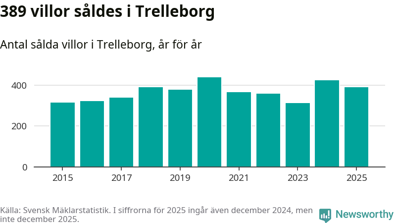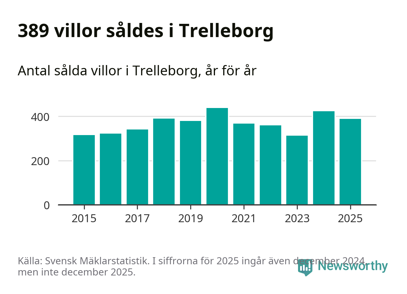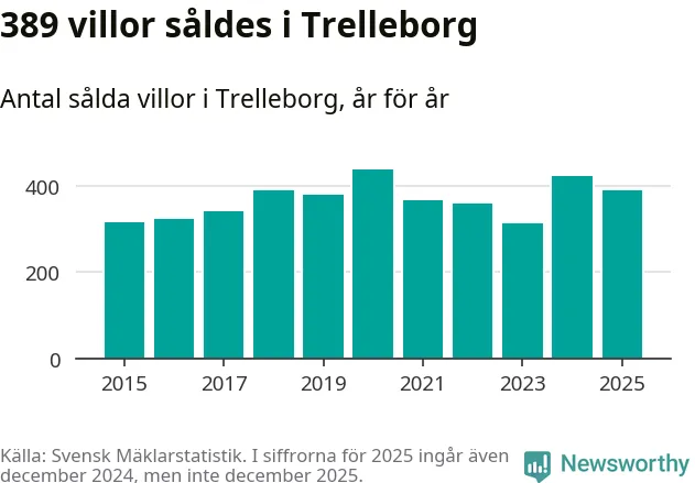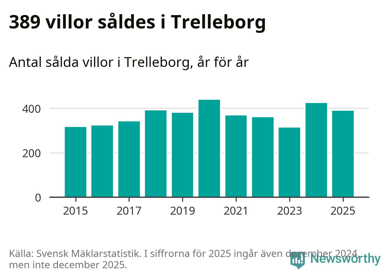 Däremot minskade antalet sålda villor. Totalt såldes 389 villor, att jämföra med 423 under 2024.