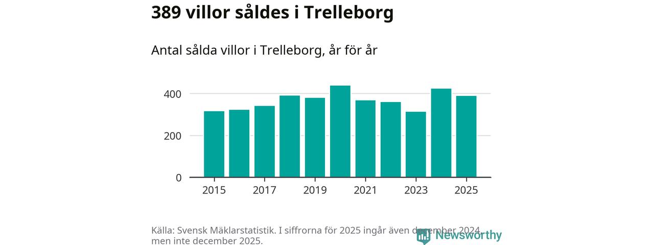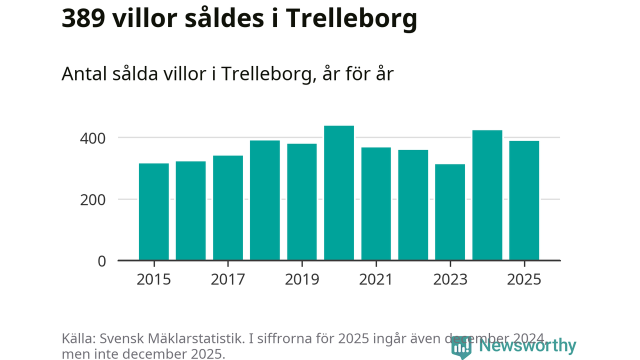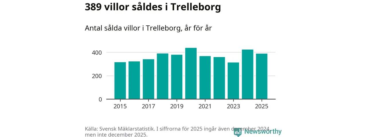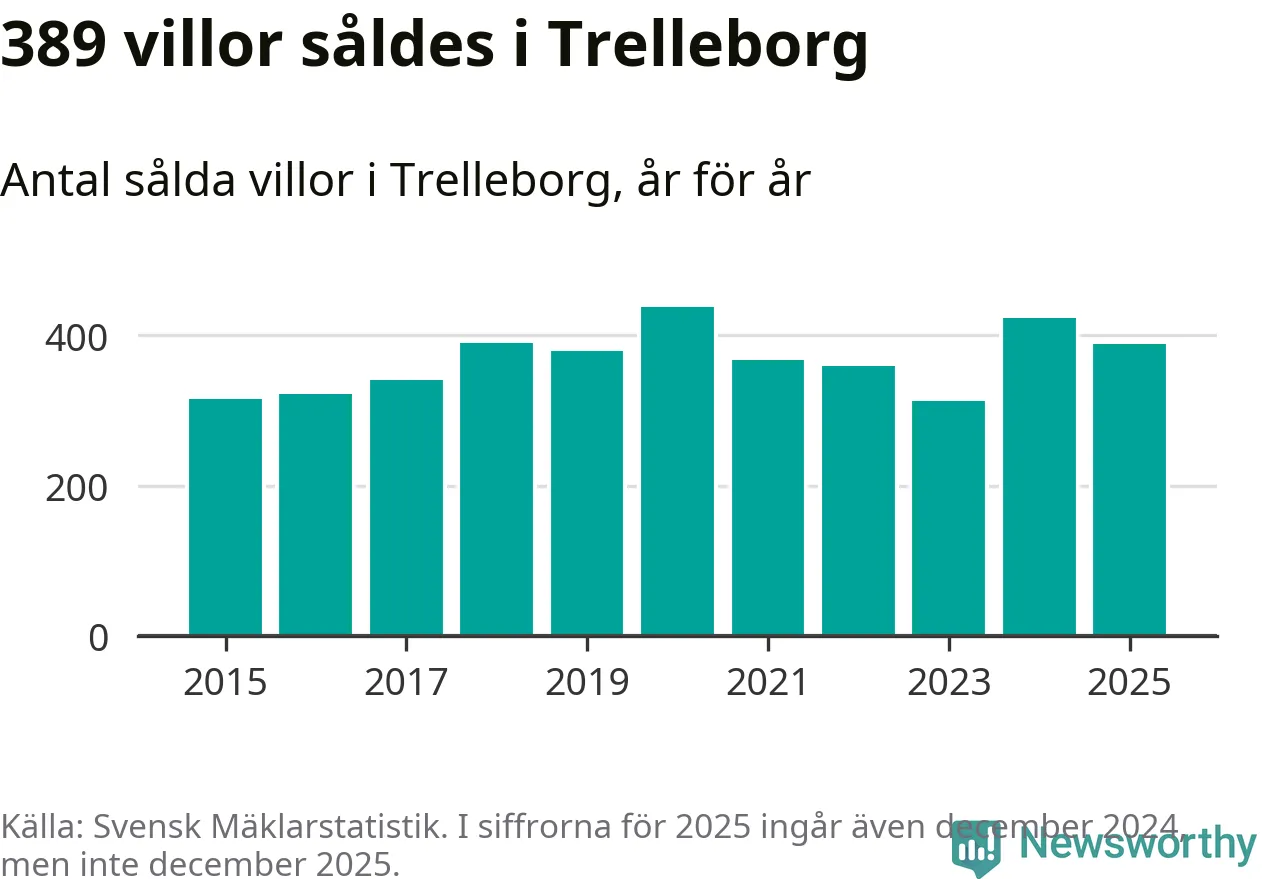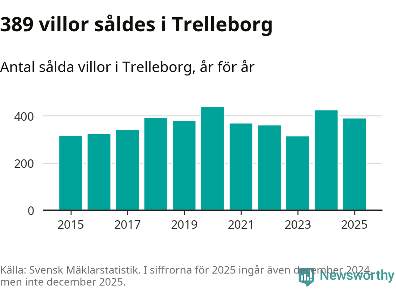 Däremot minskade antalet sålda villor. Totalt såldes 389 villor, att jämföra med 423 under 2024.