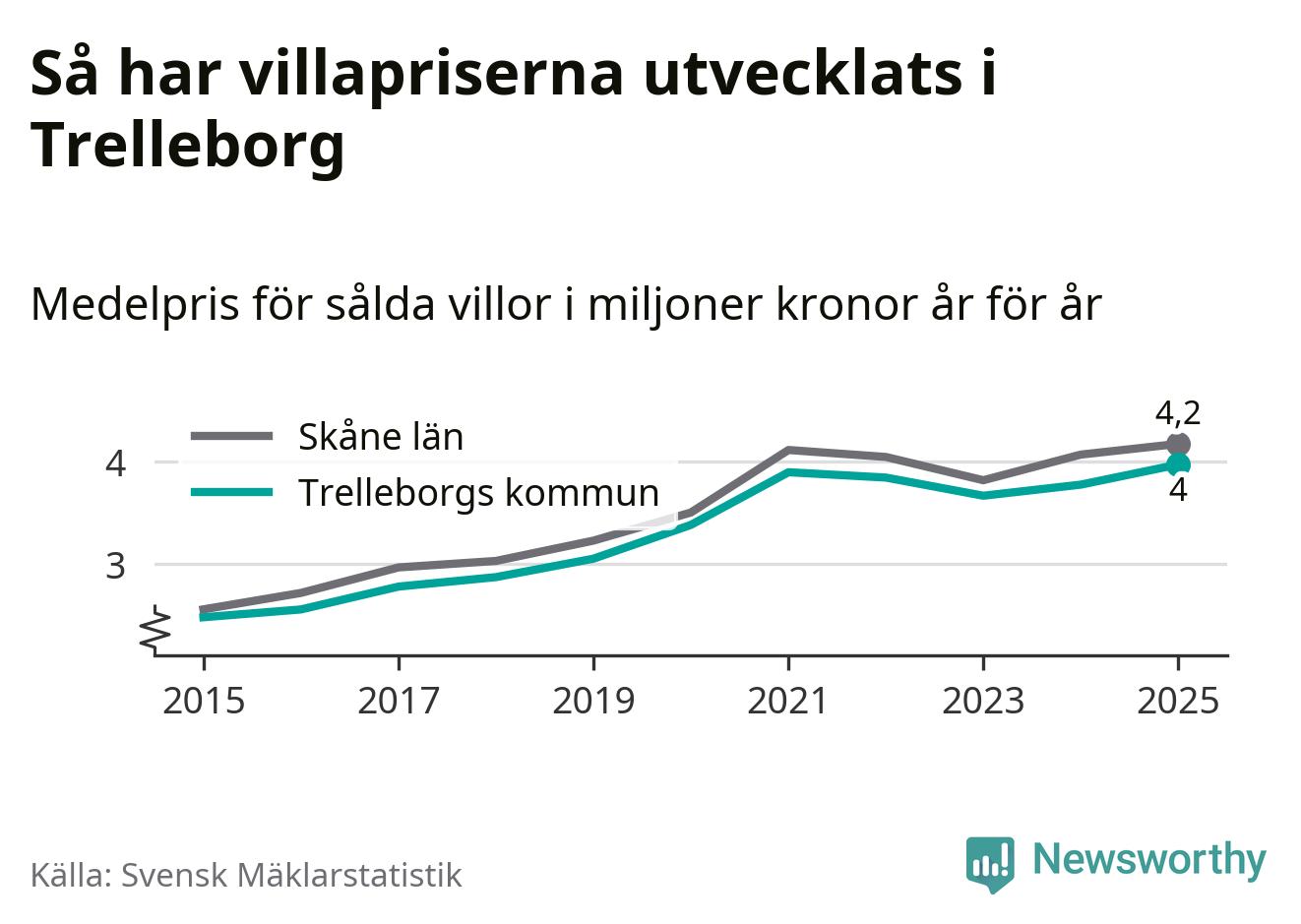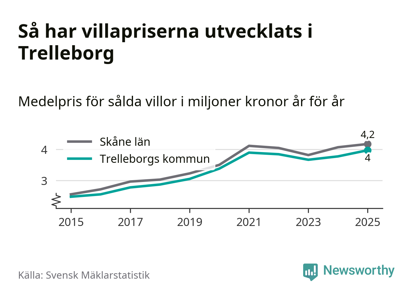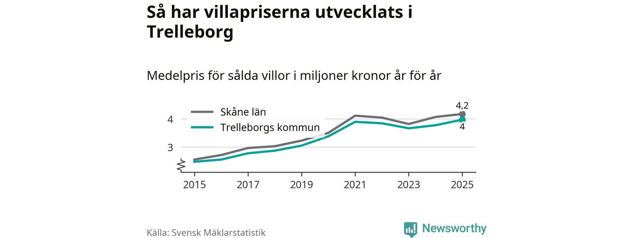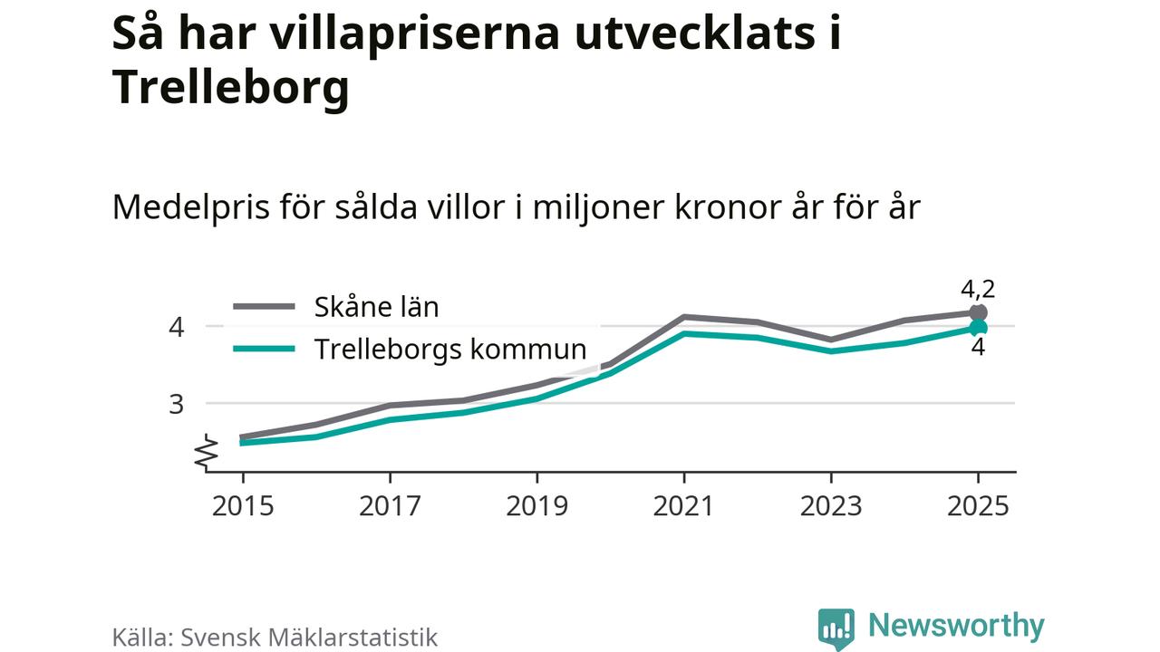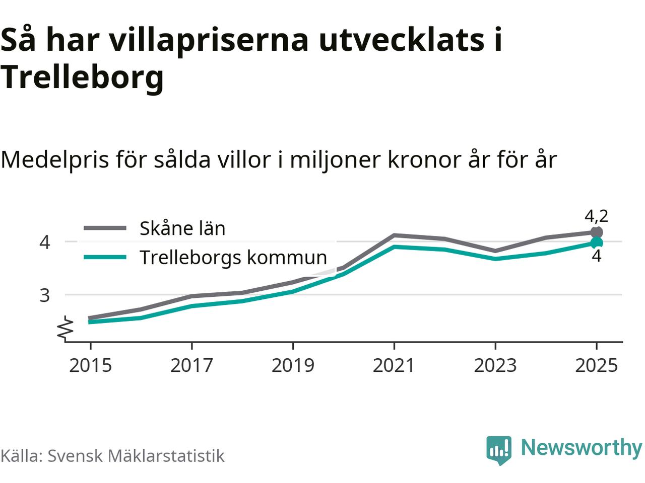 Fyra miljoner kronor är medelpriset för de villor som såldes i Trelleborgs kommun under året, eller 30 956 kronor per kvadratmeter. Det innebär en prisökning med fem procent på ett år. Det är det högsta årssnittet på åtminstone tio år. Bryter man upp siffrorna per kvartal har dock ännu högre villapriser noterats i Trelleborg våren 2022.