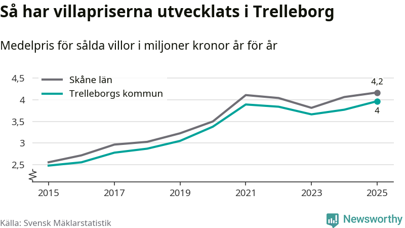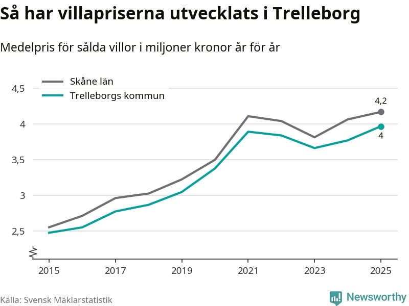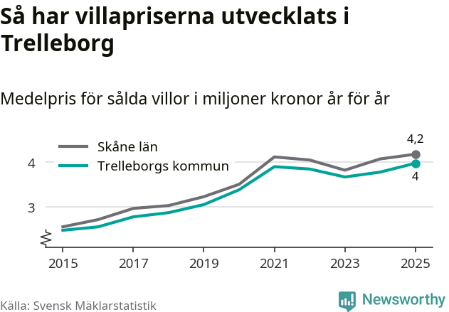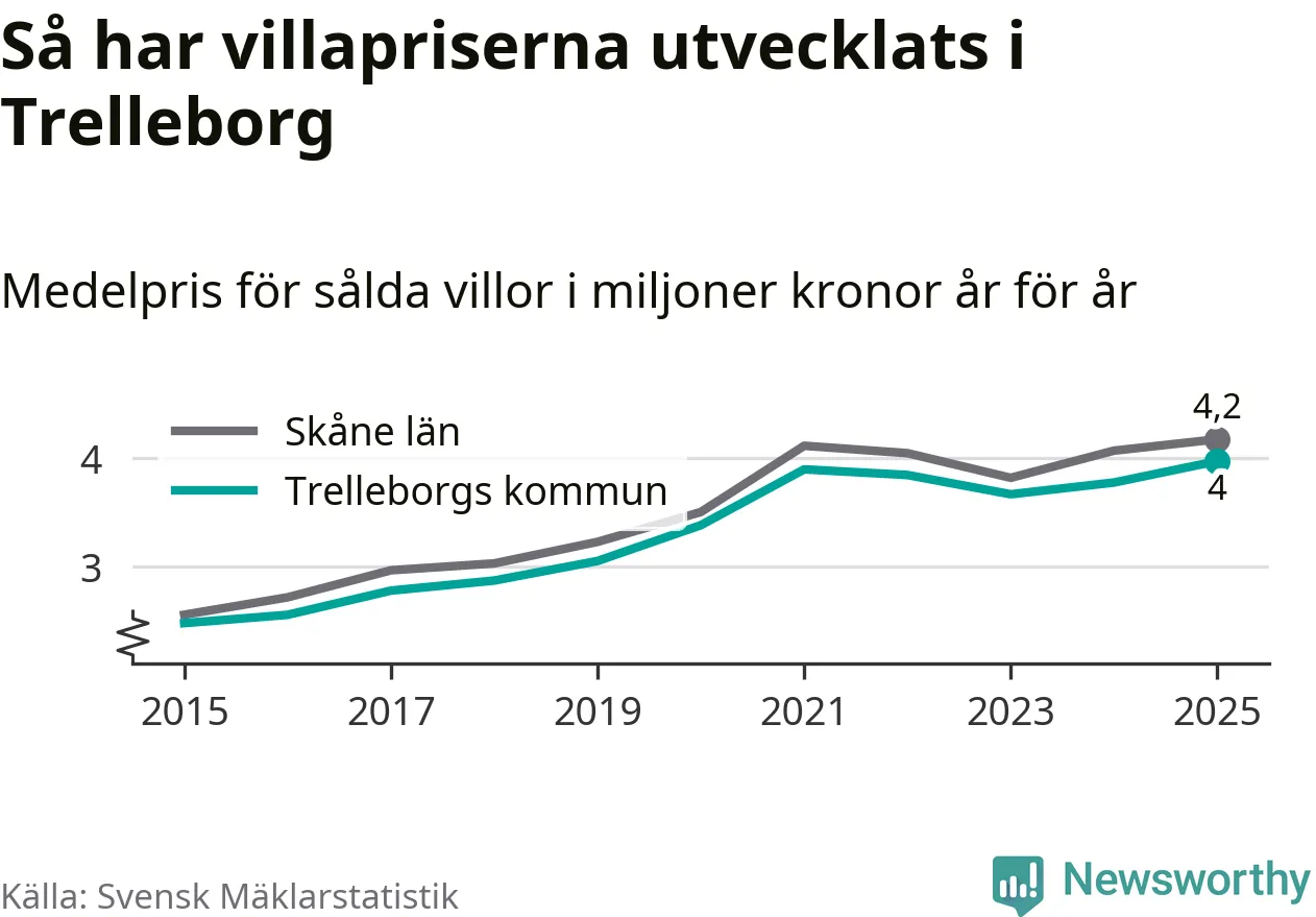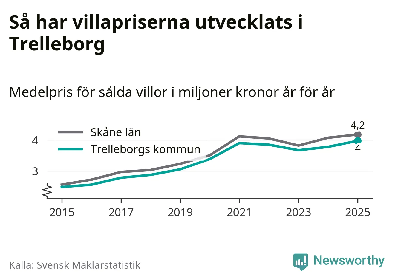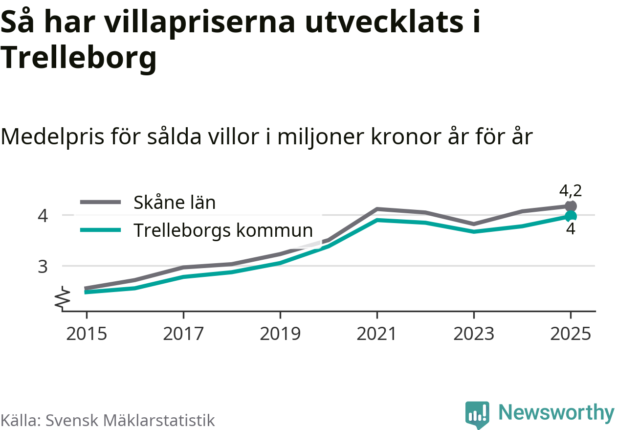 Fyra miljoner kronor är medelpriset för de villor som såldes i Trelleborgs kommun under året, eller 30 956 kronor per kvadratmeter. Det innebär en prisökning med fem procent på ett år. Det är det högsta årssnittet på åtminstone tio år. Bryter man upp siffrorna per kvartal har dock ännu högre villapriser noterats i Trelleborg våren 2022.