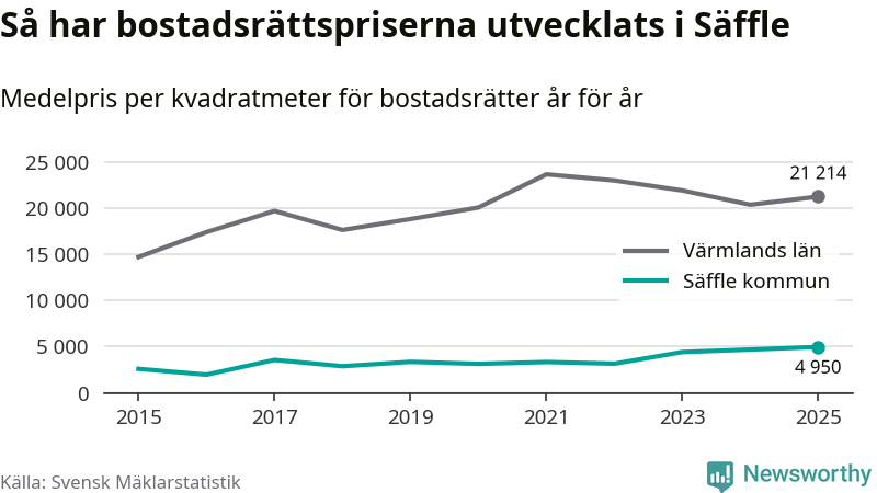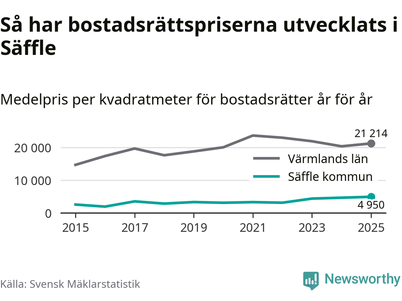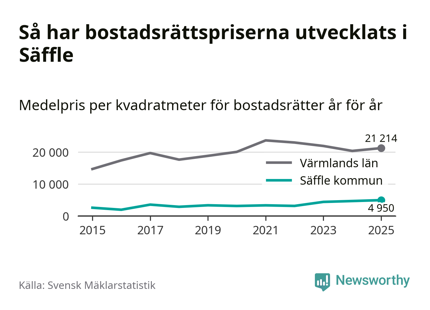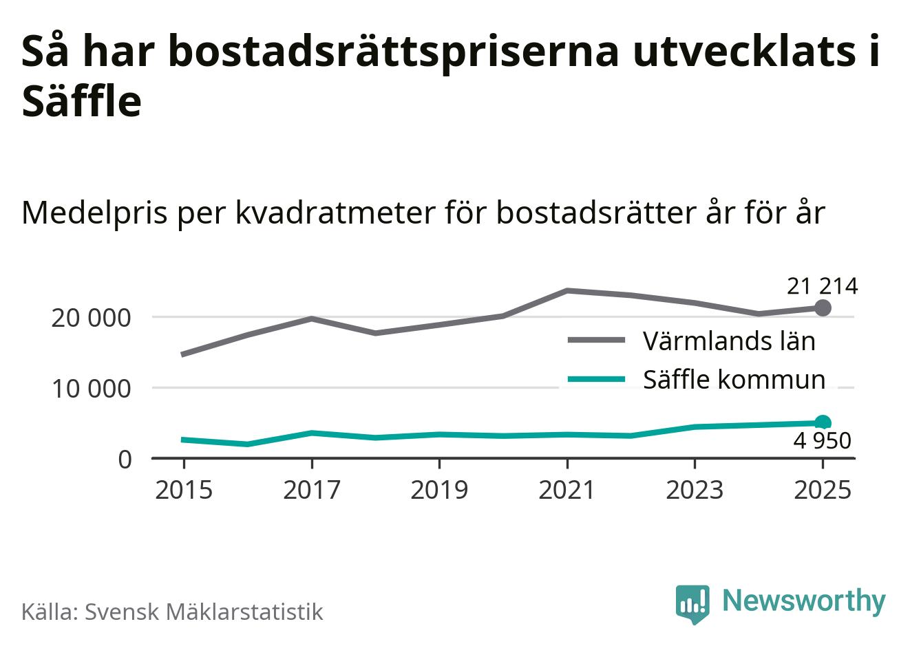 Det såldes totalt 45 bostadsrätter i Säffle kommun under året. Genomsnittspriset per kvadratmeter landade på 4 950 kronor. Det är en ökning med sex procent i kommunen på ett år och den högsta årsnivån på över ett decennium. Bryter man upp siffrorna per kvartal har dock ännu högre bostadsrättspriser noterats i Säffle vintern 2024/25.