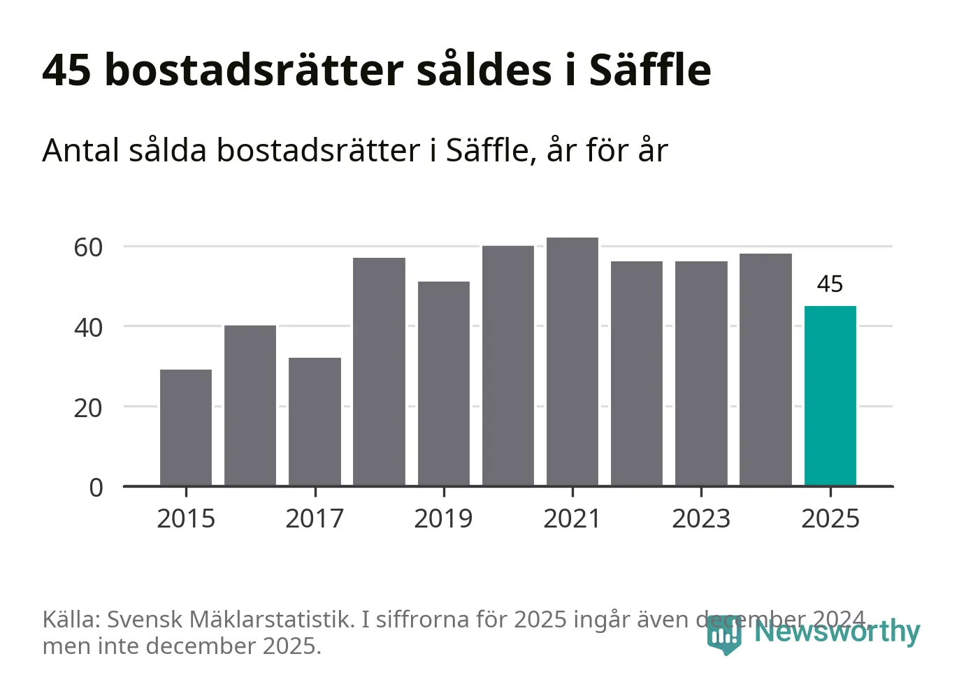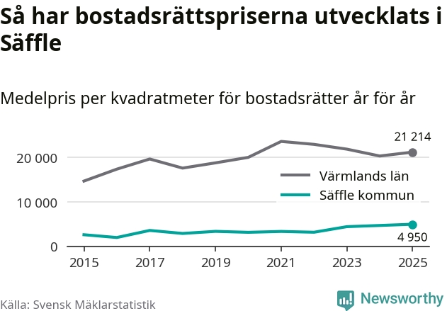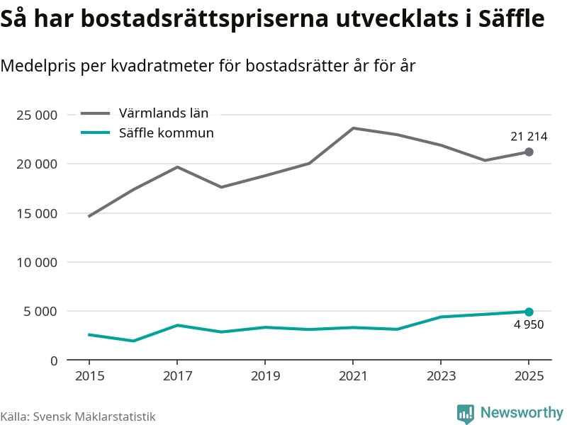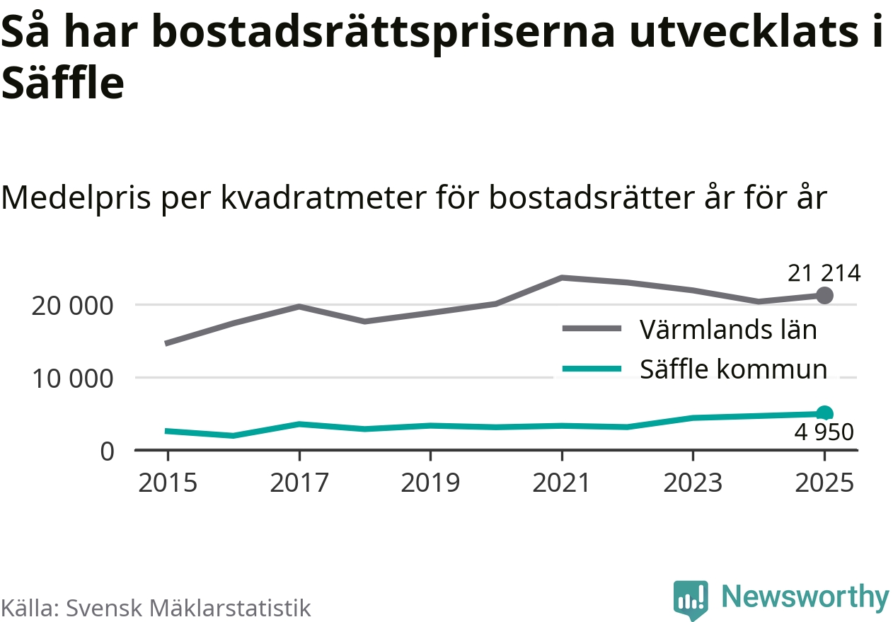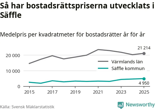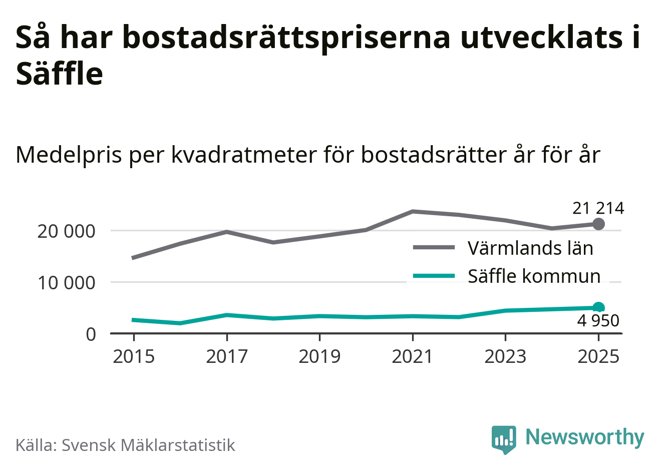 Det såldes totalt 45 bostadsrätter i Säffle kommun under året. Genomsnittspriset per kvadratmeter landade på 4 950 kronor. Det är en ökning med sex procent i kommunen på ett år och den högsta årsnivån på över ett decennium. Bryter man upp siffrorna per kvartal har dock ännu högre bostadsrättspriser noterats i Säffle vintern 2024/25.
