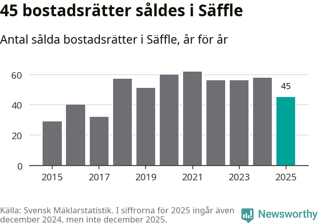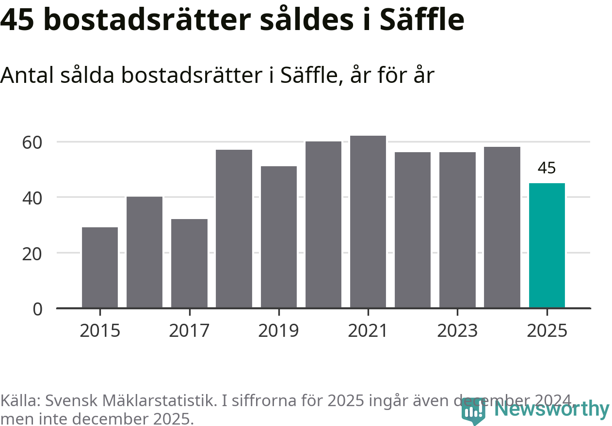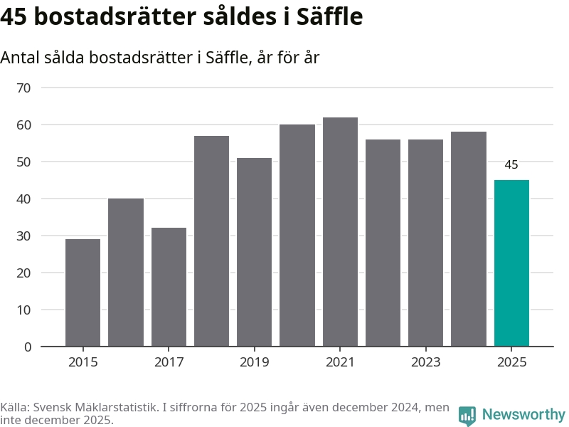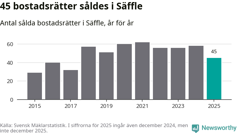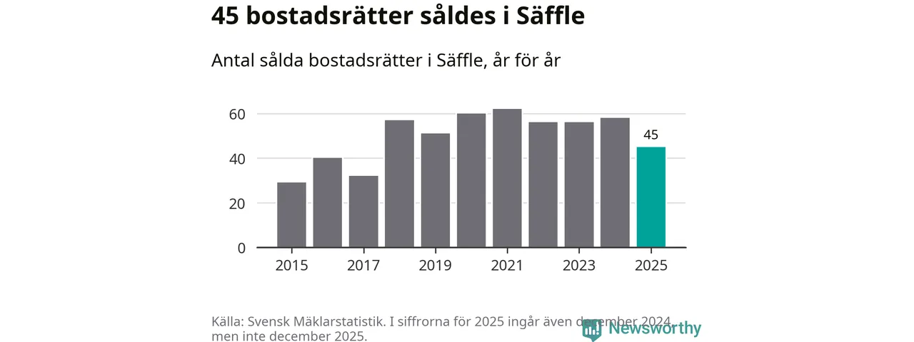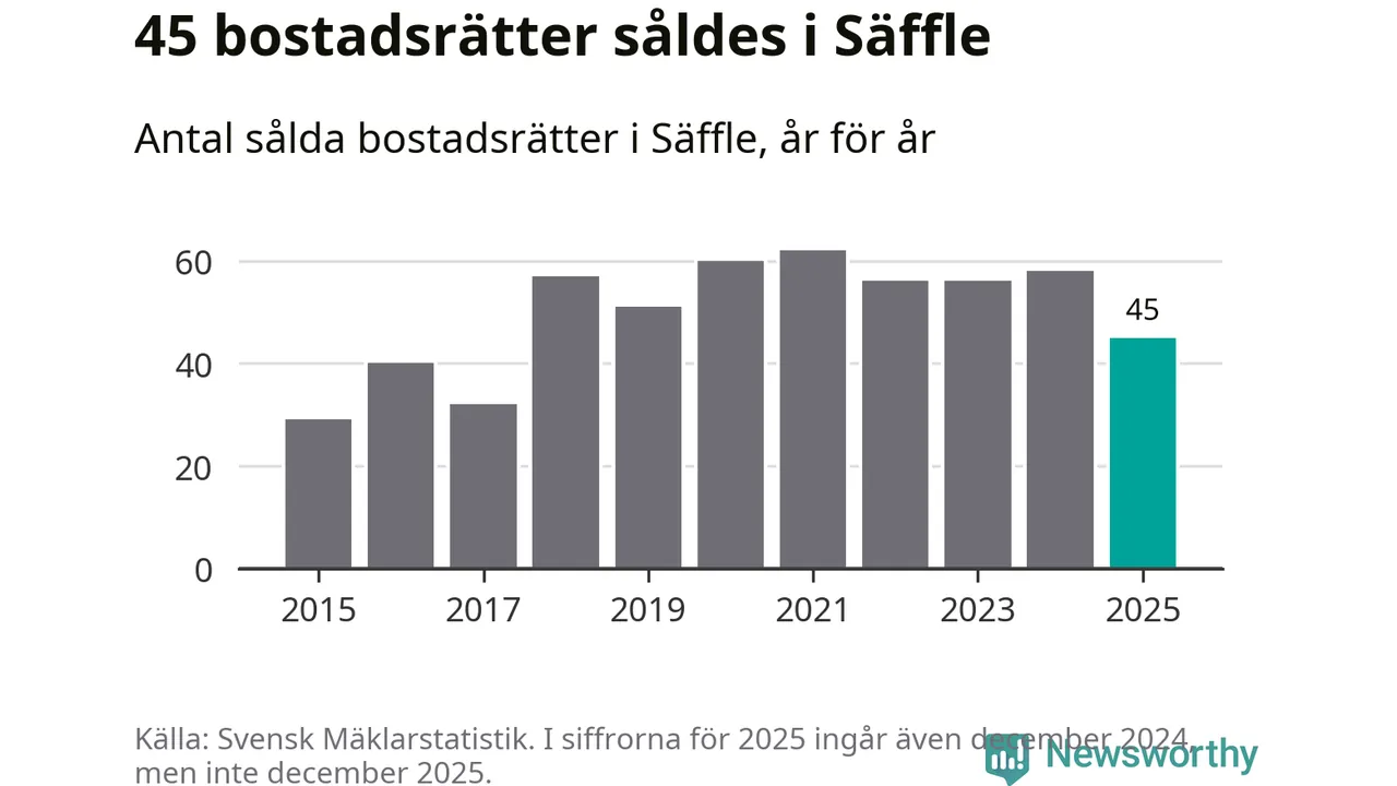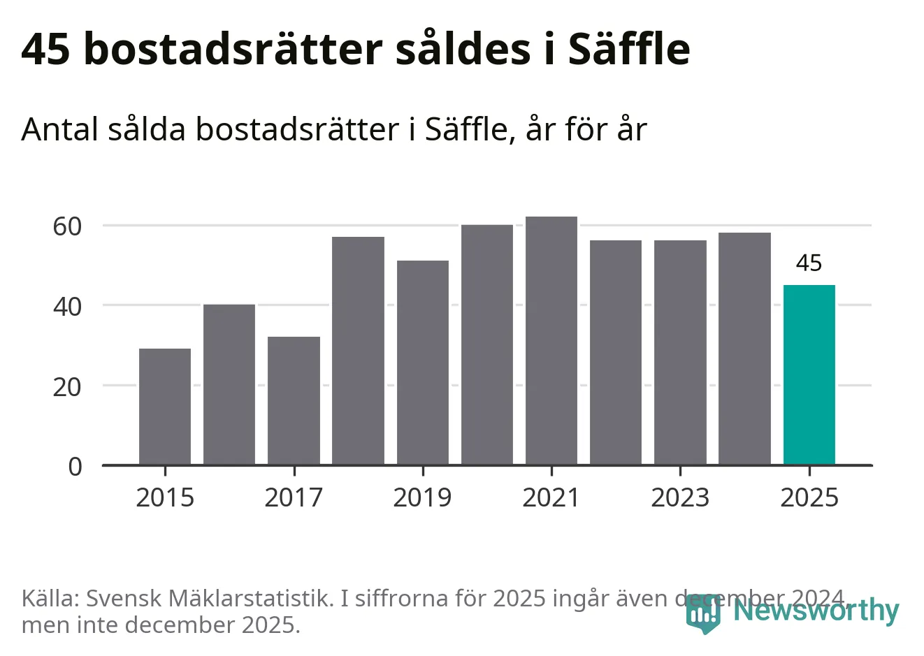 Det såldes totalt 45 bostadsrätter i Säffle kommun under året. Genomsnittspriset per kvadratmeter landade på 4 950 kronor. Det är en ökning med sex procent i kommunen på ett år och den högsta årsnivån på över ett decennium. Bryter man upp siffrorna per kvartal har dock ännu högre bostadsrättspriser noterats i Säffle vintern 2024/25.