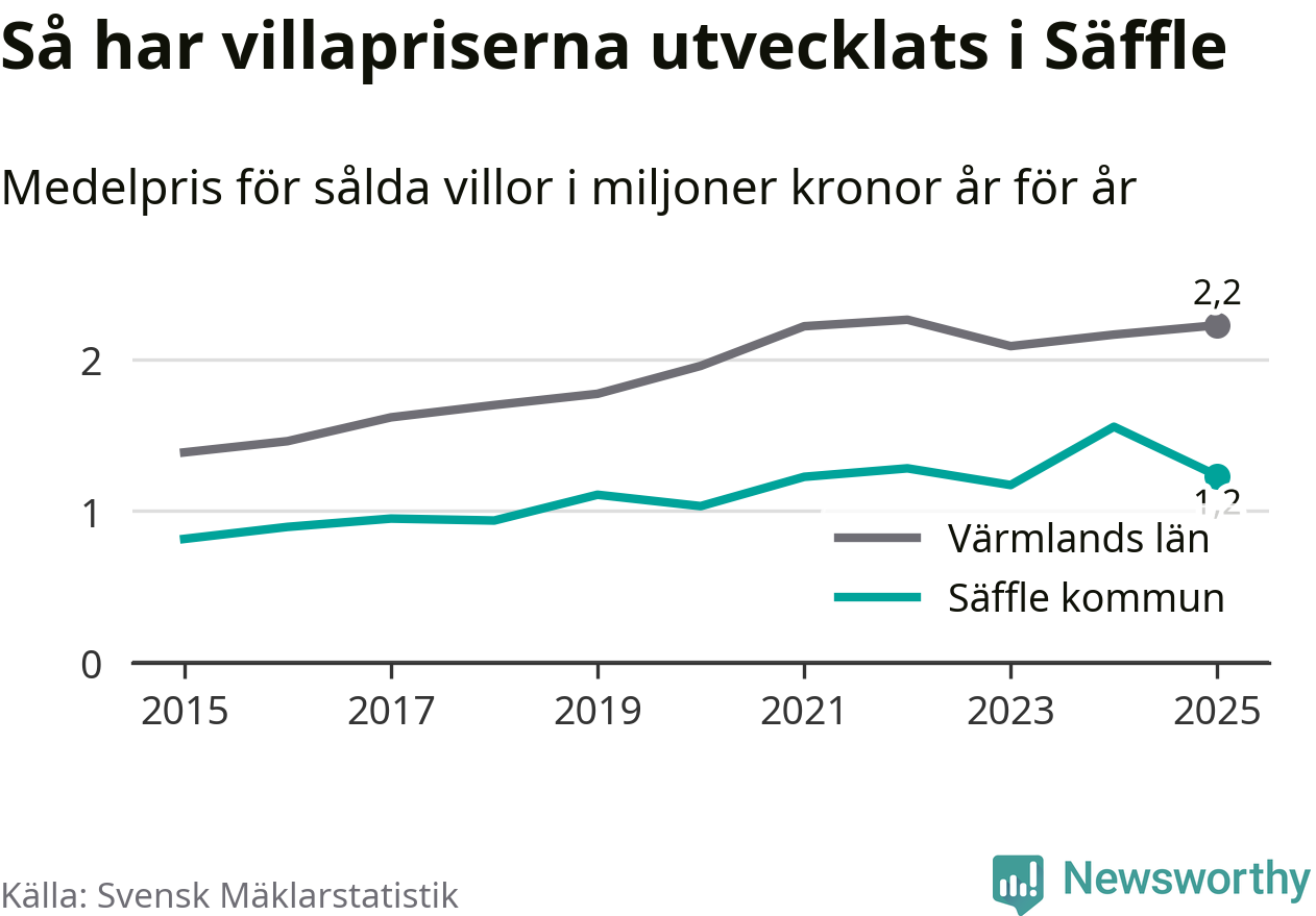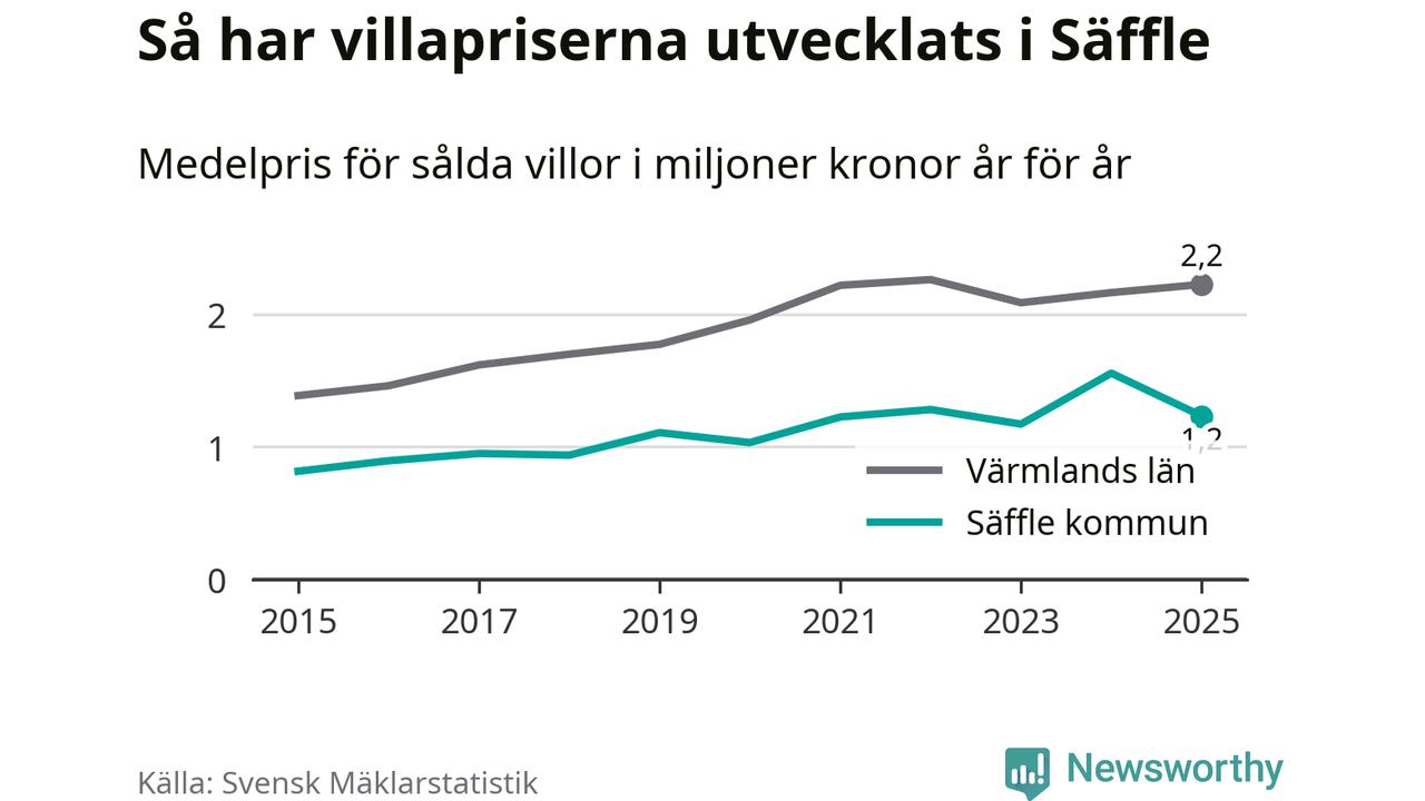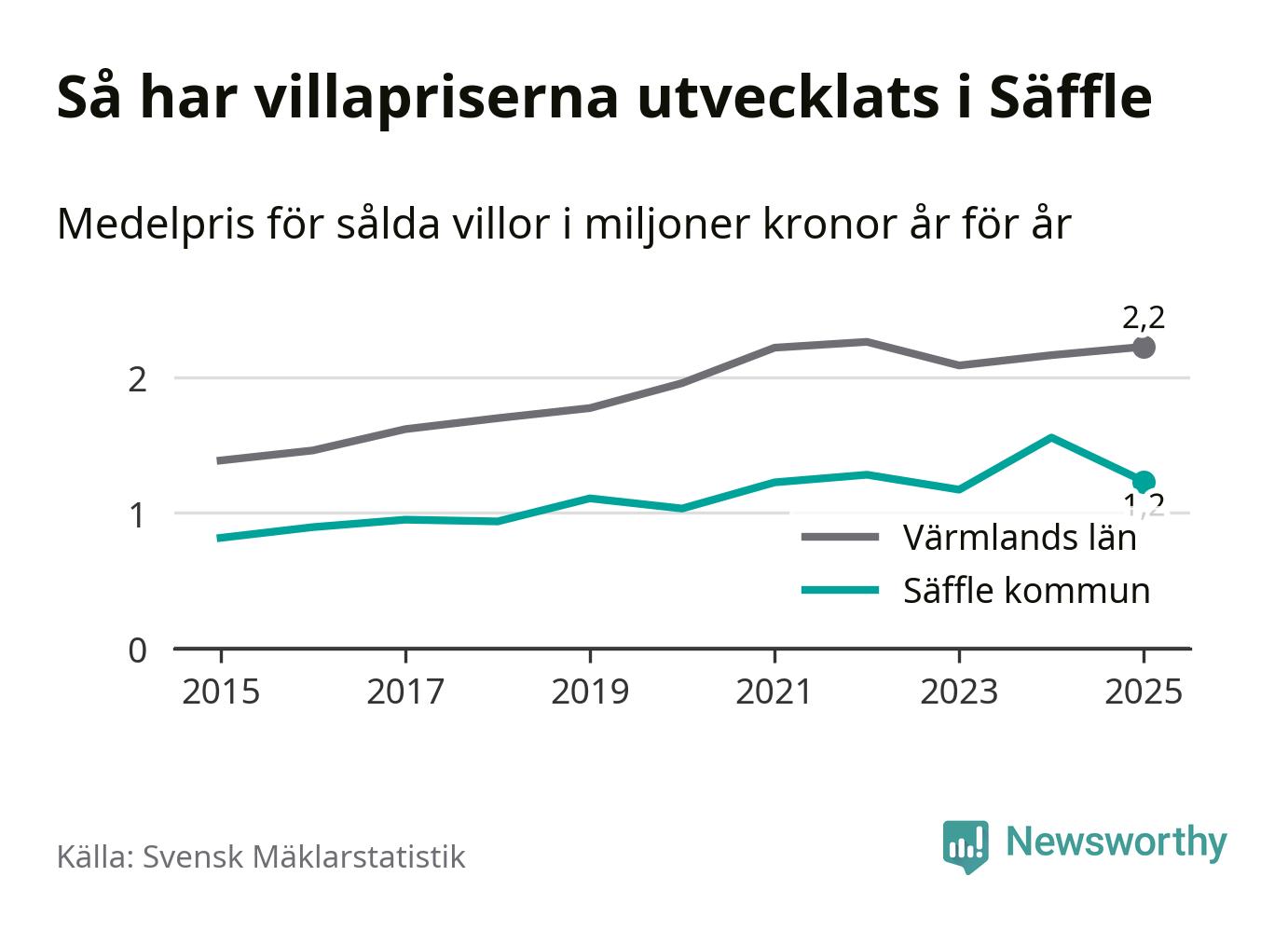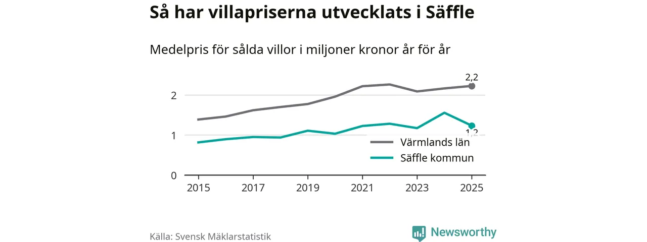 1,2 miljoner kronor är medelpriset för de villor som såldes i Säffle kommun under året, eller 10 986 kronor per kvadratmeter. Det innebär en prisminskning med 21 procent på ett år.