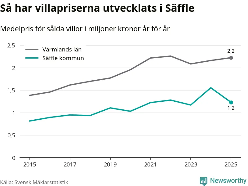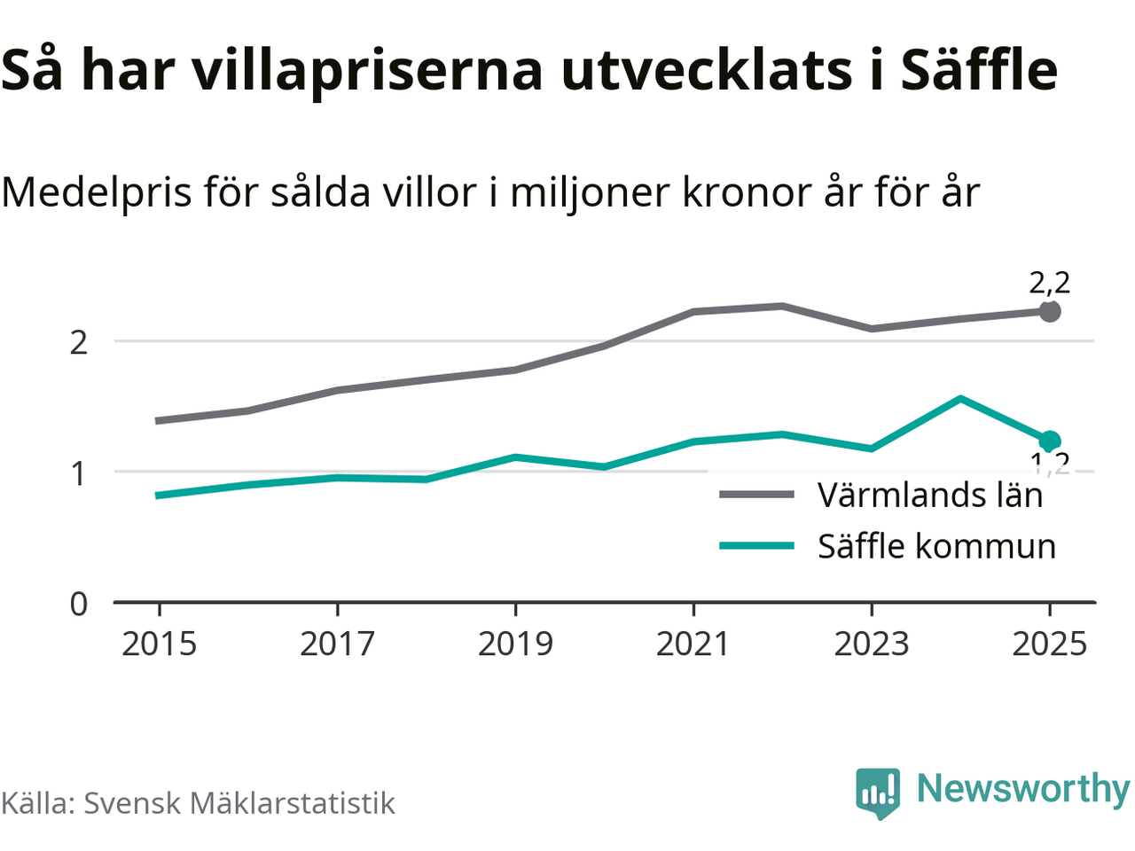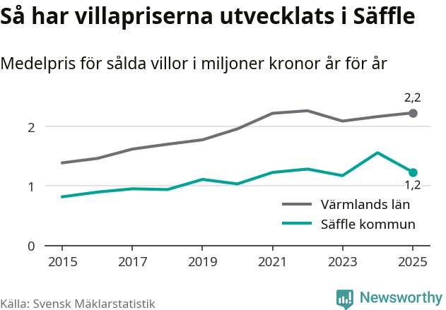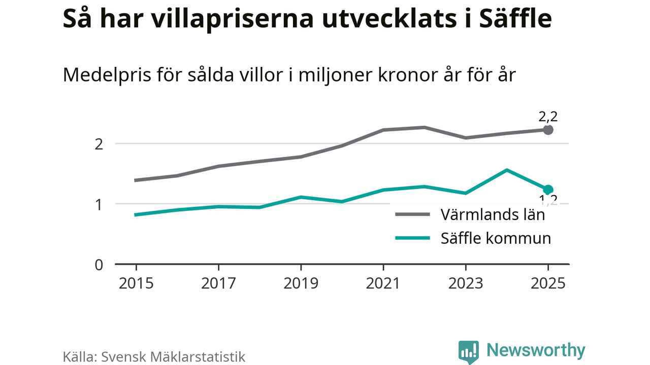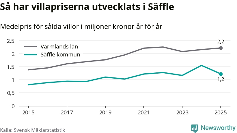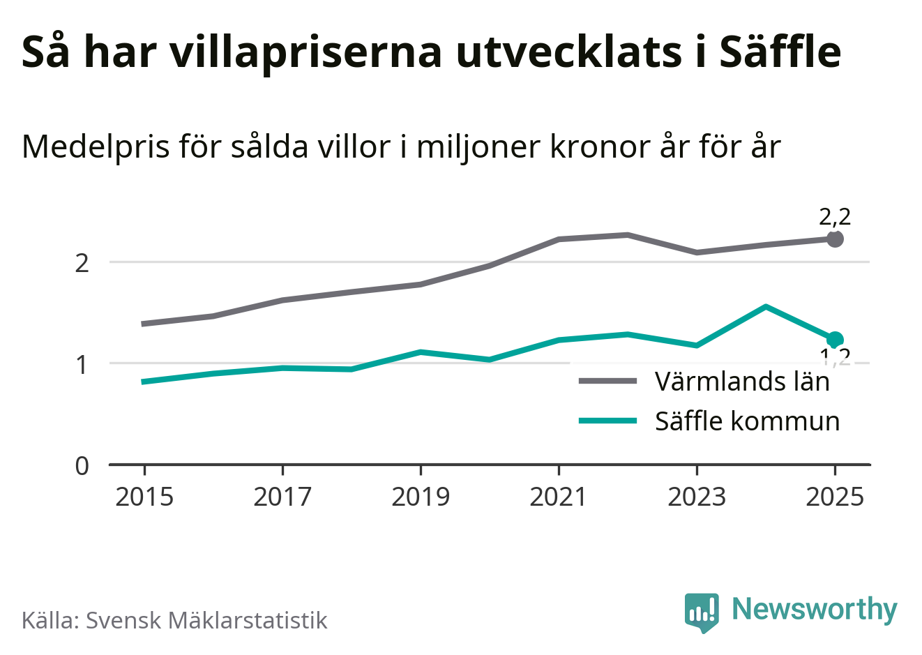 1,2 miljoner kronor är medelpriset för de villor som såldes i Säffle kommun under året, eller 10 986 kronor per kvadratmeter. Det innebär en prisminskning med 21 procent på ett år.