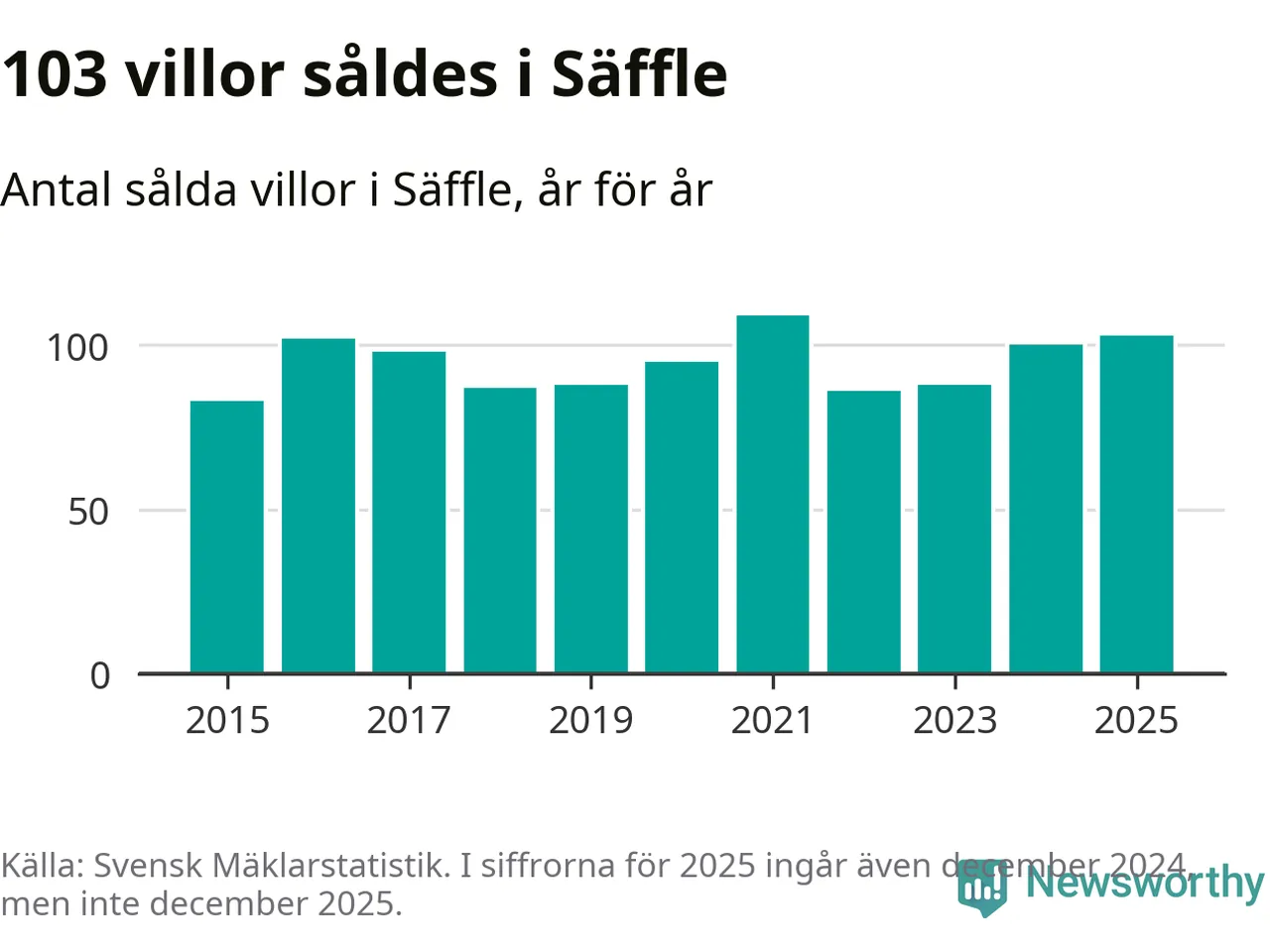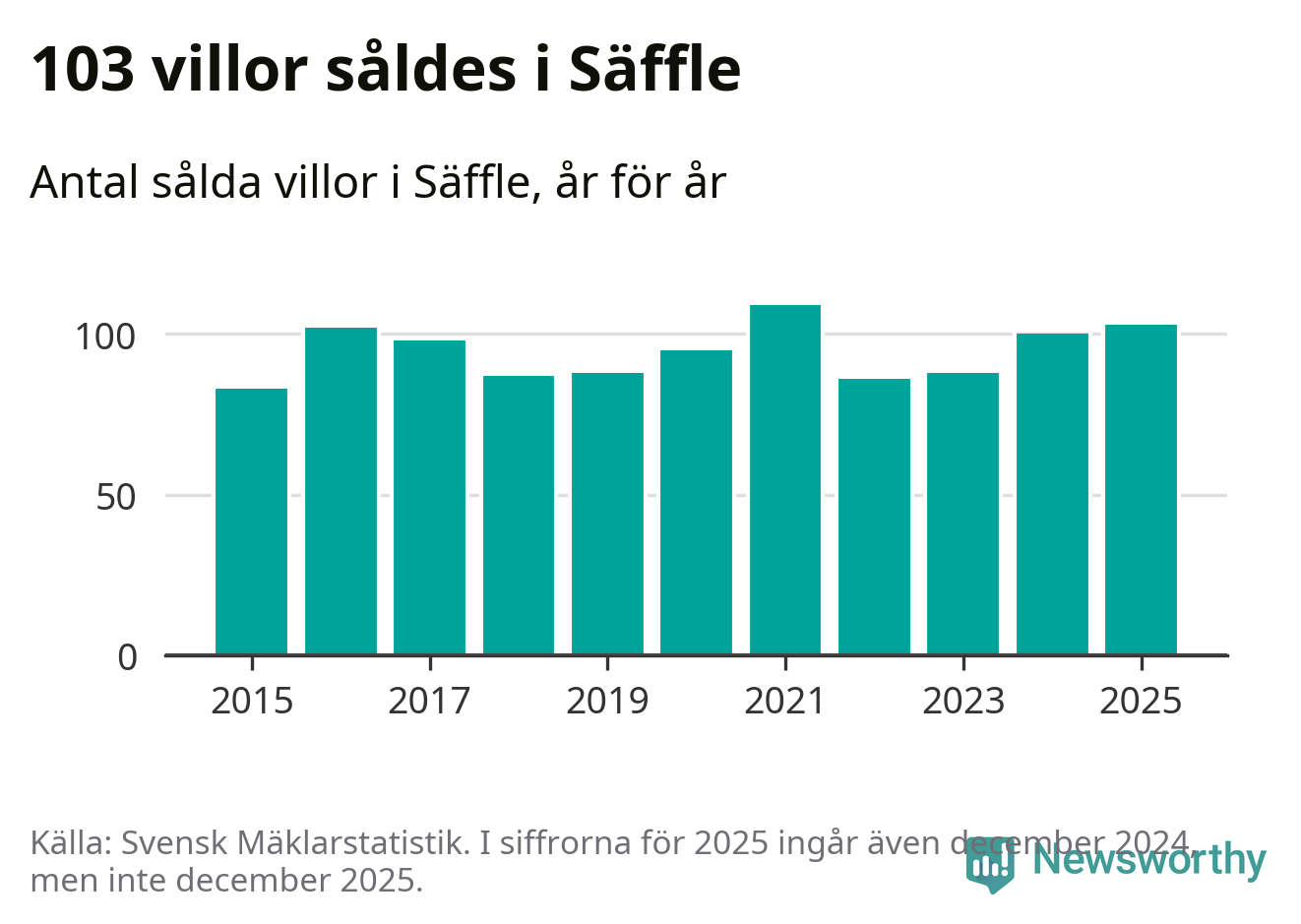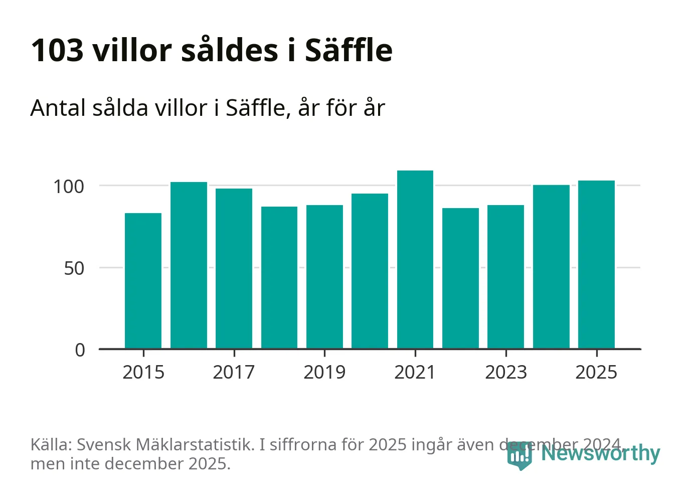 Däremot ökade antalet sålda villor något. Totalt såldes 103 villor, att jämföra med 100 under 2024. Det är tredje året i rad som antalet sålda villor ökar i kommunen.