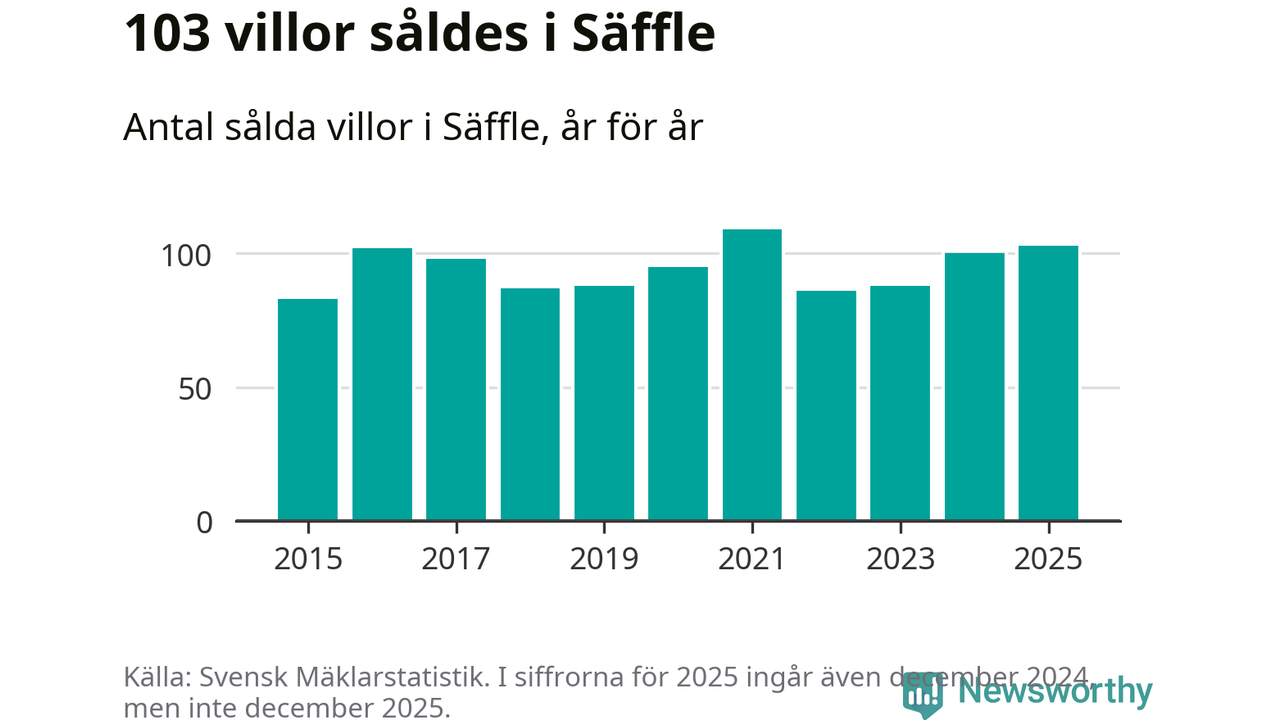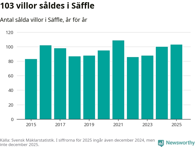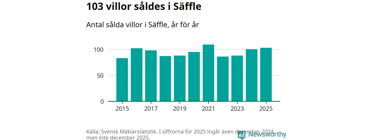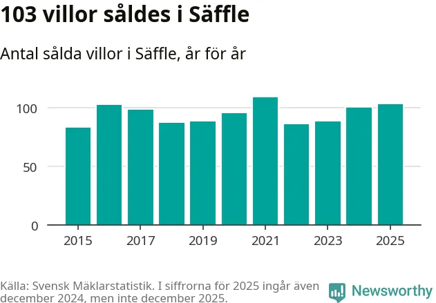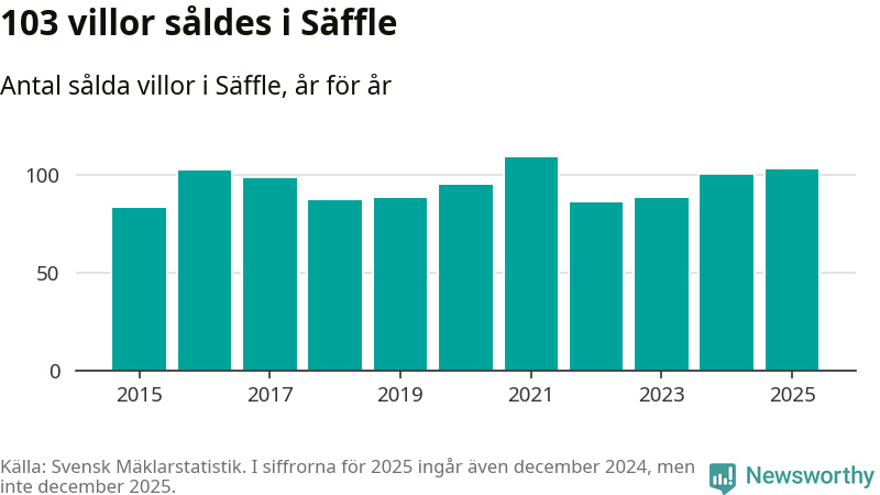 Däremot ökade antalet sålda villor något. Totalt såldes 103 villor, att jämföra med 100 under 2024. Det är tredje året i rad som antalet sålda villor ökar i kommunen.