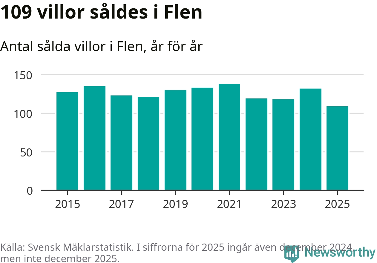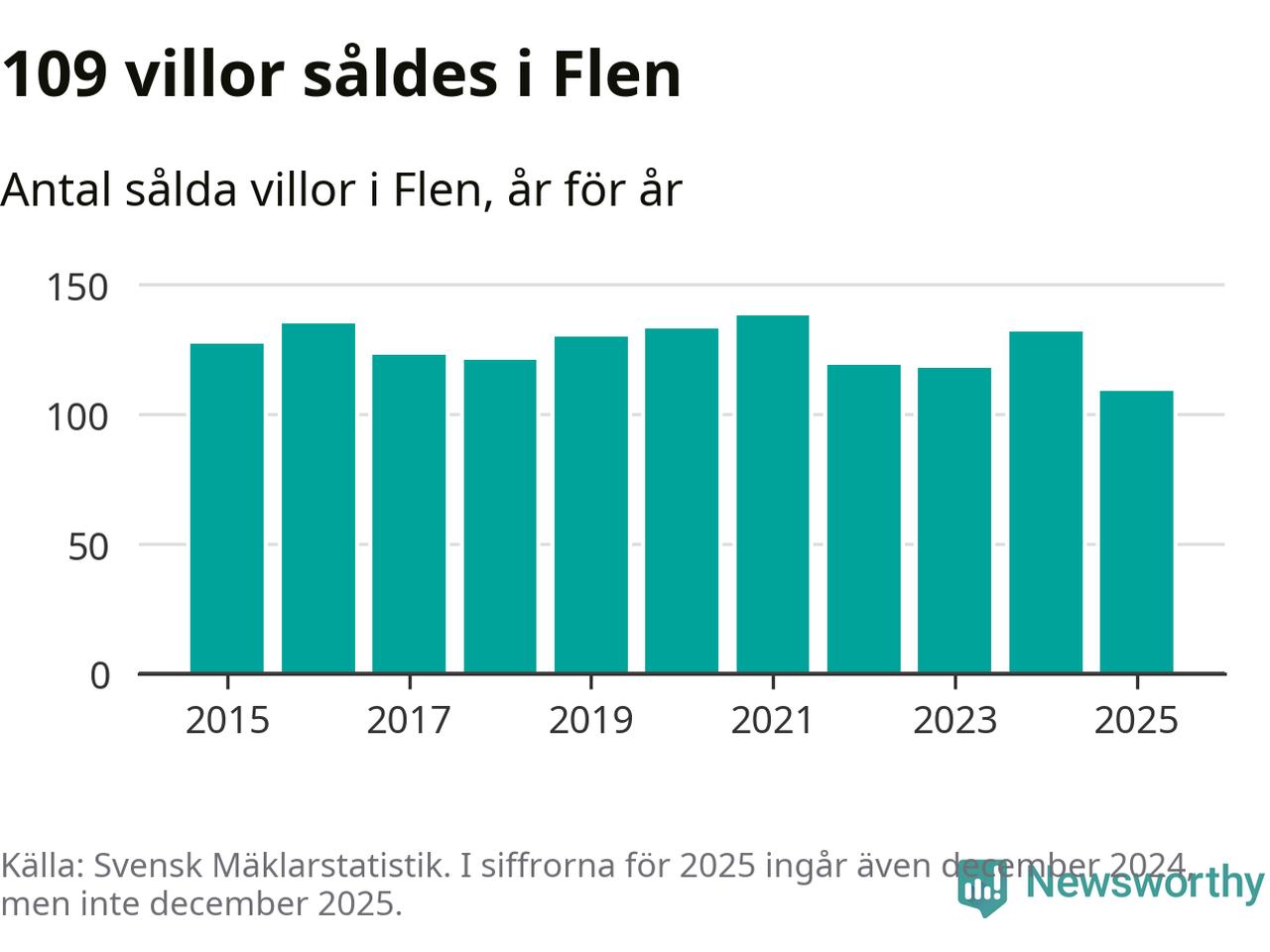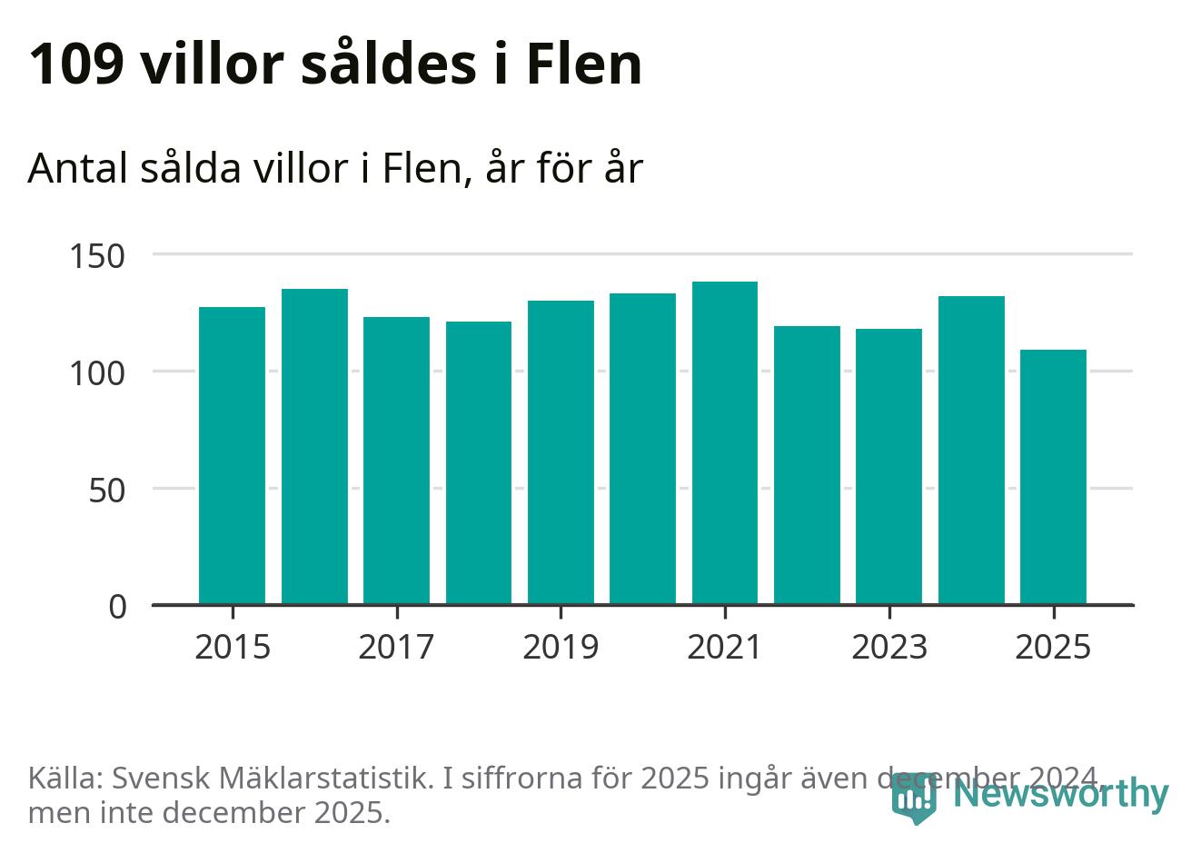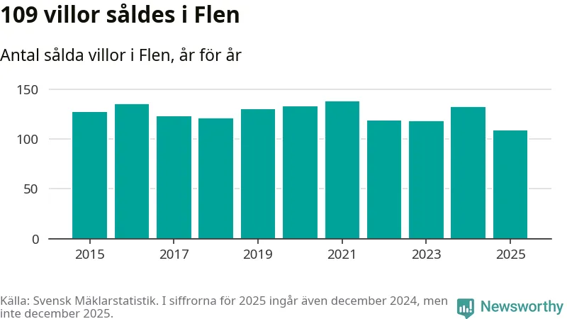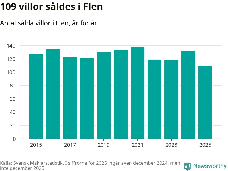 Antalet sålda villor minskade också. Totalt såldes 109 villor, att jämföra med 132 under 2024. Det är färre än något annat år sedan 2015.