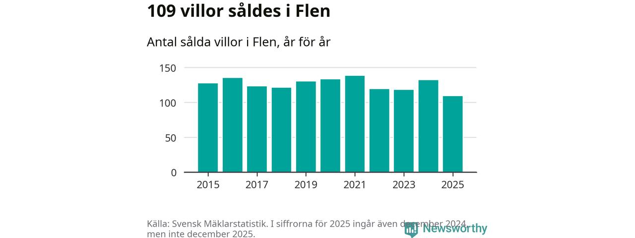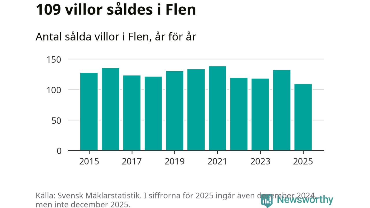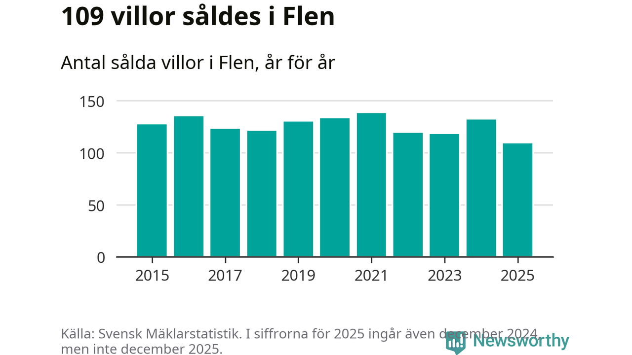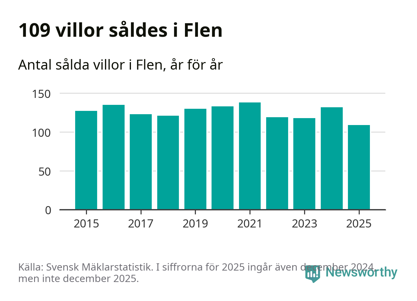 Antalet sålda villor minskade också. Totalt såldes 109 villor, att jämföra med 132 under 2024. Det är färre än något annat år sedan 2015.