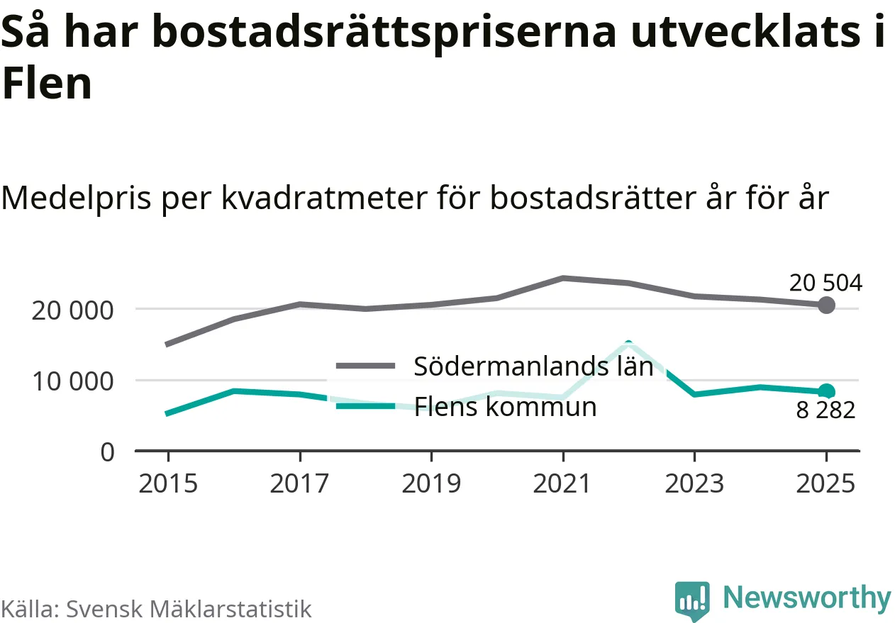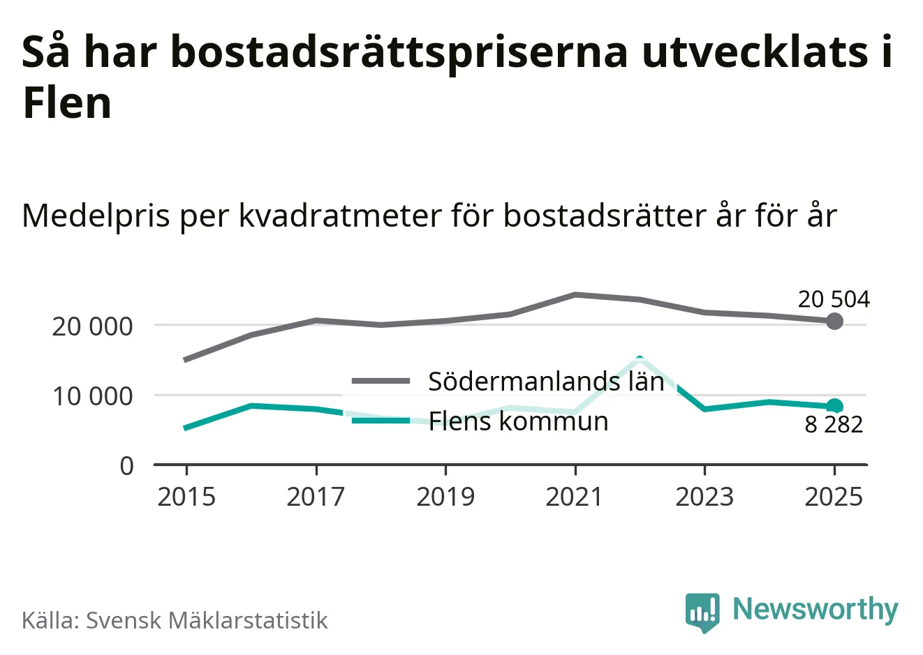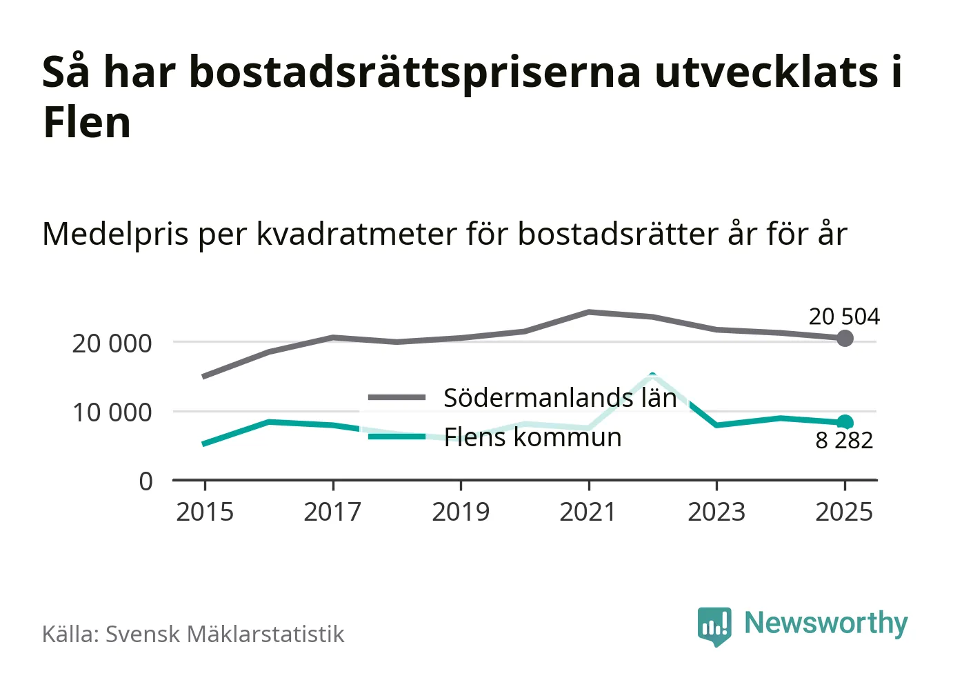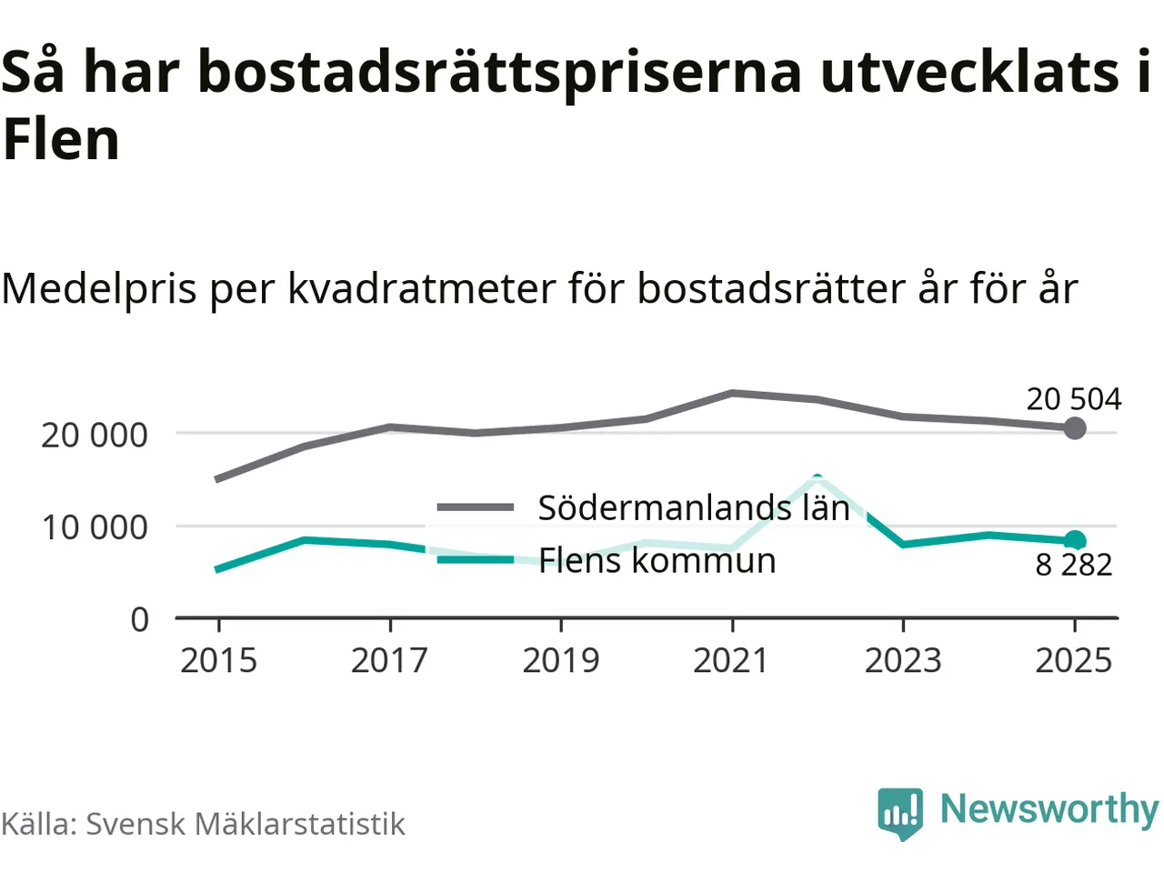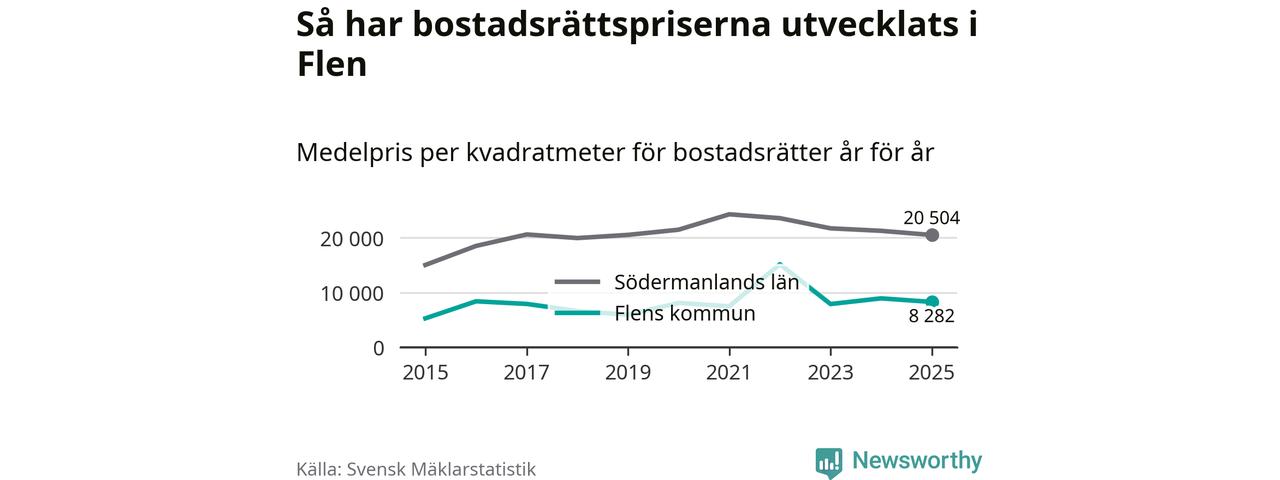 Det såldes totalt 38 bostadsrätter i Flens kommun under året. Genomsnittspriset per kvadratmeter landade på 8 282 kronor. Det är en minskning med sju procent i kommunen på ett år.