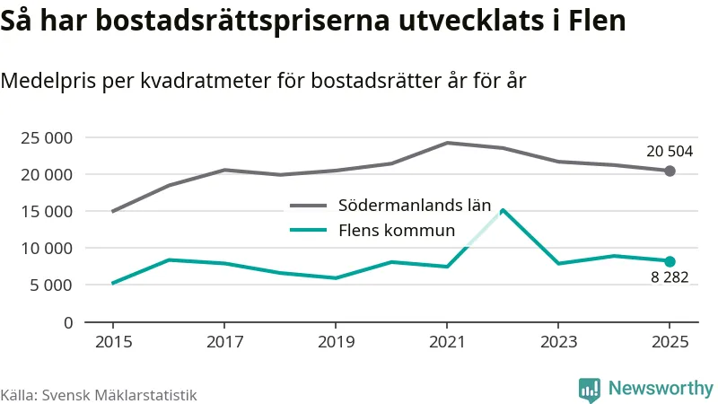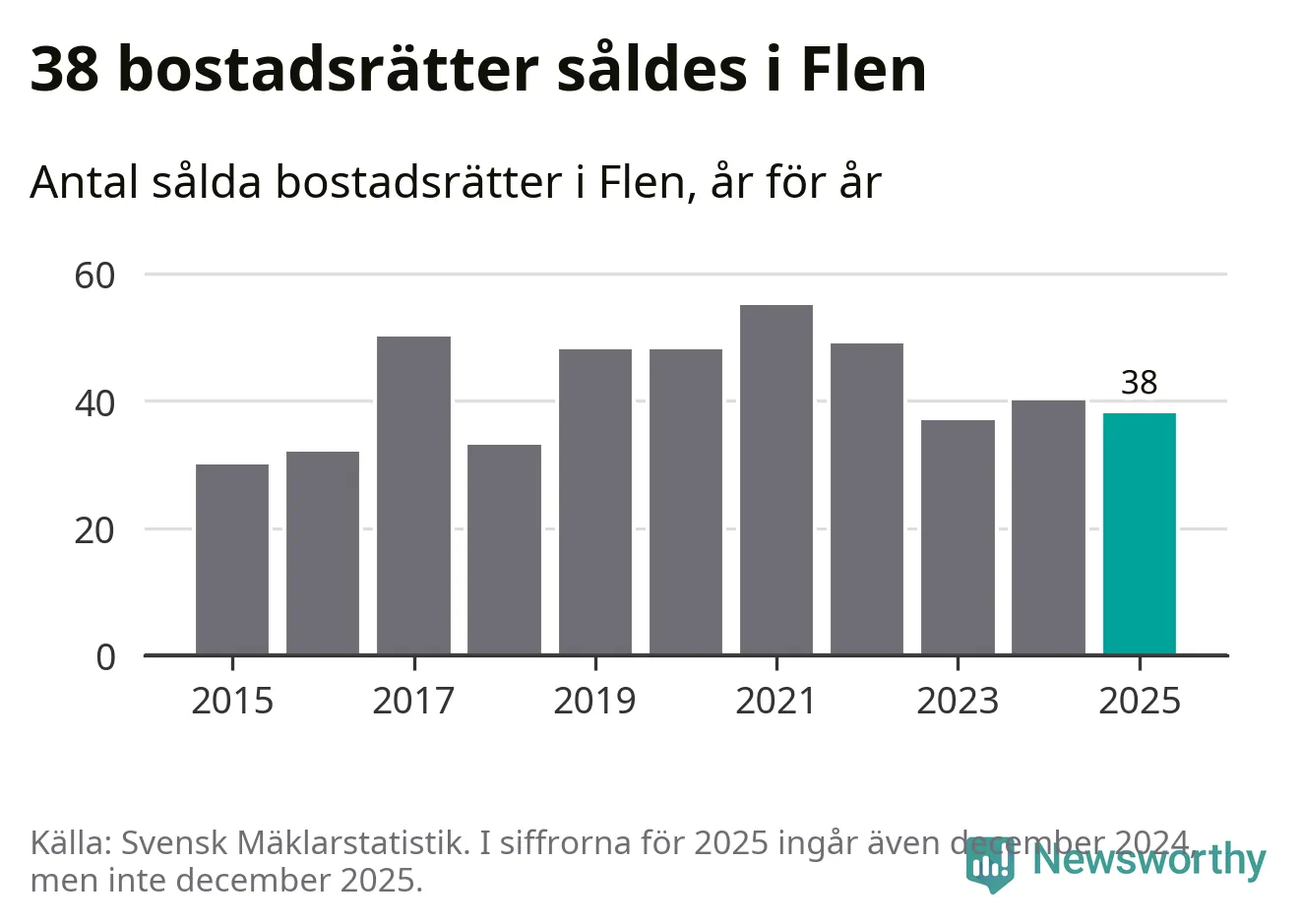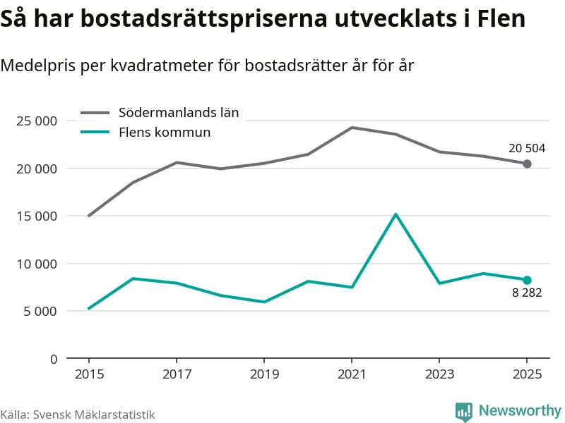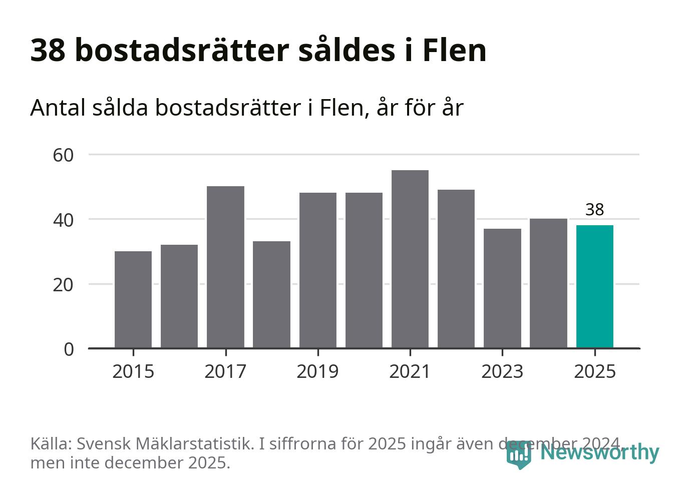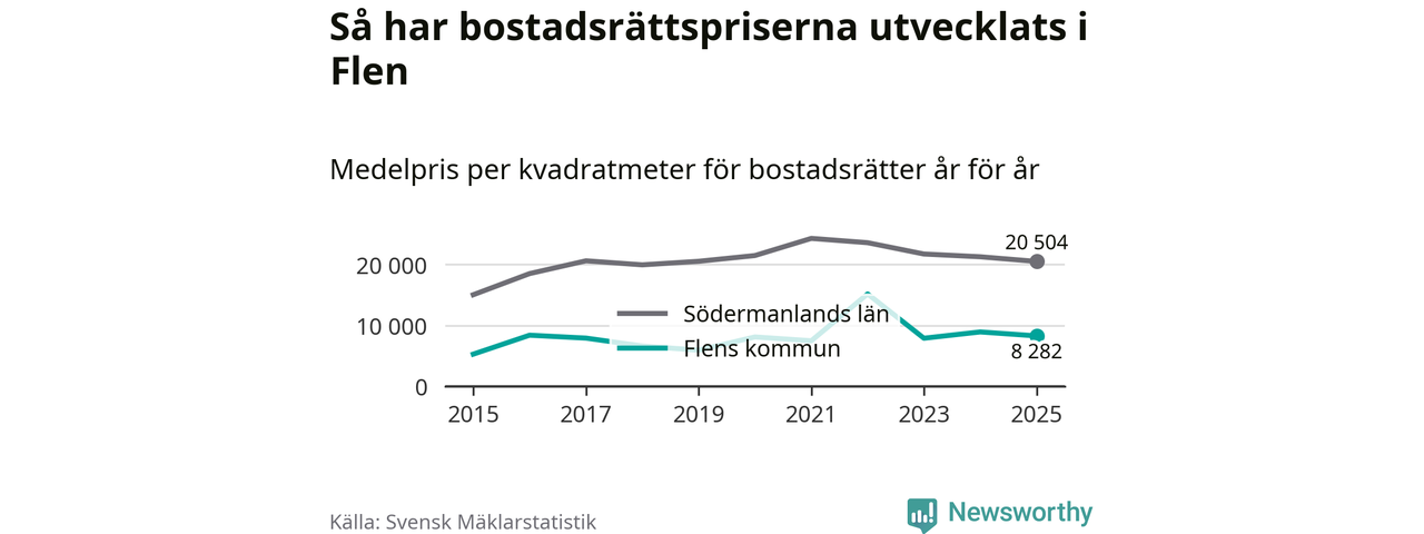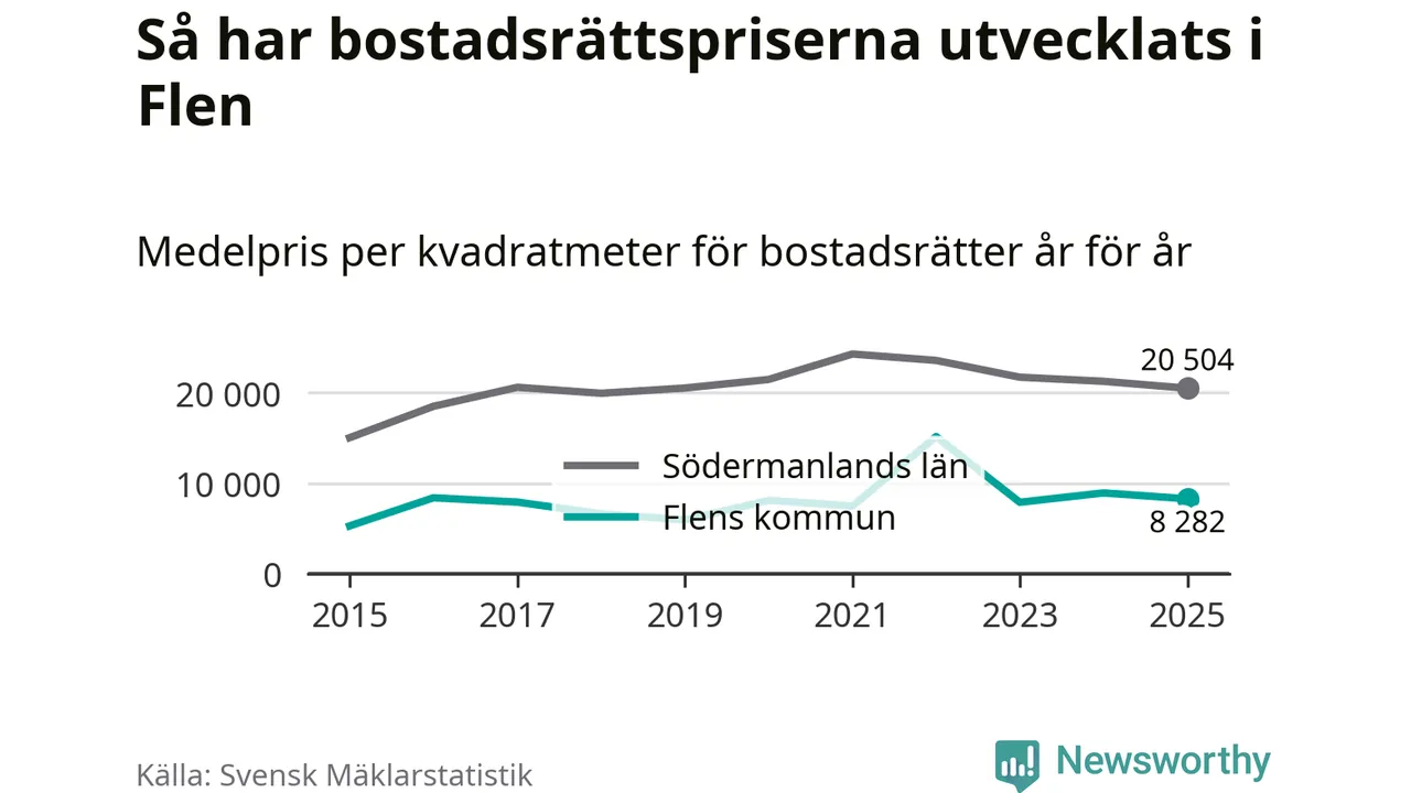 Det såldes totalt 38 bostadsrätter i Flens kommun under året. Genomsnittspriset per kvadratmeter landade på 8 282 kronor. Det är en minskning med sju procent i kommunen på ett år.