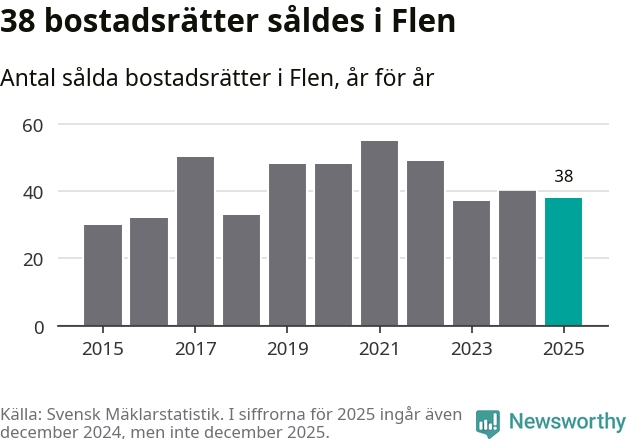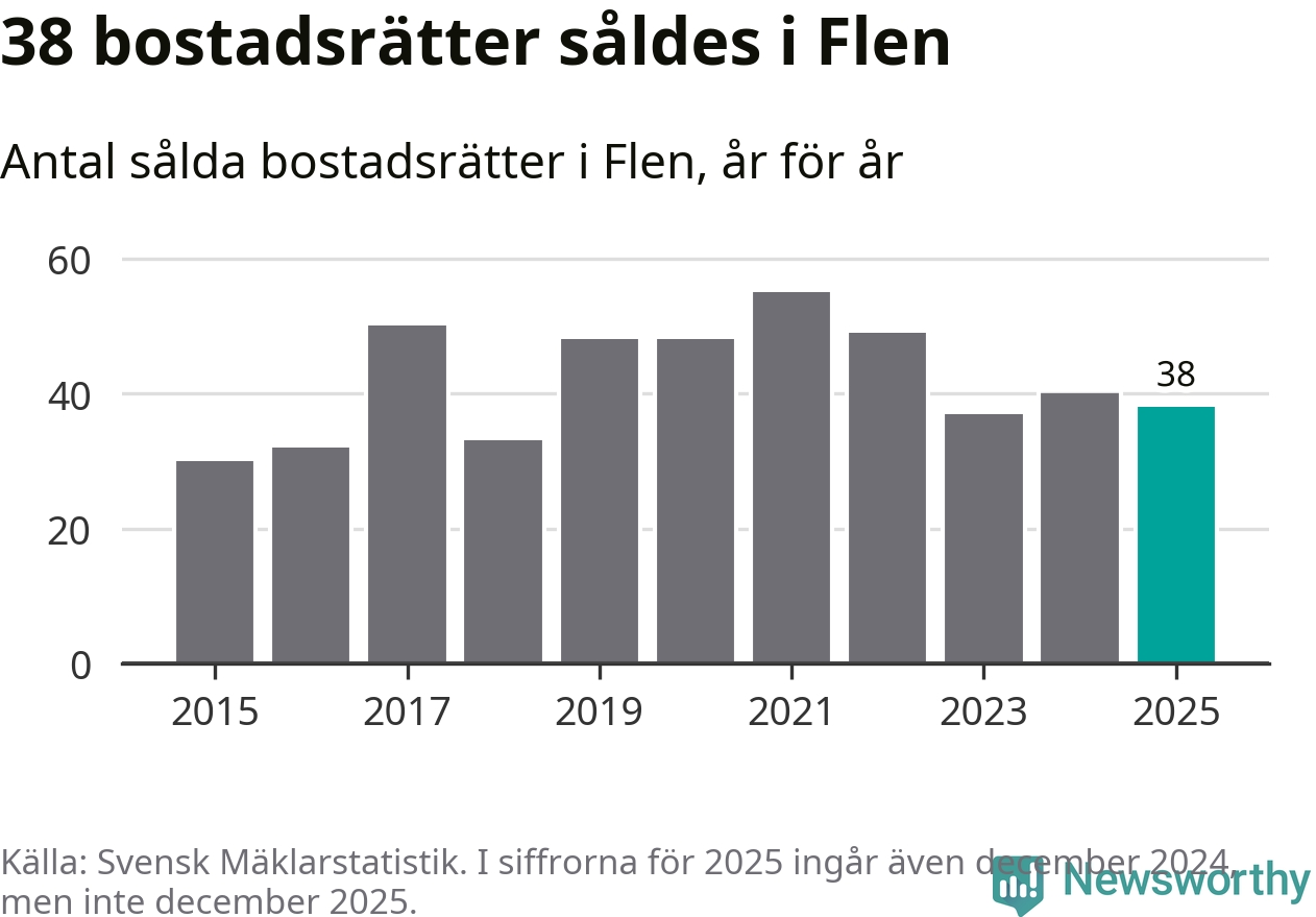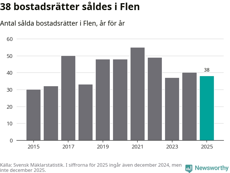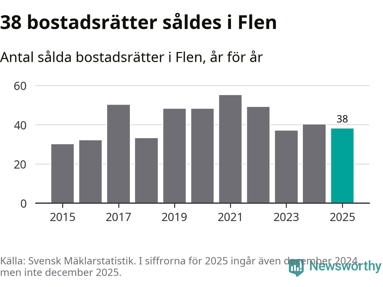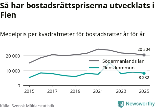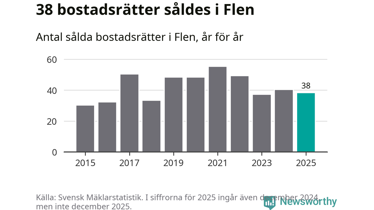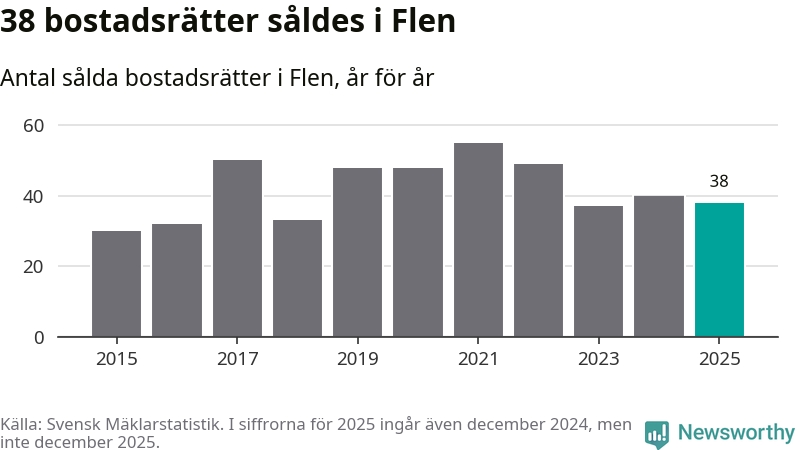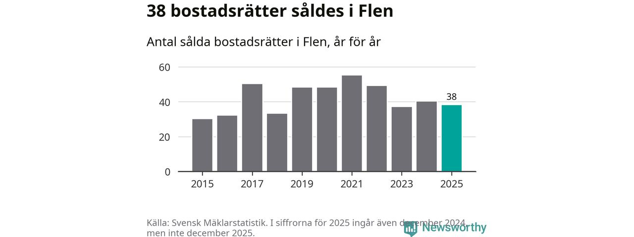 Det såldes totalt 38 bostadsrätter i Flens kommun under året. Genomsnittspriset per kvadratmeter landade på 8 282 kronor. Det är en minskning med sju procent i kommunen på ett år.