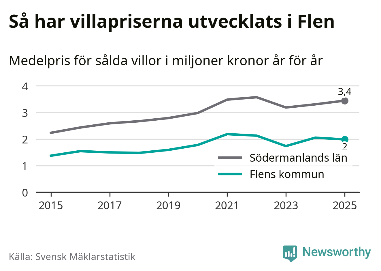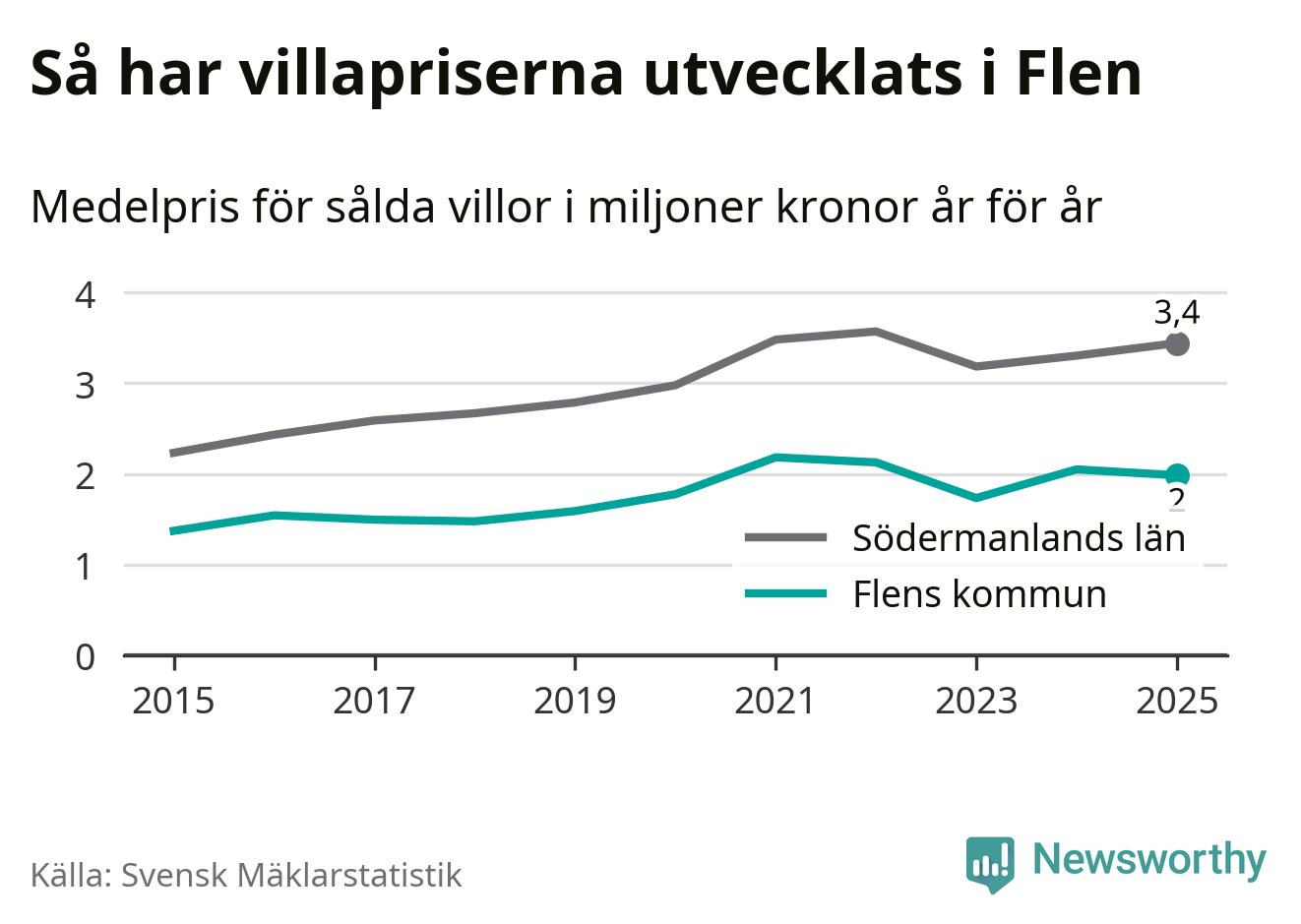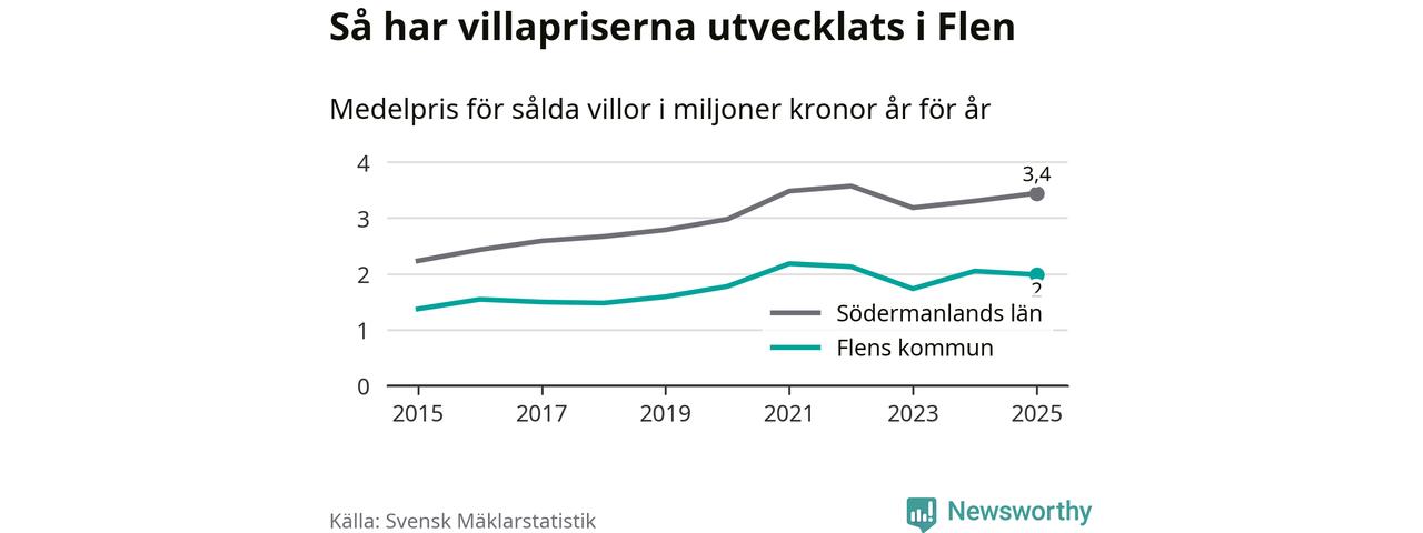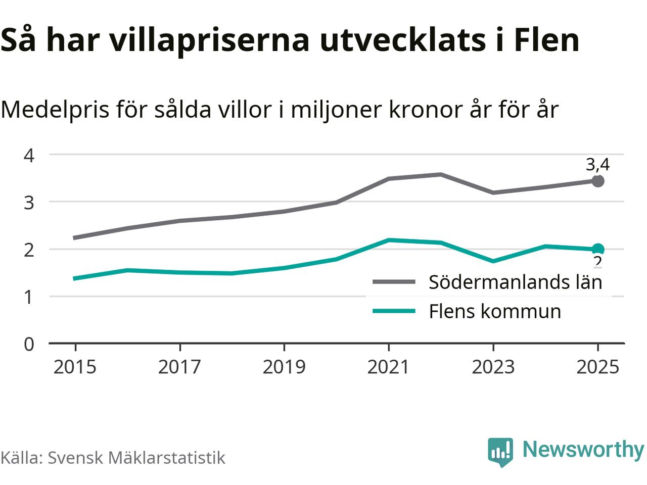 Två miljoner kronor är medelpriset för de villor som såldes i Flens kommun under året, eller 18 467 kronor per kvadratmeter. Det innebär en prisminskning med tre procent på ett år.