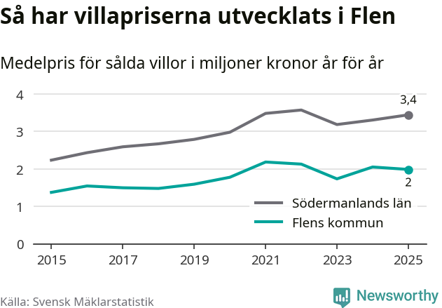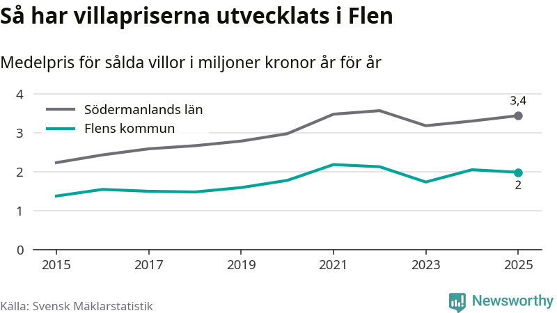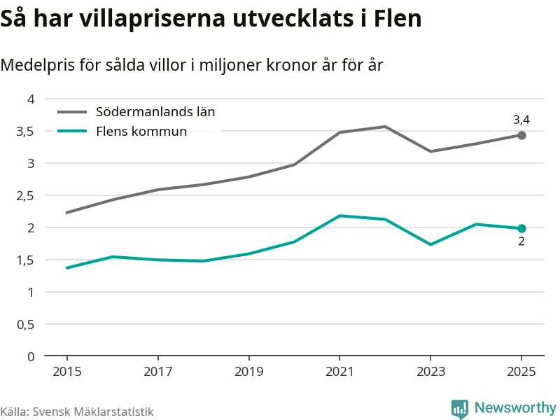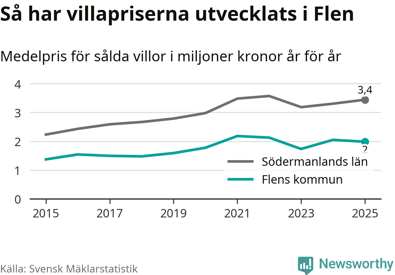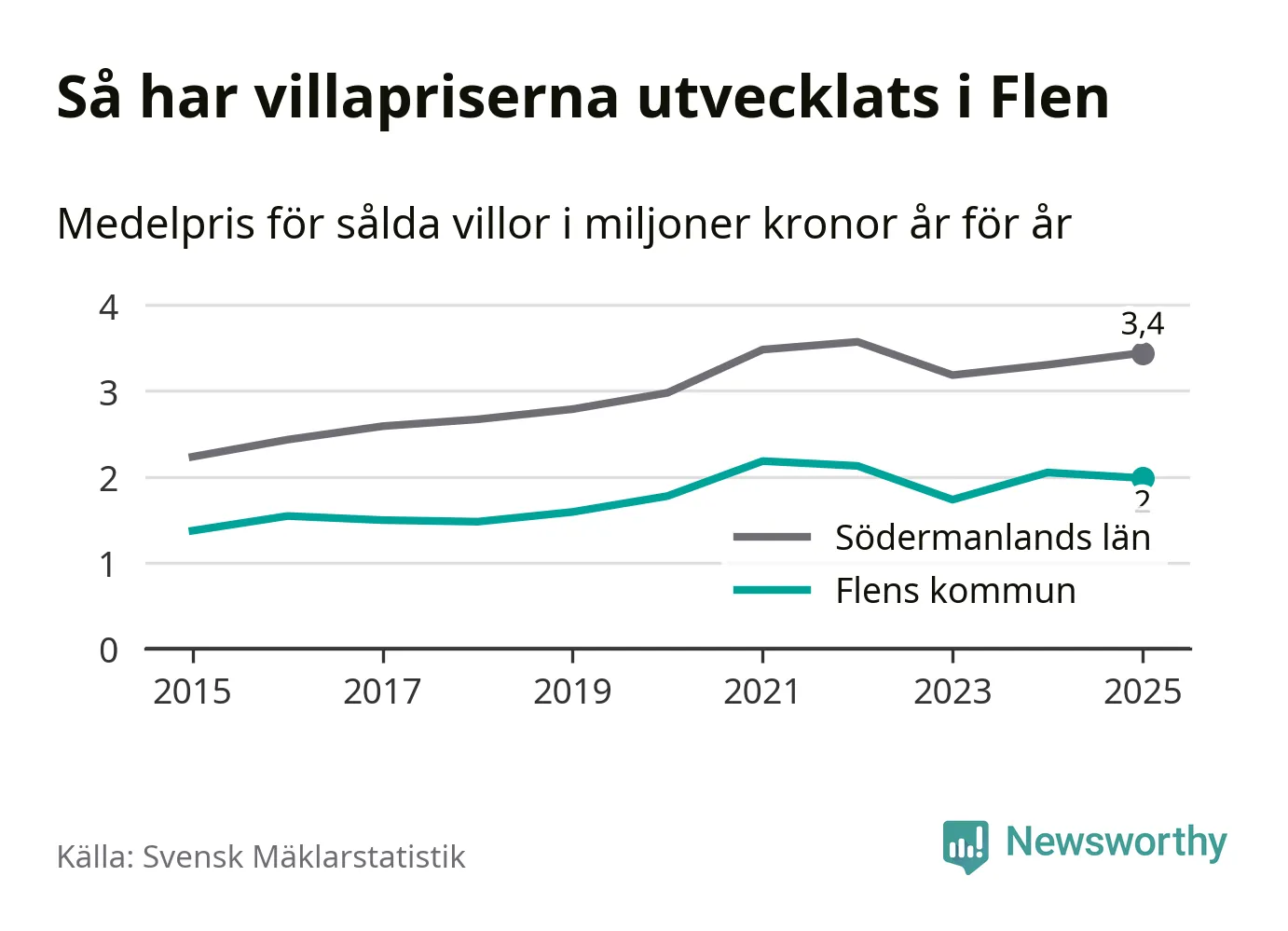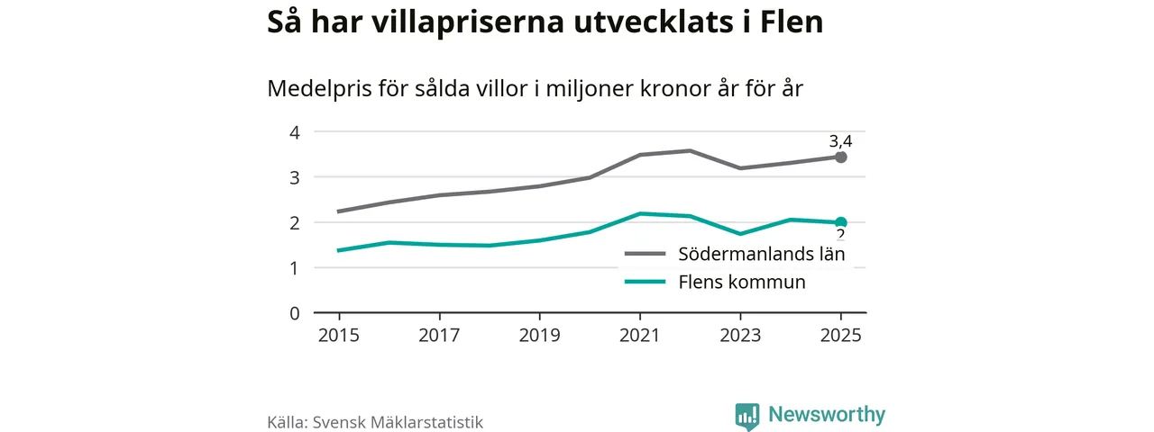 Två miljoner kronor är medelpriset för de villor som såldes i Flens kommun under året, eller 18 467 kronor per kvadratmeter. Det innebär en prisminskning med tre procent på ett år.