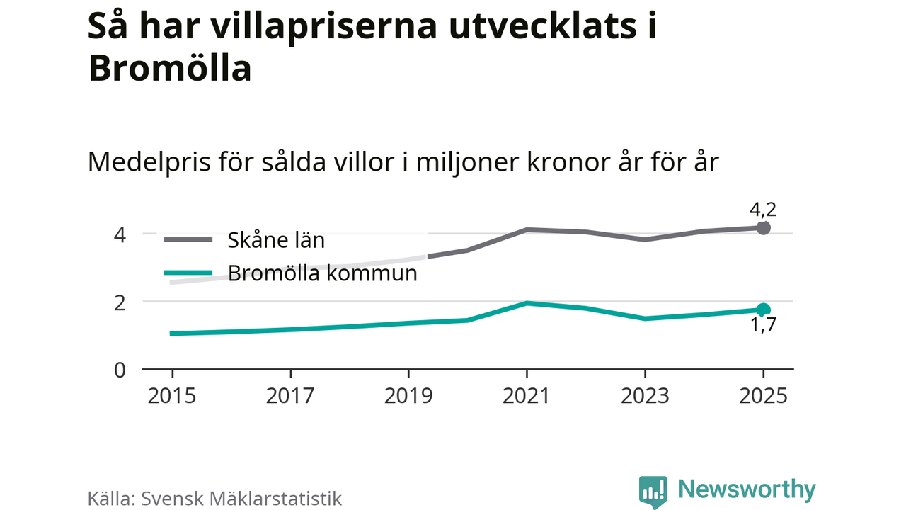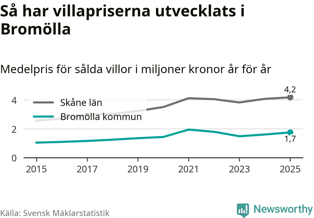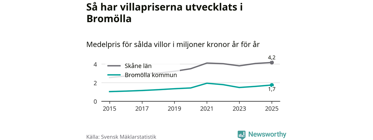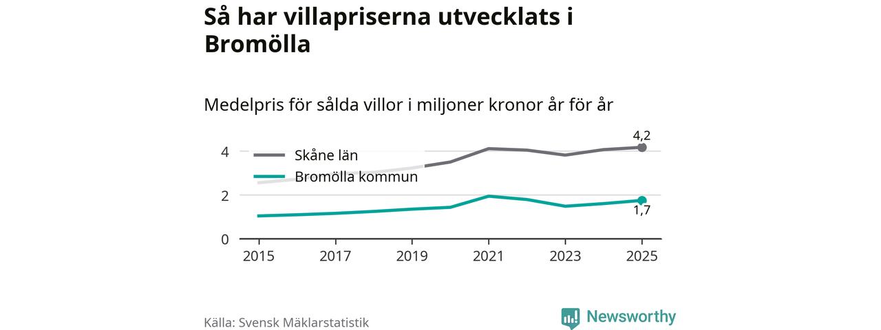 1,7 miljoner kronor är medelpriset för de villor som såldes i Bromölla kommun under året, eller 14 619 kronor per kvadratmeter. Det innebär en prisökning med nio procent på ett år och är andra året i rad som priserna ökar i kommunen.