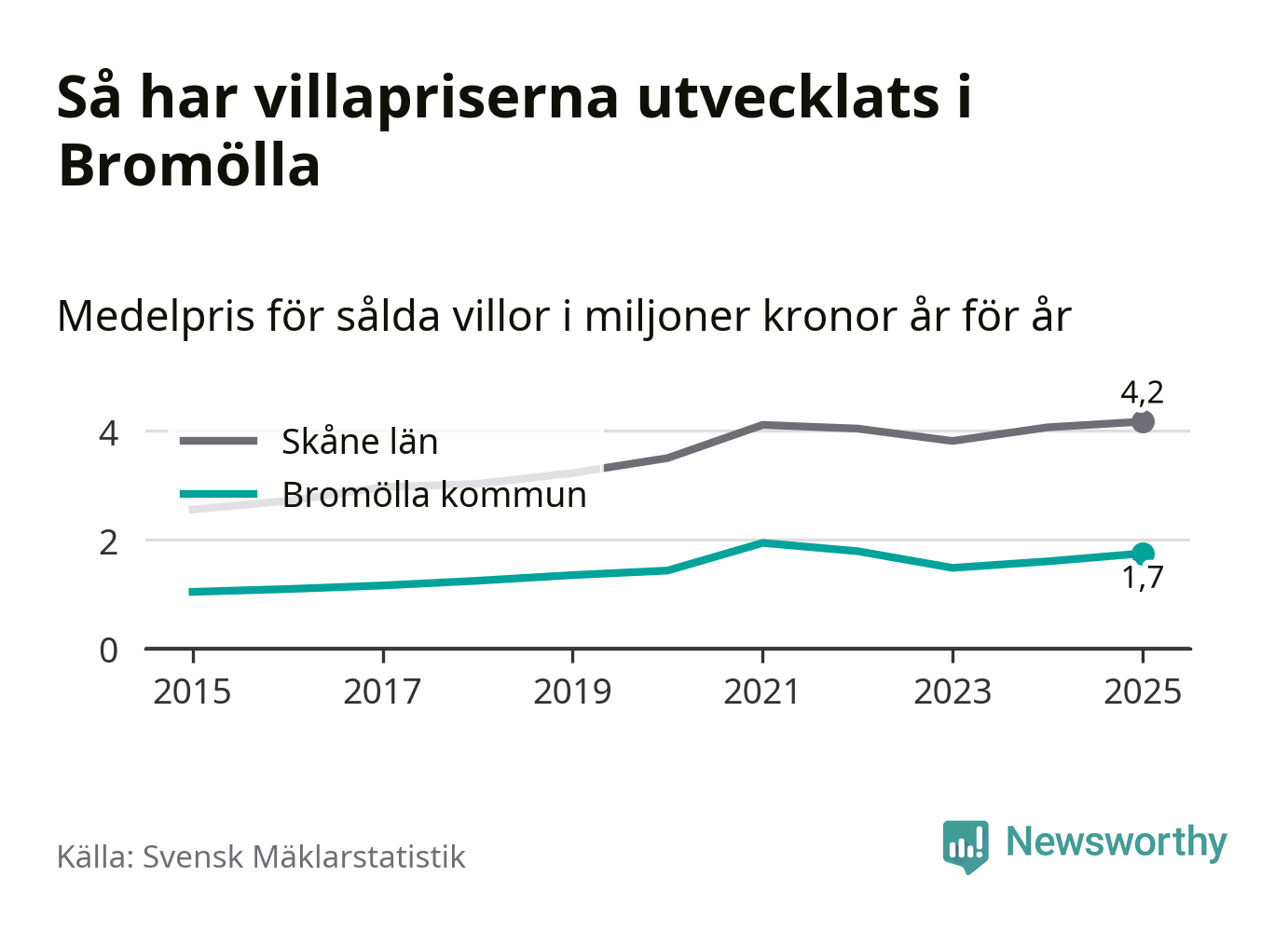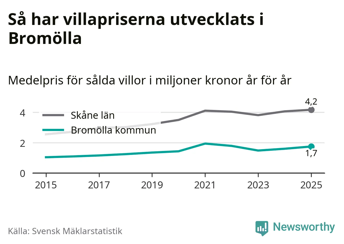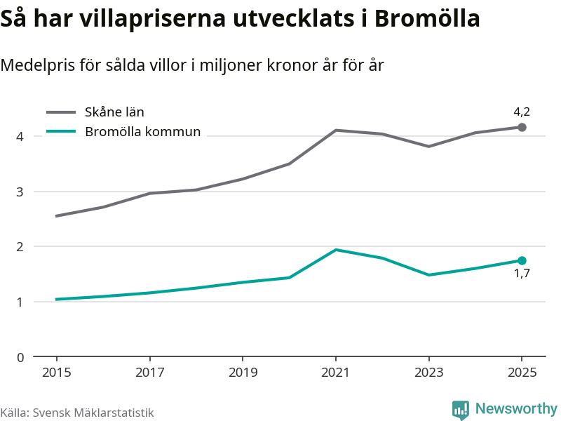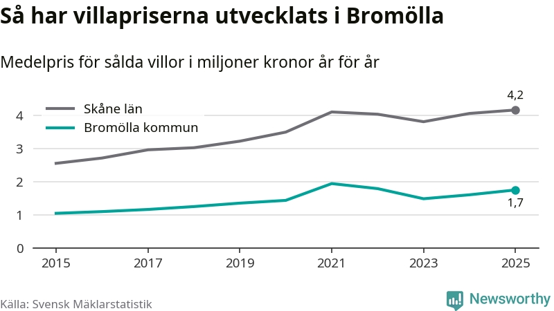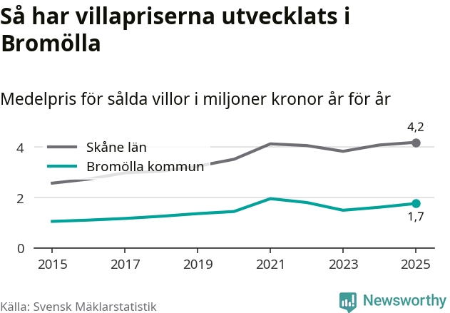 1,7 miljoner kronor är medelpriset för de villor som såldes i Bromölla kommun under året, eller 14 619 kronor per kvadratmeter. Det innebär en prisökning med nio procent på ett år och är andra året i rad som priserna ökar i kommunen.
