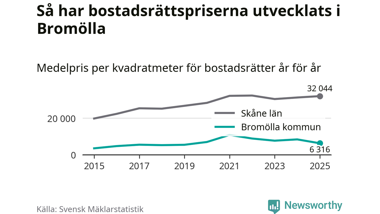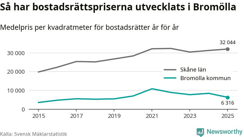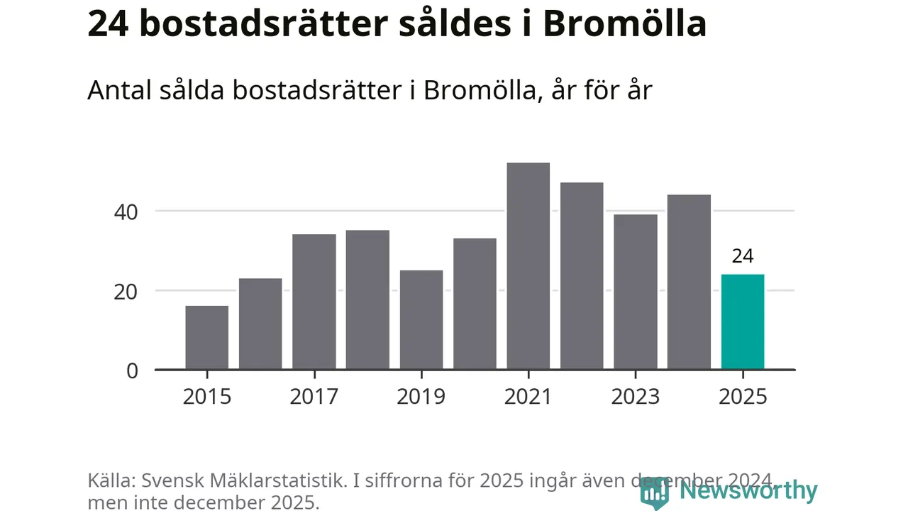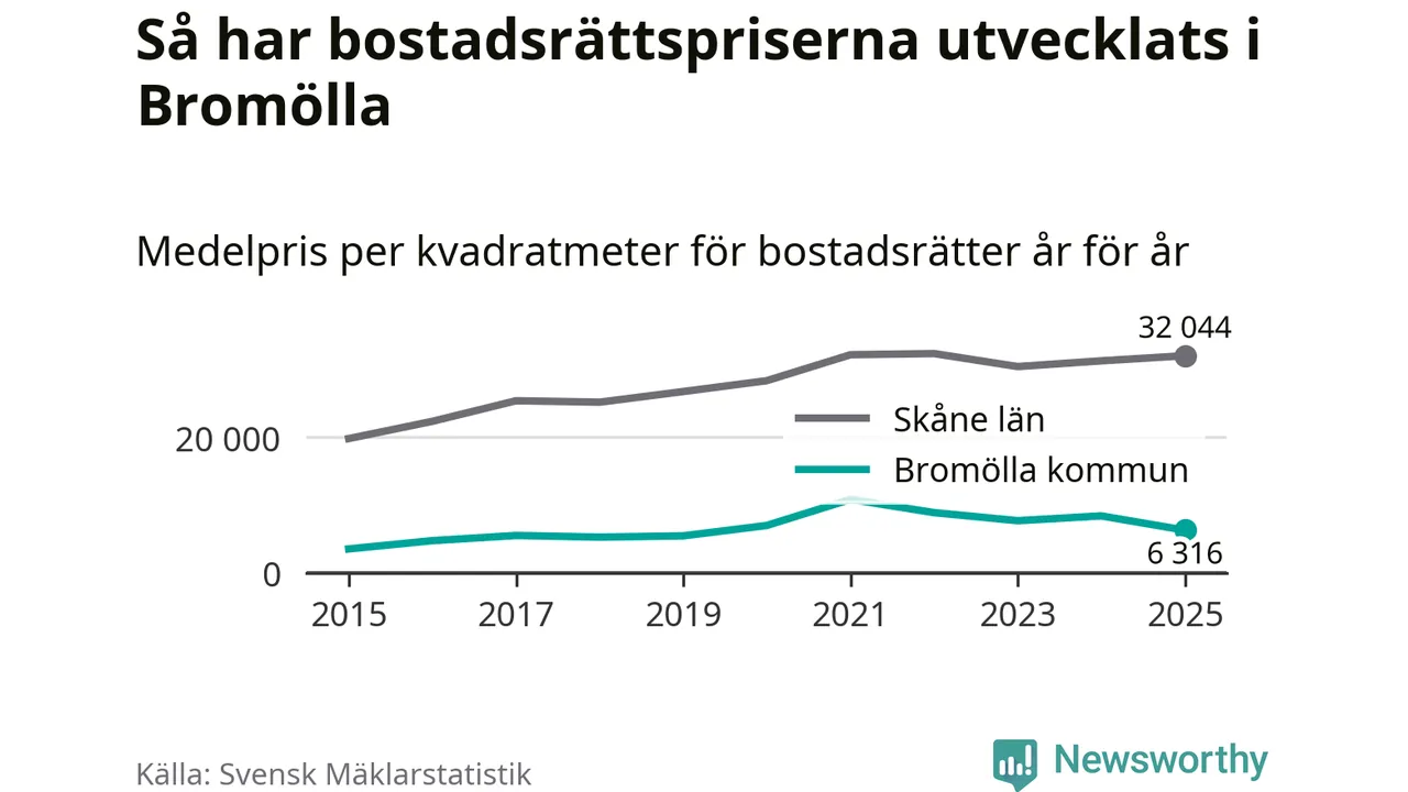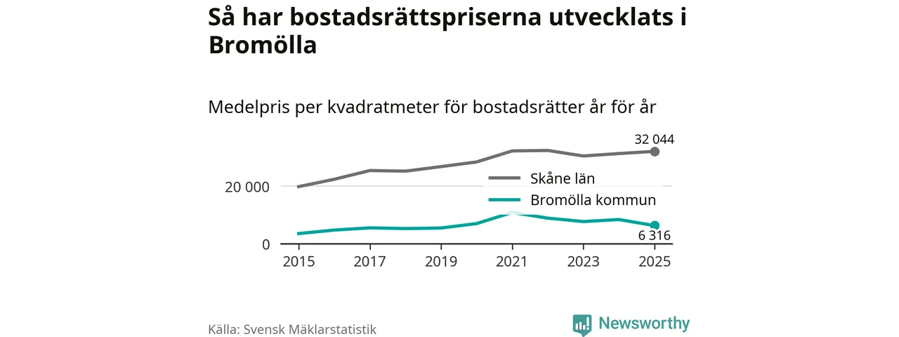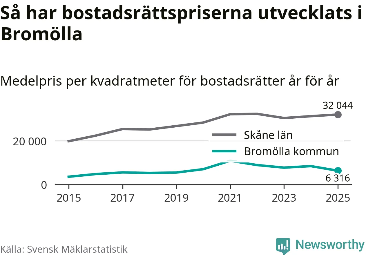 Det såldes totalt 24 bostadsrätter i Bromölla kommun under året. Genomsnittspriset per kvadratmeter landade på 6 316 kronor. Det är en minskning med 25 procent i kommunen på ett år.