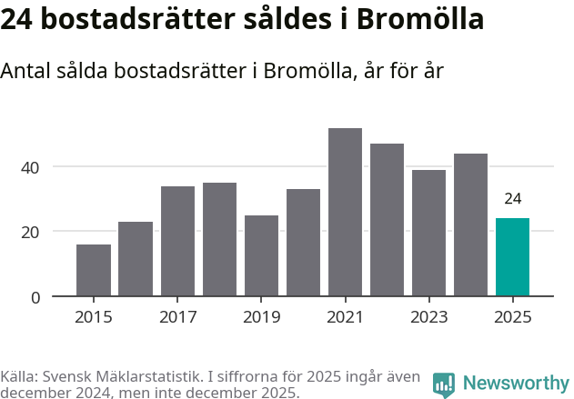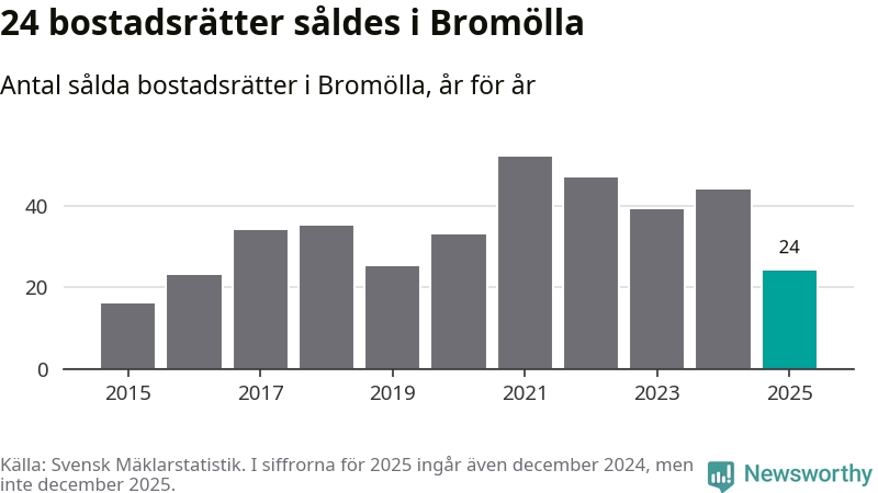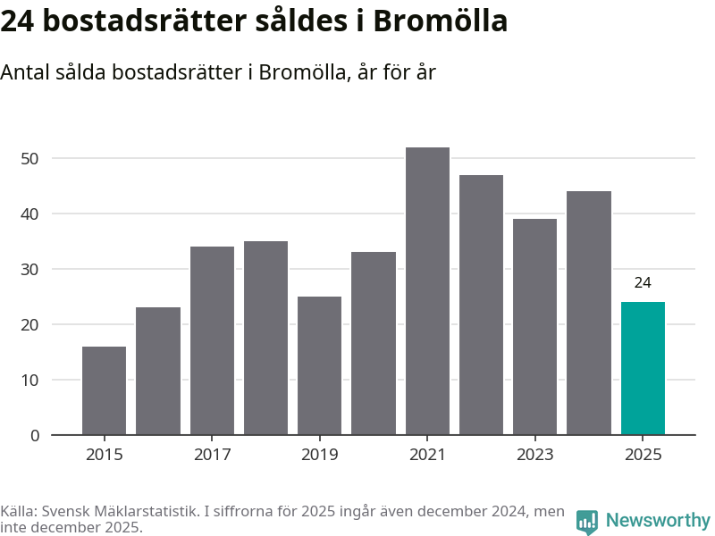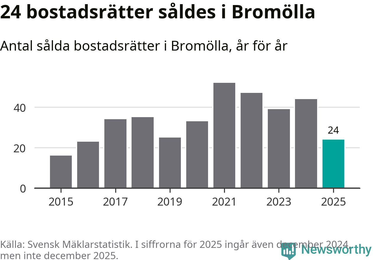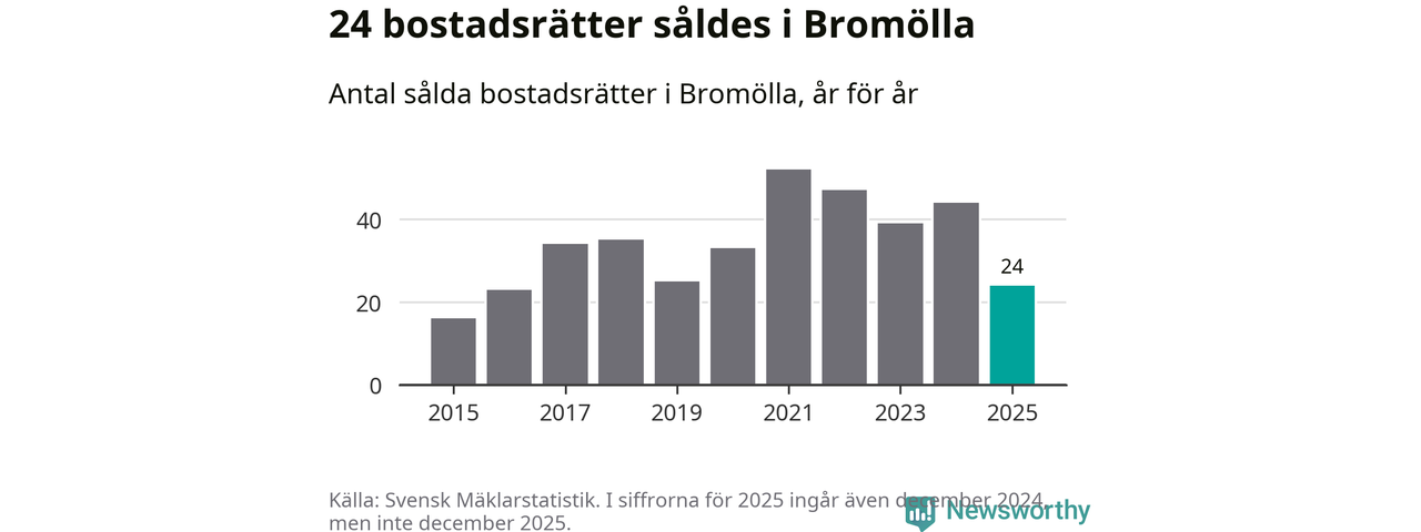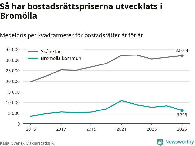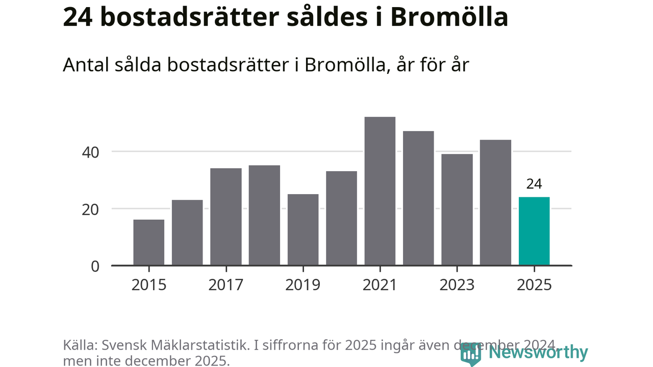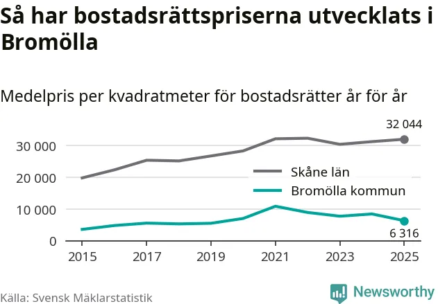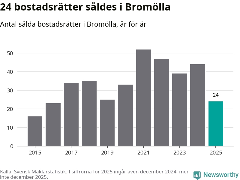 Det såldes totalt 24 bostadsrätter i Bromölla kommun under året. Genomsnittspriset per kvadratmeter landade på 6 316 kronor. Det är en minskning med 25 procent i kommunen på ett år.