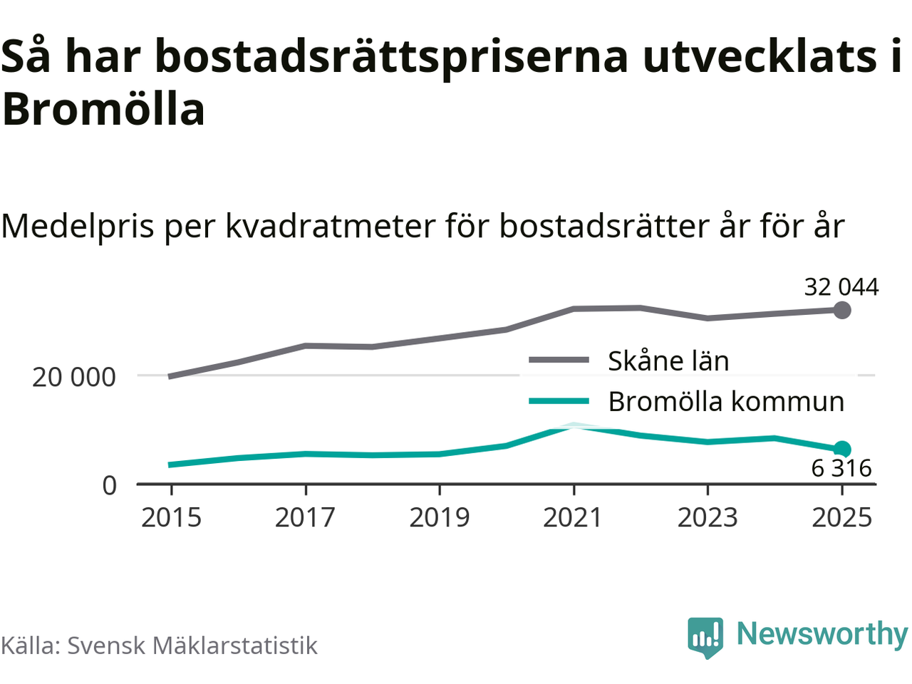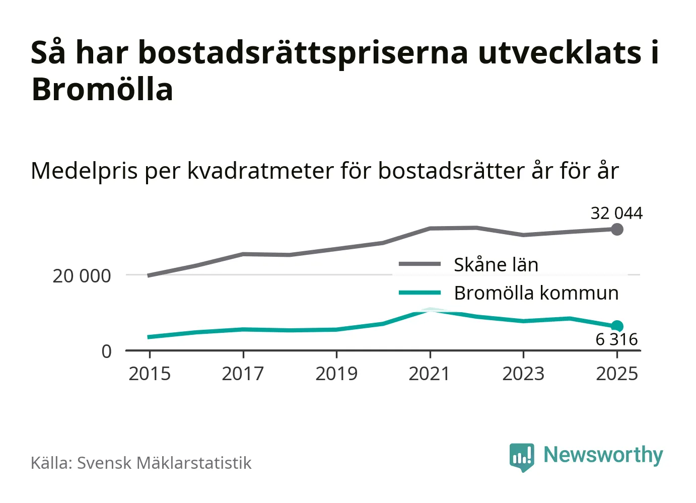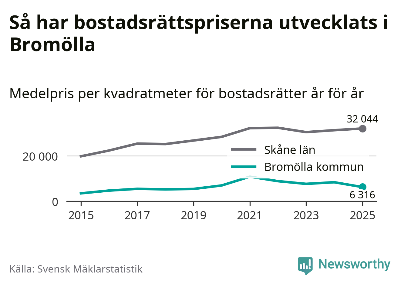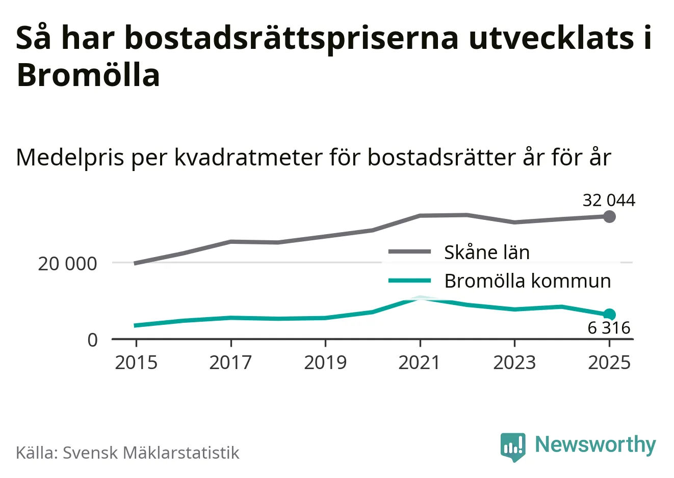 Det såldes totalt 24 bostadsrätter i Bromölla kommun under året. Genomsnittspriset per kvadratmeter landade på 6 316 kronor. Det är en minskning med 25 procent i kommunen på ett år.