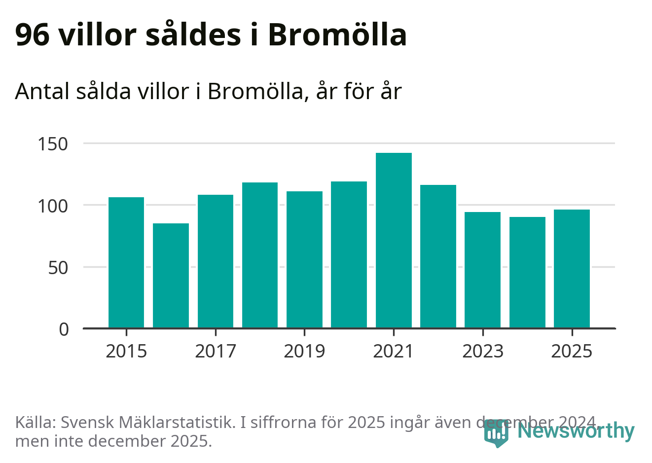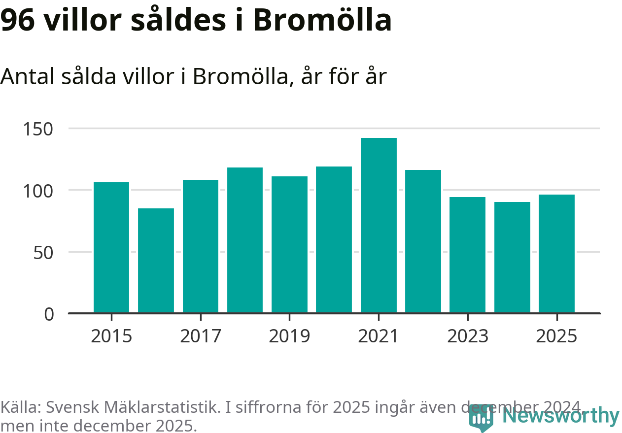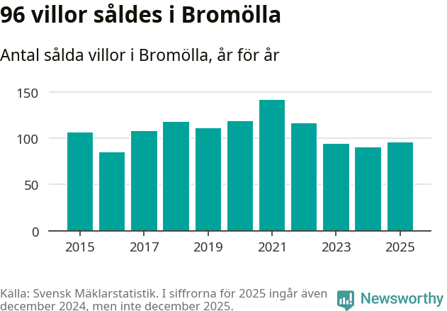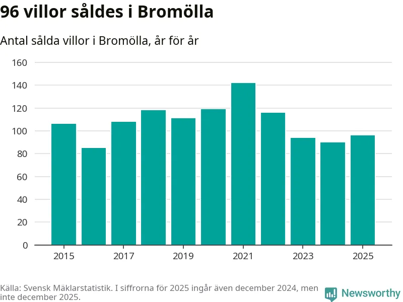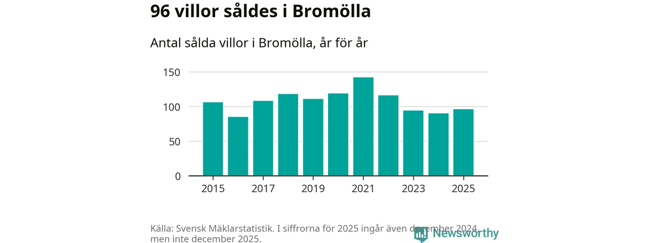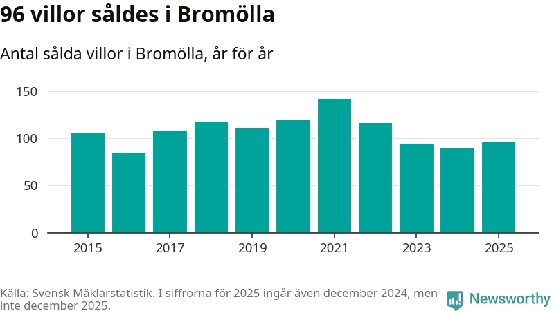 Antalet sålda villor ökade också. Totalt såldes 96 villor, att jämföra med 90 under 2024.