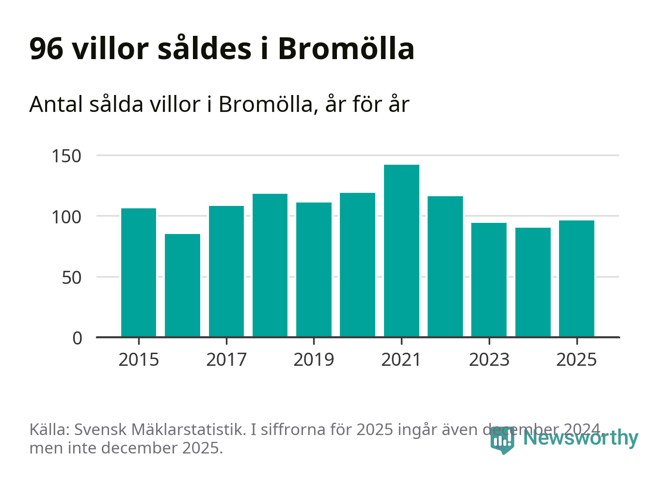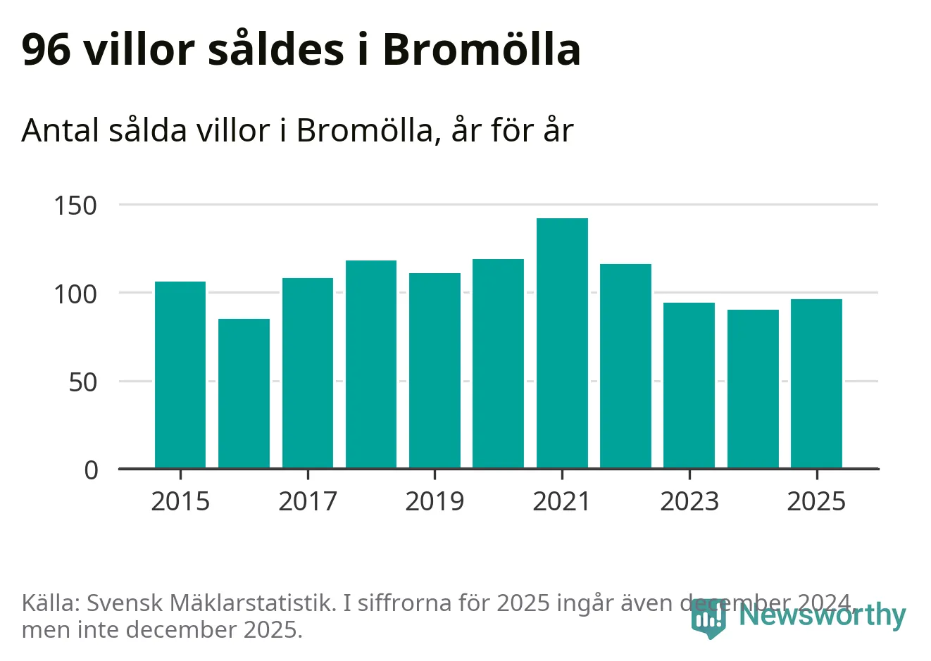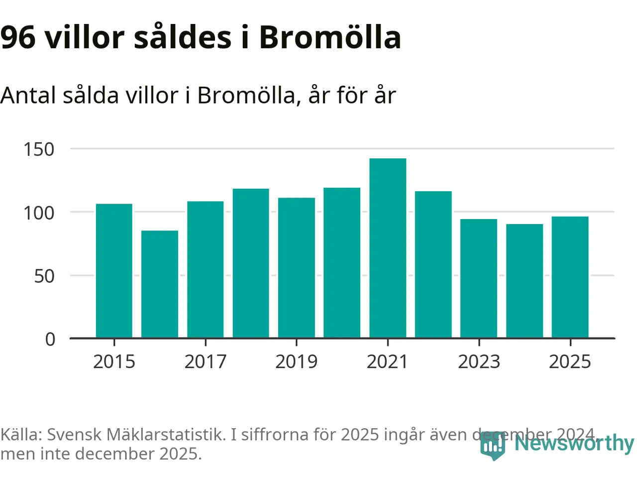 Antalet sålda villor ökade också. Totalt såldes 96 villor, att jämföra med 90 under 2024.