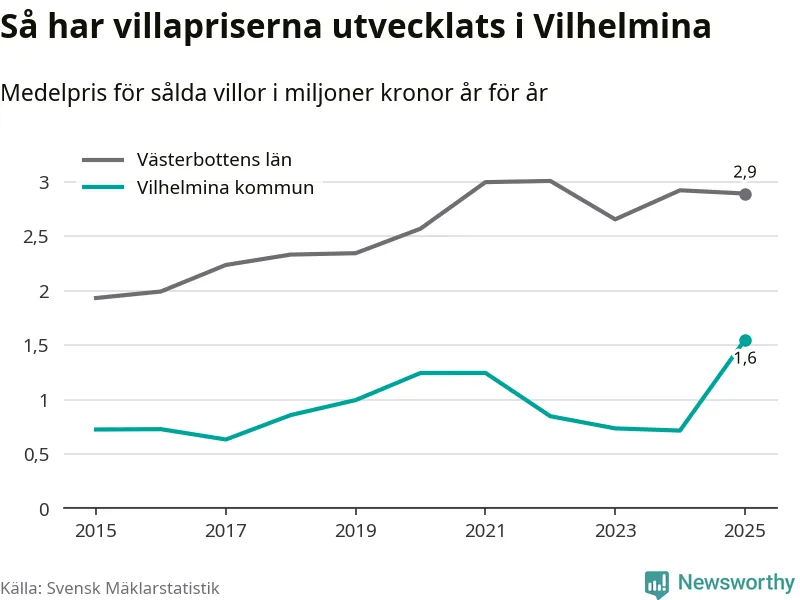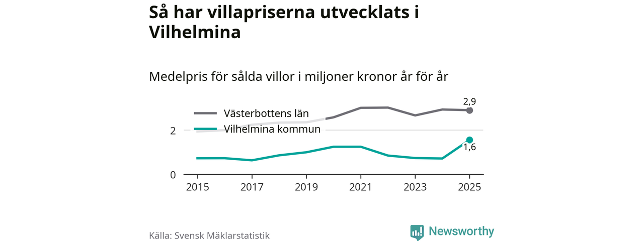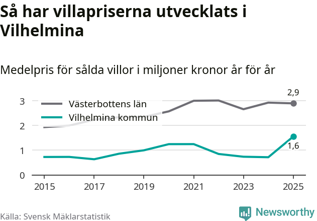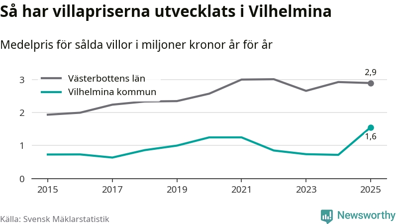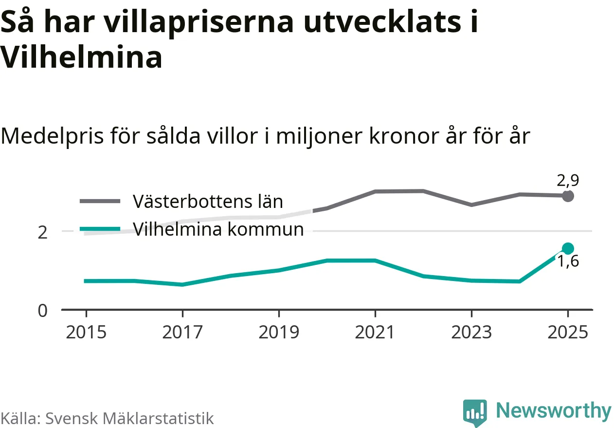 1,6 miljoner kronor är medelpriset för de villor som såldes i Vilhelmina kommun under året, eller 16 958 kronor per kvadratmeter. Det innebär en prisökning med 117 procent på ett år. Det är det högsta årssnittet på åtminstone tio år.