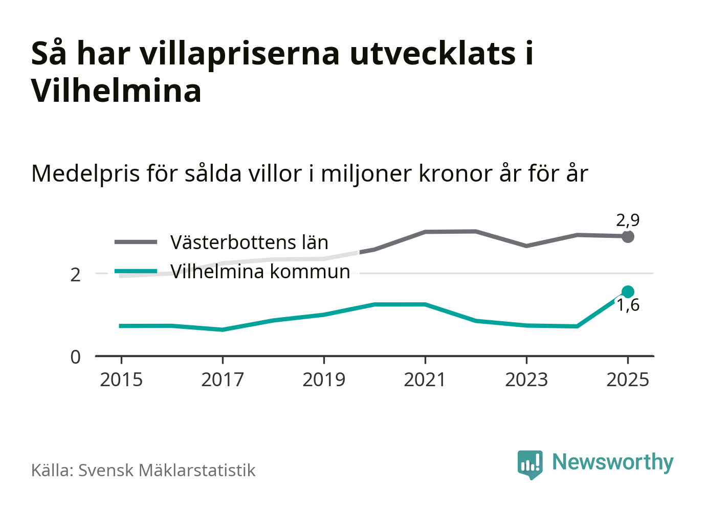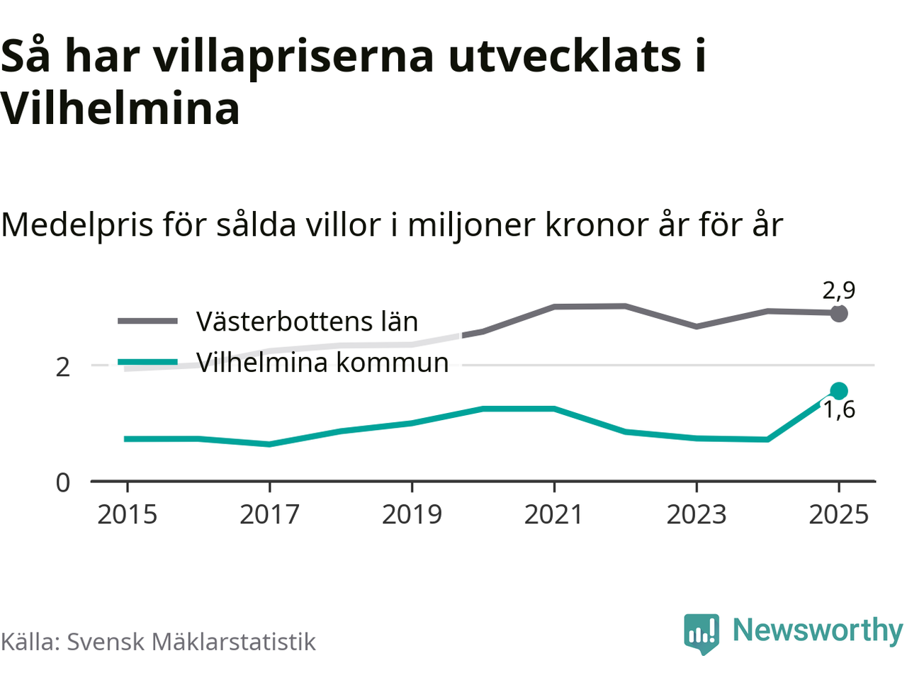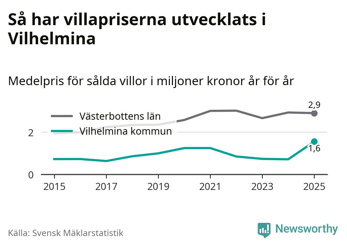 1,6 miljoner kronor är medelpriset för de villor som såldes i Vilhelmina kommun under året, eller 16 958 kronor per kvadratmeter. Det innebär en prisökning med 117 procent på ett år. Det är det högsta årssnittet på åtminstone tio år.