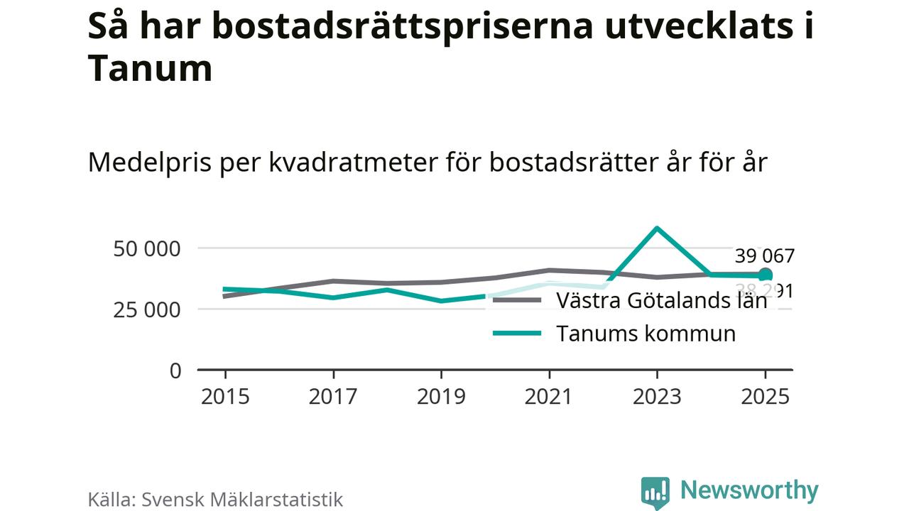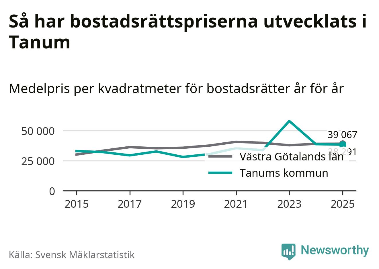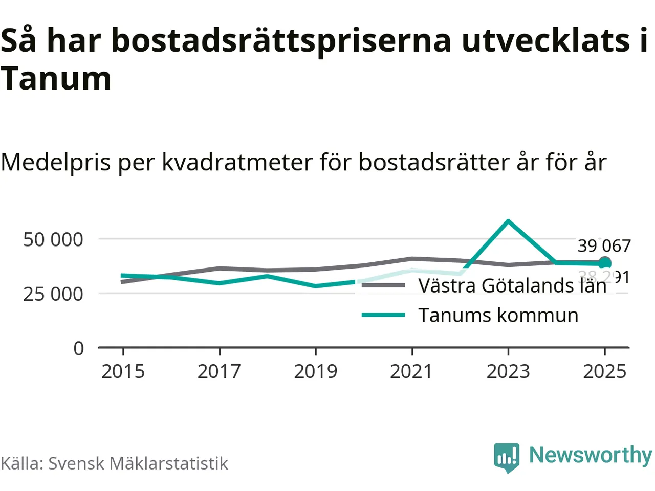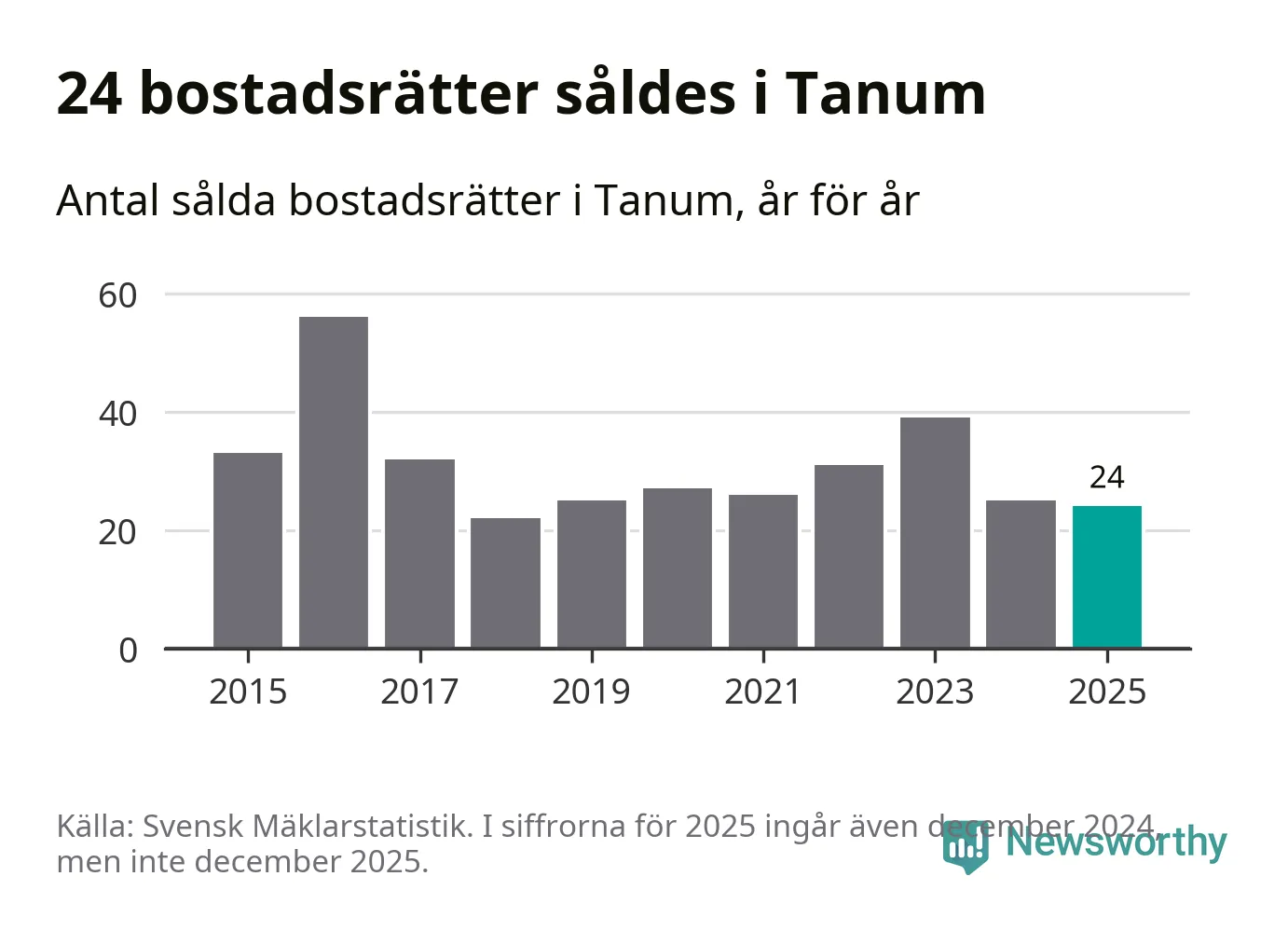 Det såldes totalt 24 bostadsrätter i Tanums kommun under året. Genomsnittspriset per kvadratmeter landade på 38 291 kronor. Det är en minskning med en procent i kommunen på ett år.