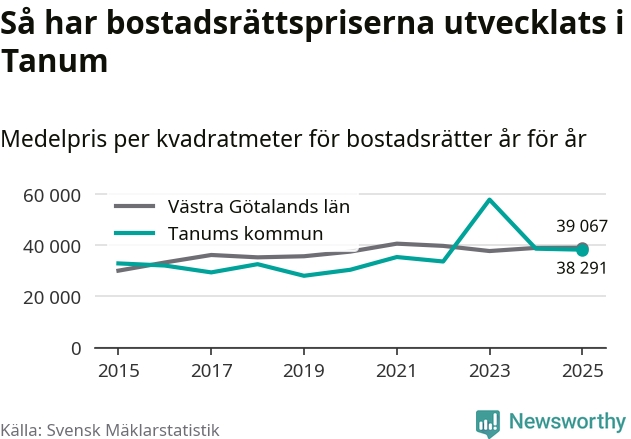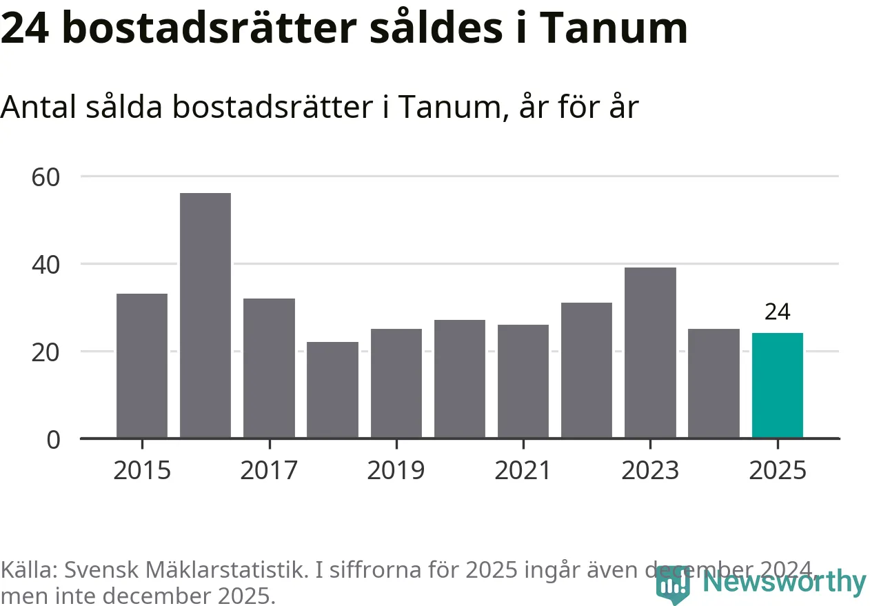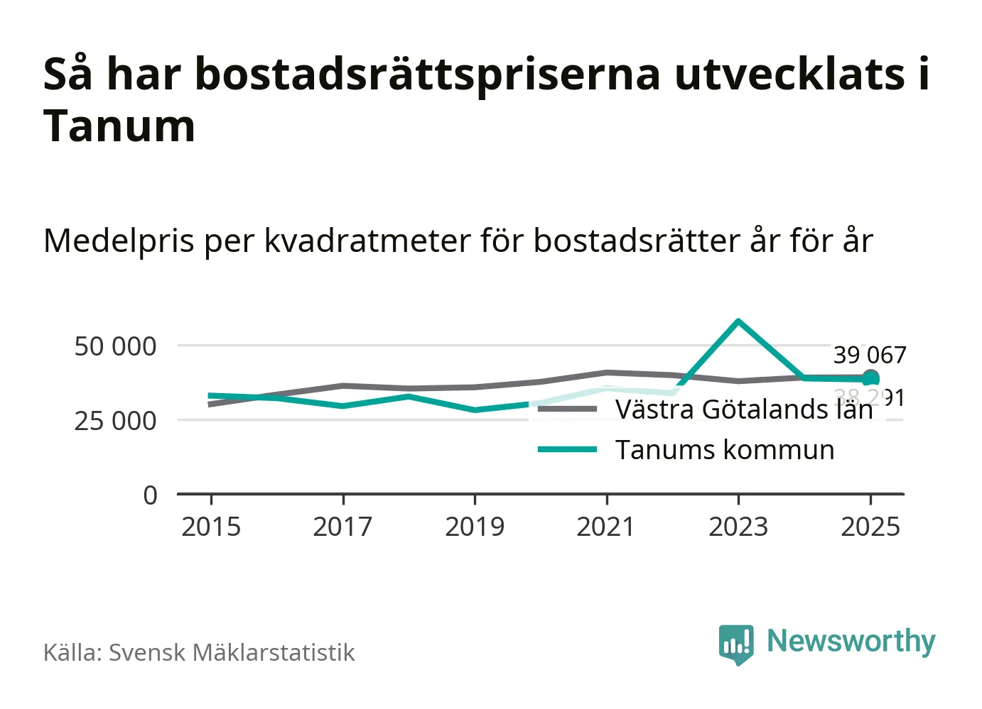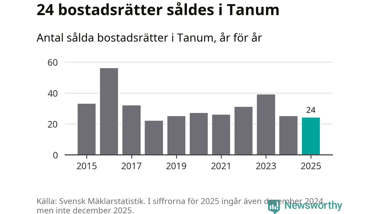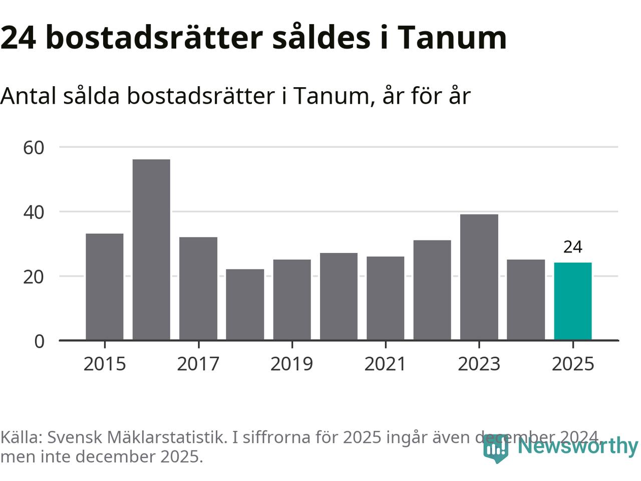 Det såldes totalt 24 bostadsrätter i Tanums kommun under året. Genomsnittspriset per kvadratmeter landade på 38 291 kronor. Det är en minskning med en procent i kommunen på ett år.
