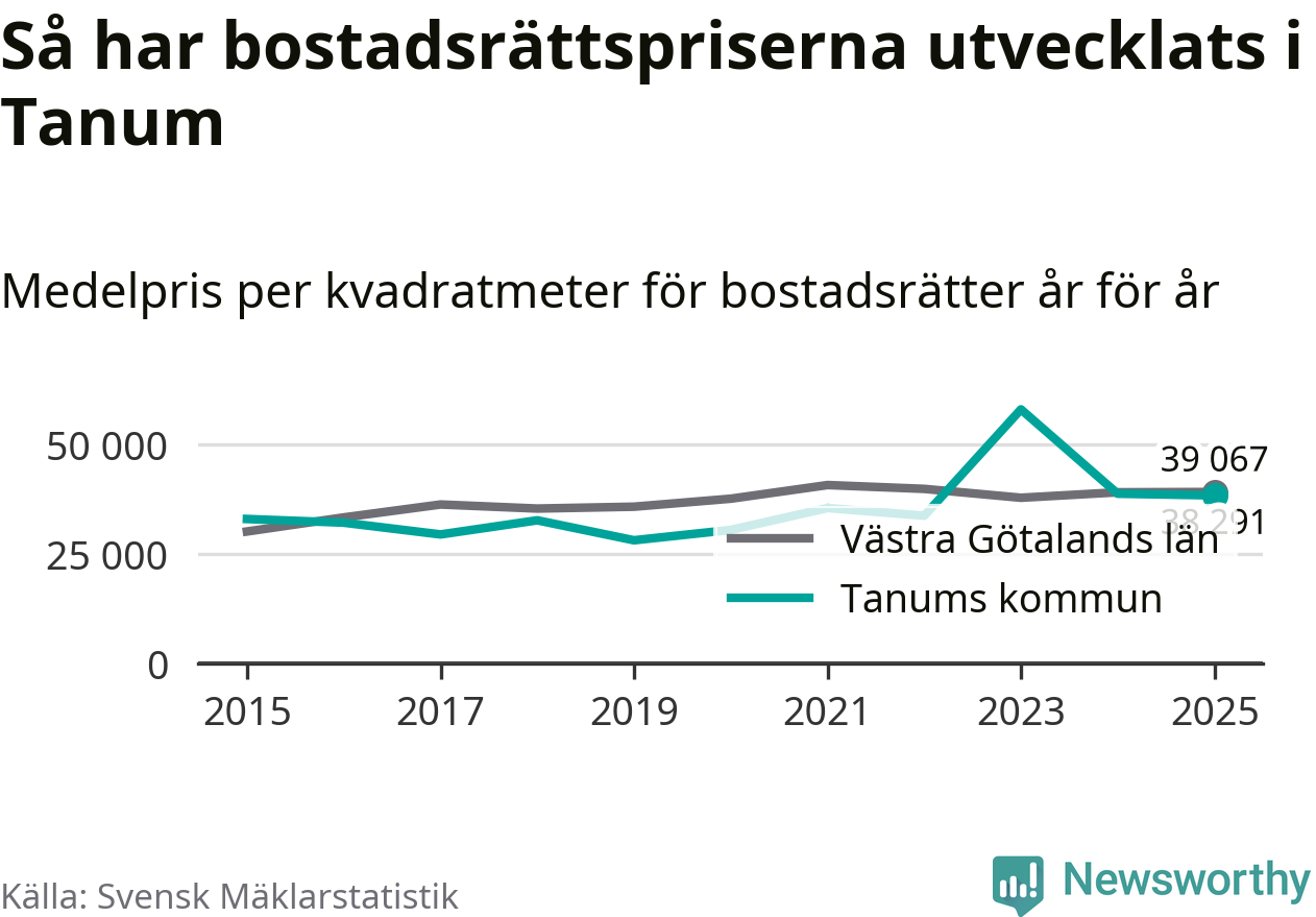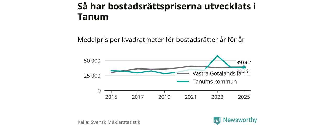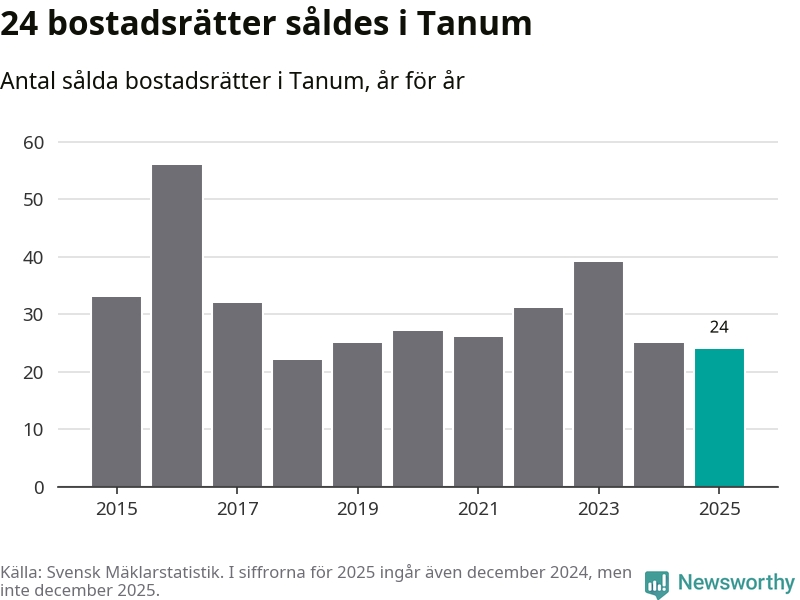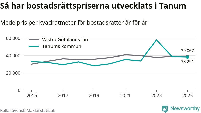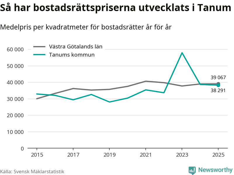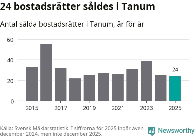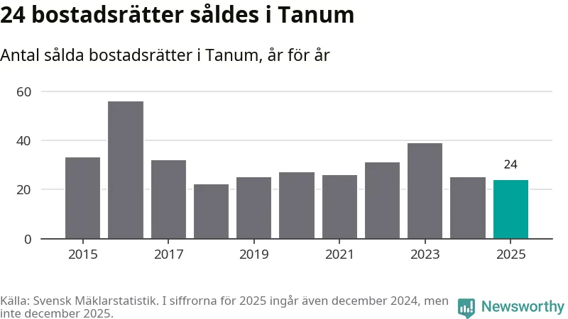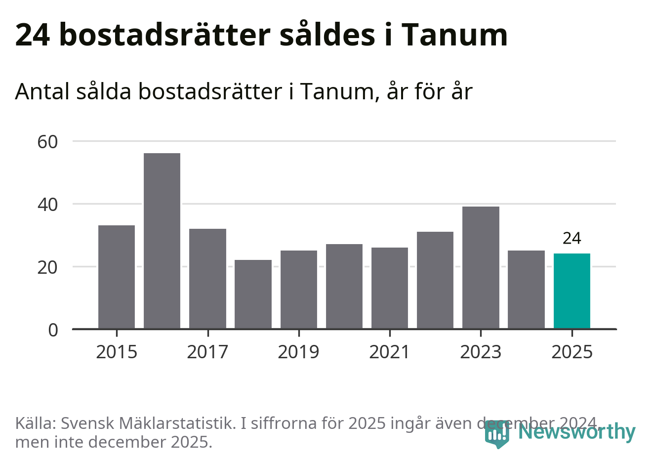 Det såldes totalt 24 bostadsrätter i Tanums kommun under året. Genomsnittspriset per kvadratmeter landade på 38 291 kronor. Det är en minskning med en procent i kommunen på ett år.