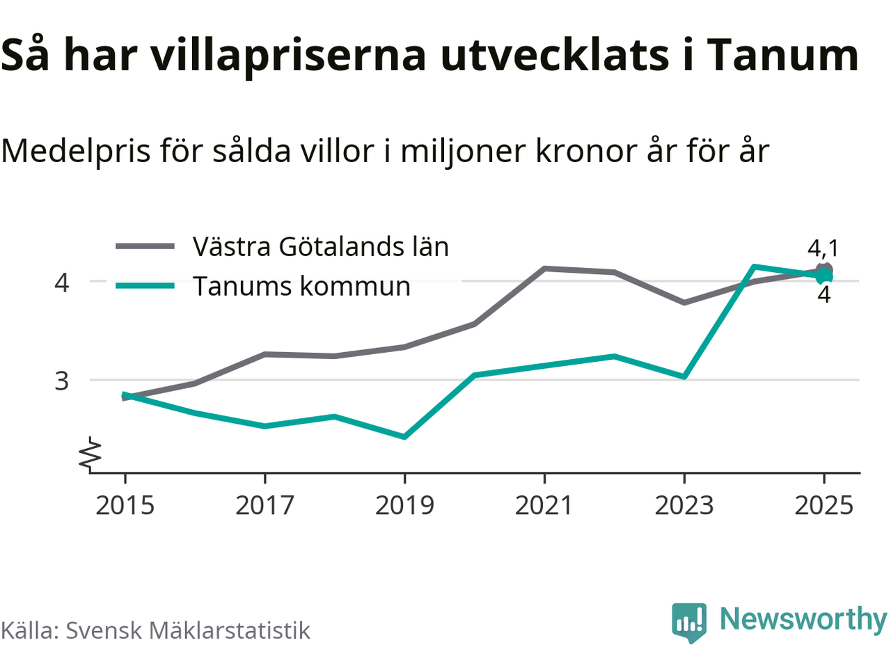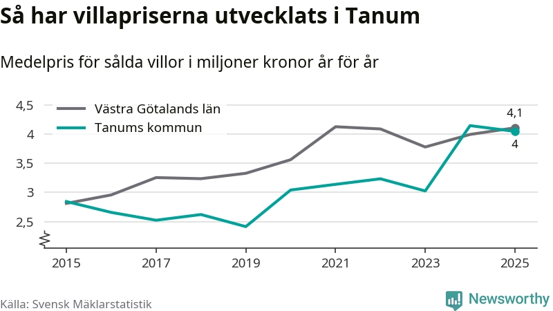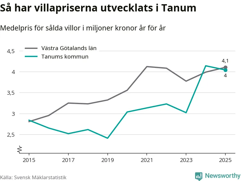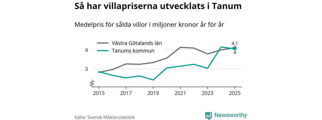 Priserna på villor i Västra Götalands län som helhet har ökat med tre procent sedan förra året. Dock har de inte nått samma nivåer som toppåret i länet 2021.