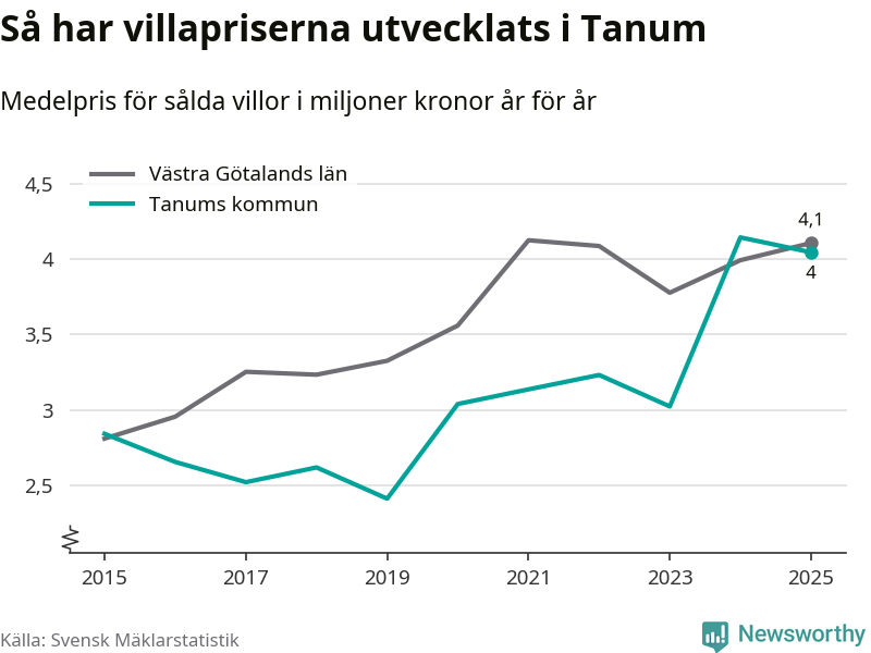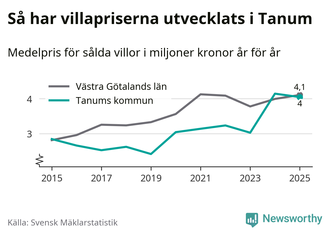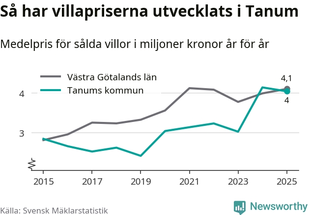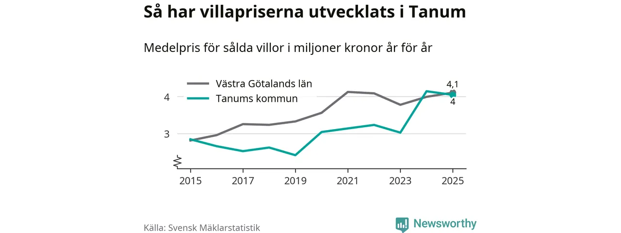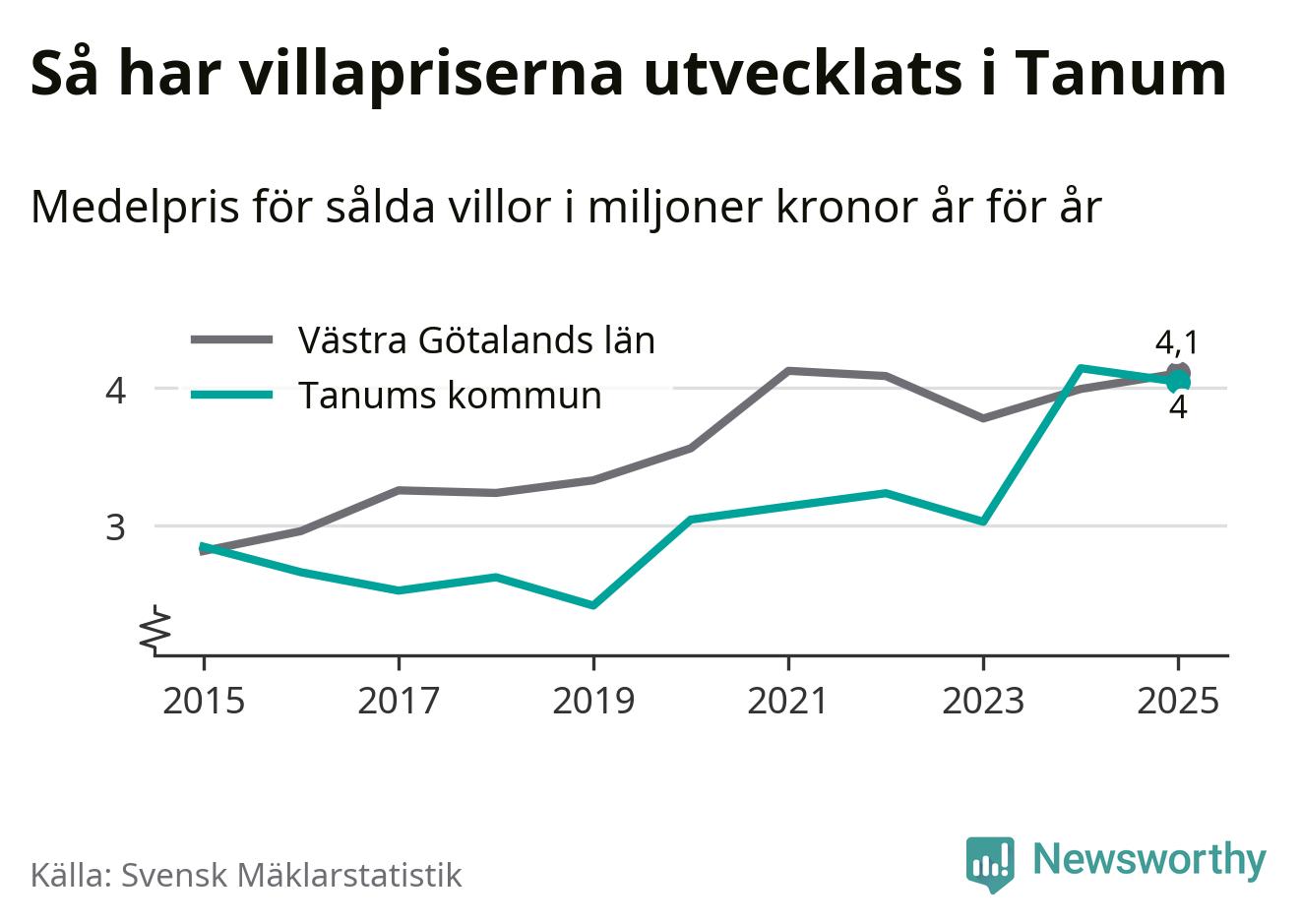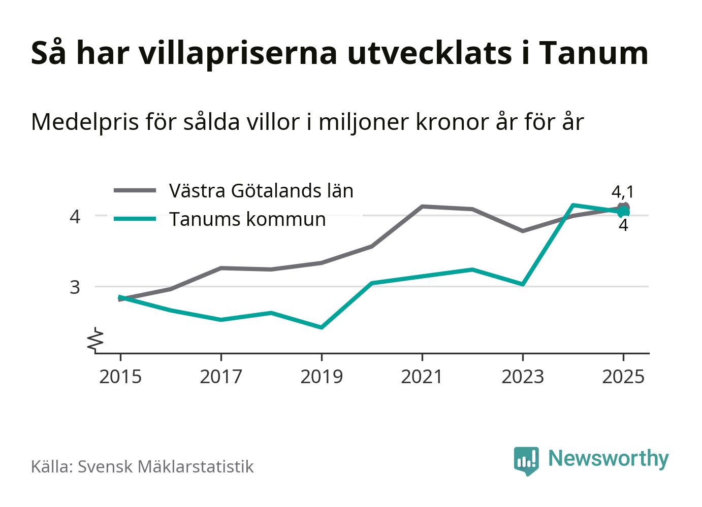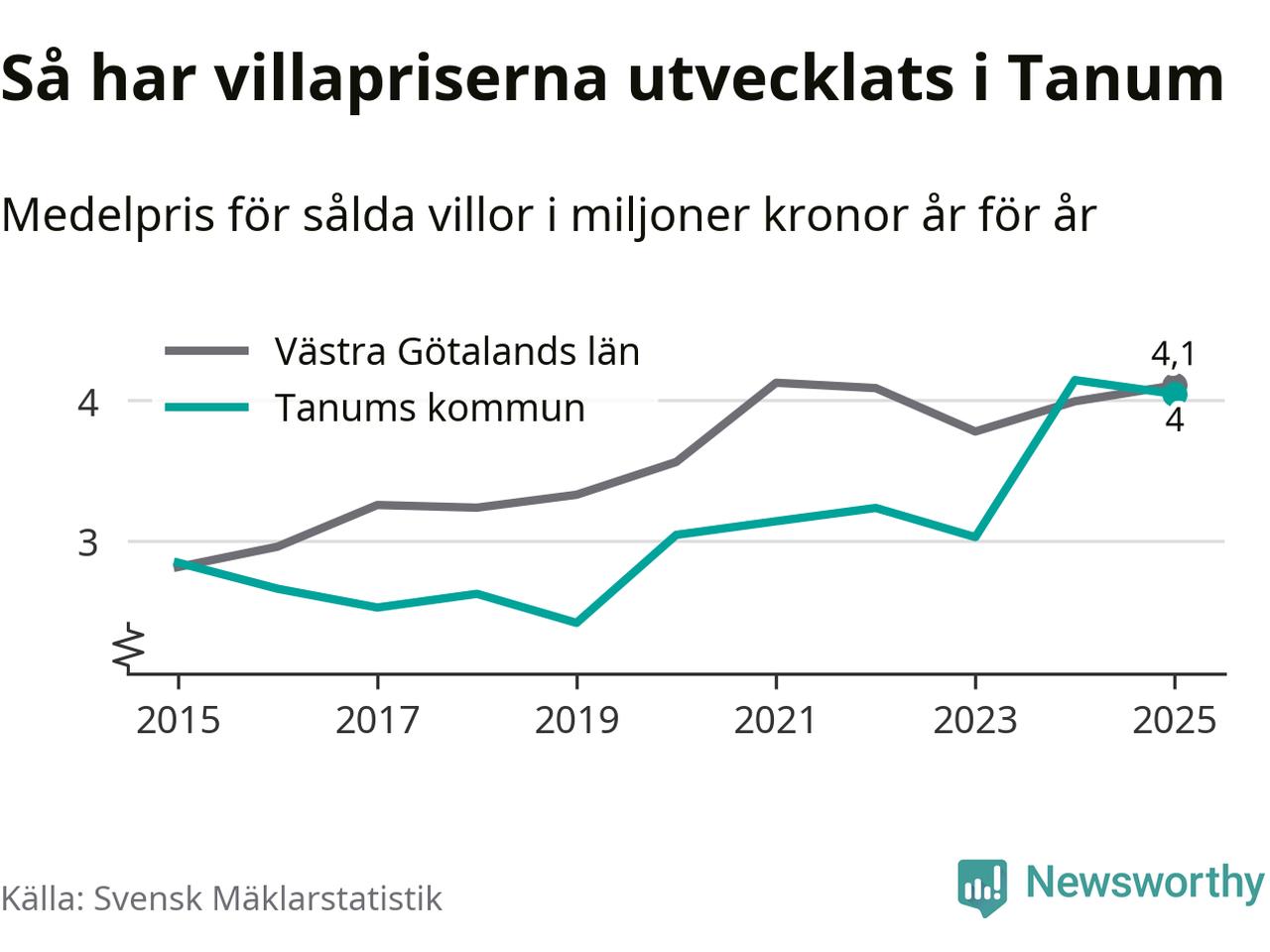 Fyra miljoner kronor är medelpriset för de villor som såldes i Tanums kommun under året, eller 41 834 kronor per kvadratmeter. Det innebär en prisminskning med två procent på ett år.
