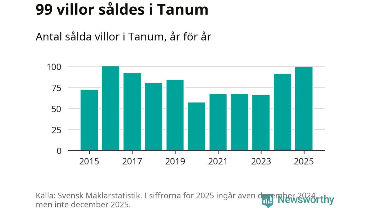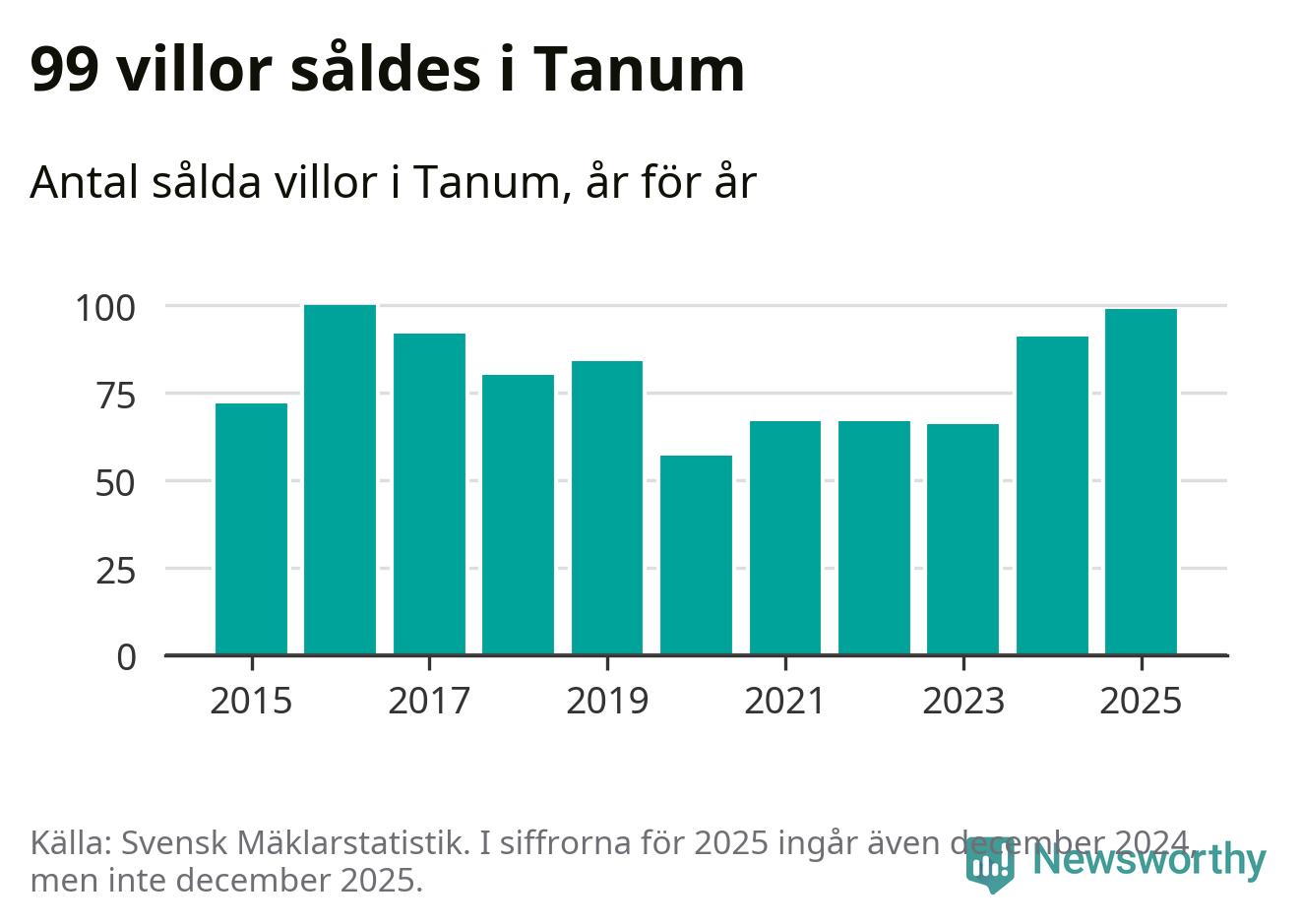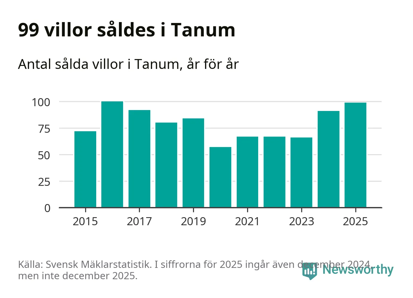 Däremot ökade antalet sålda villor. Totalt såldes 99 villor, att jämföra med 91 under 2024. Det är andra året i rad som antalet sålda villor ökar i kommunen.