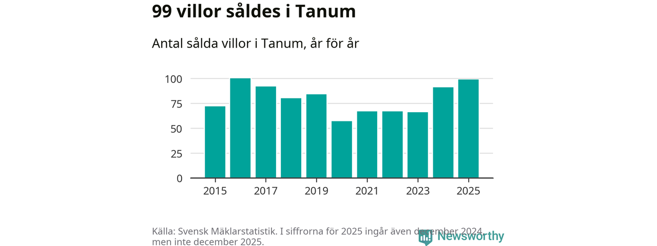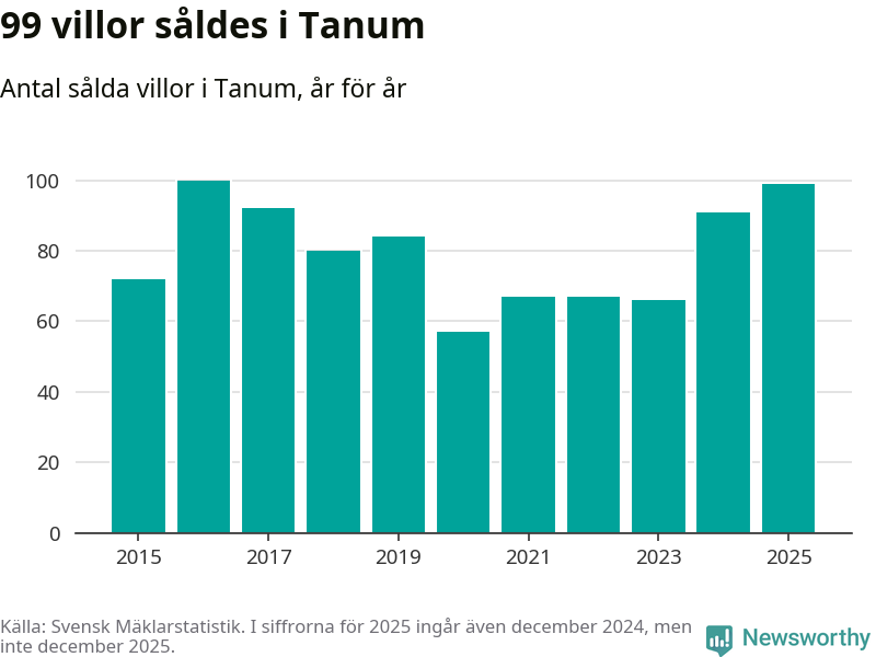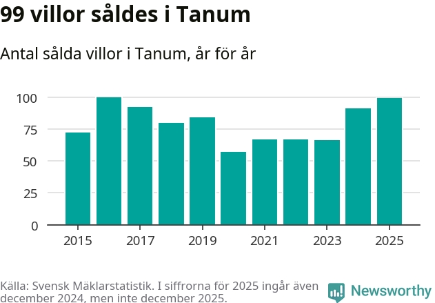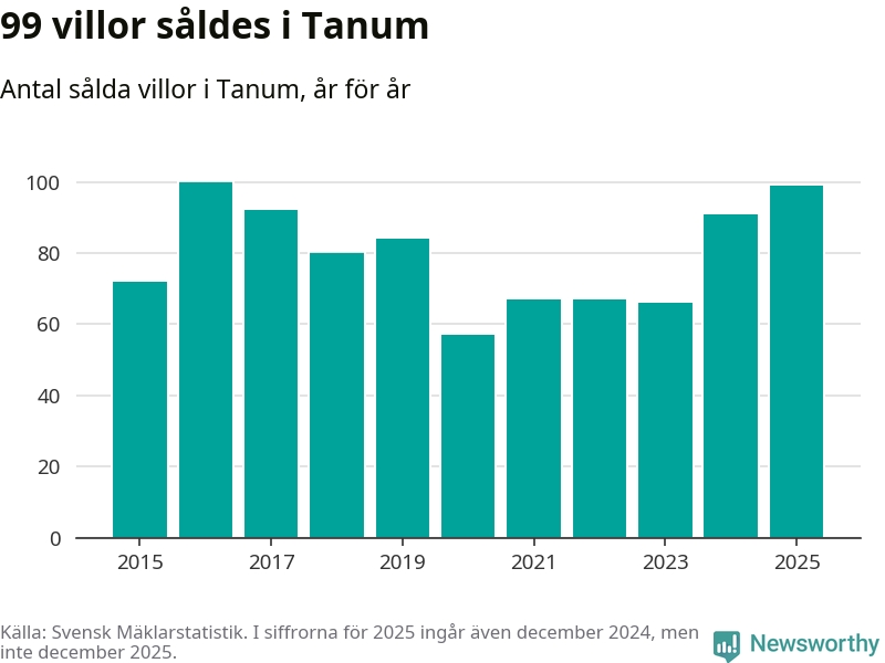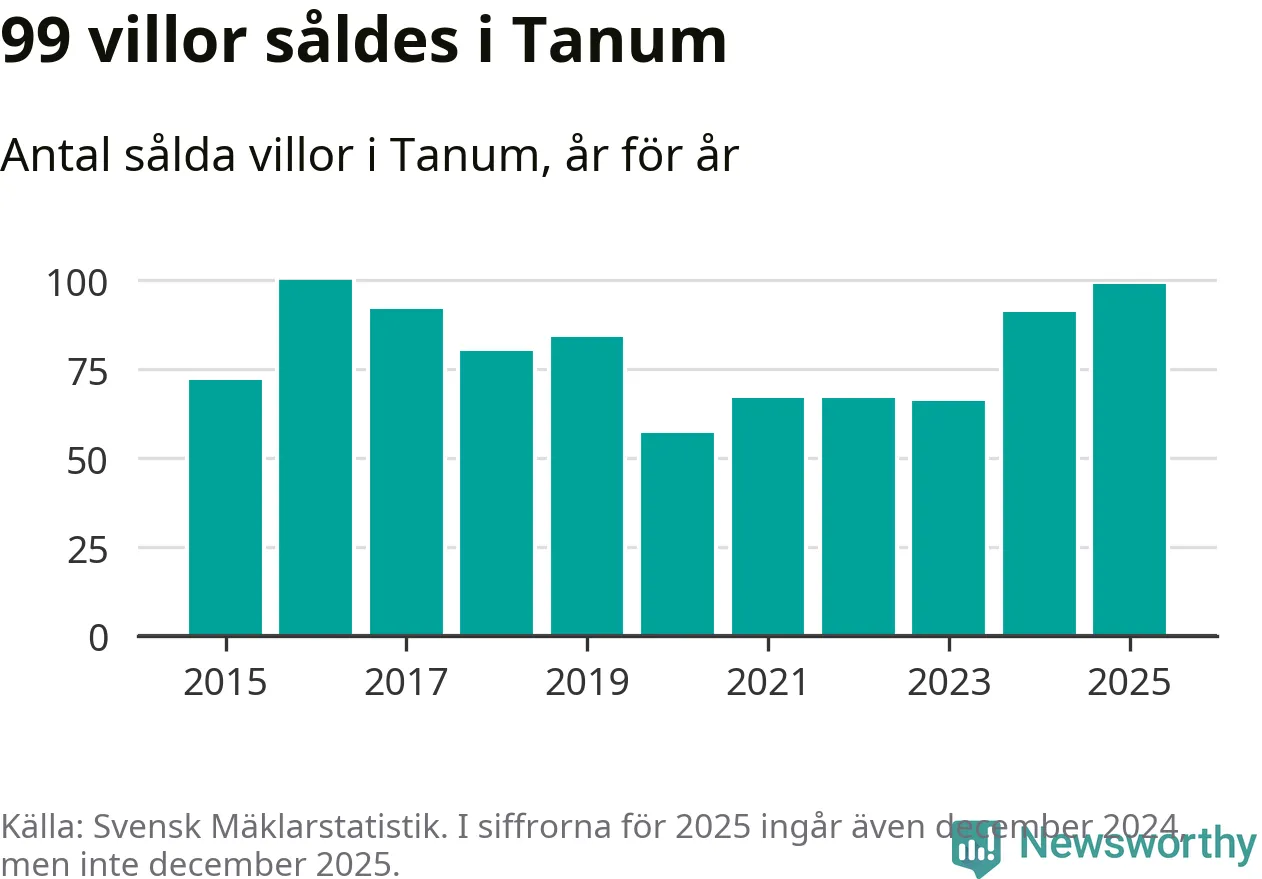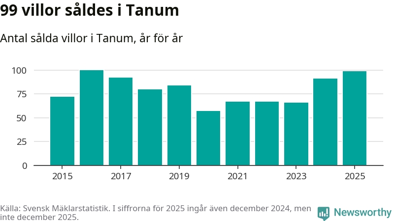 Däremot ökade antalet sålda villor. Totalt såldes 99 villor, att jämföra med 91 under 2024. Det är andra året i rad som antalet sålda villor ökar i kommunen.