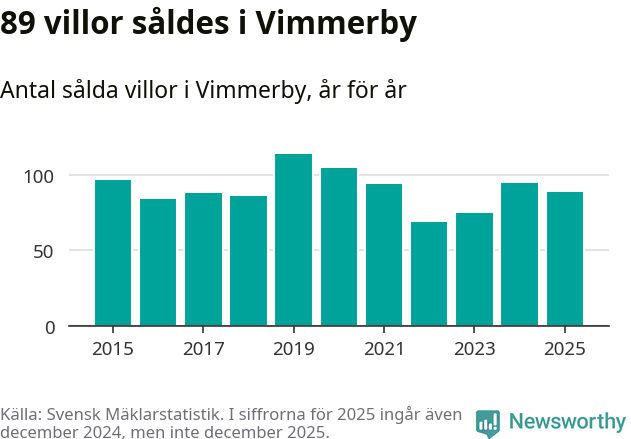 Antalet sålda villor minskade också. Totalt såldes 89 villor, att jämföra med 95 under 2024.